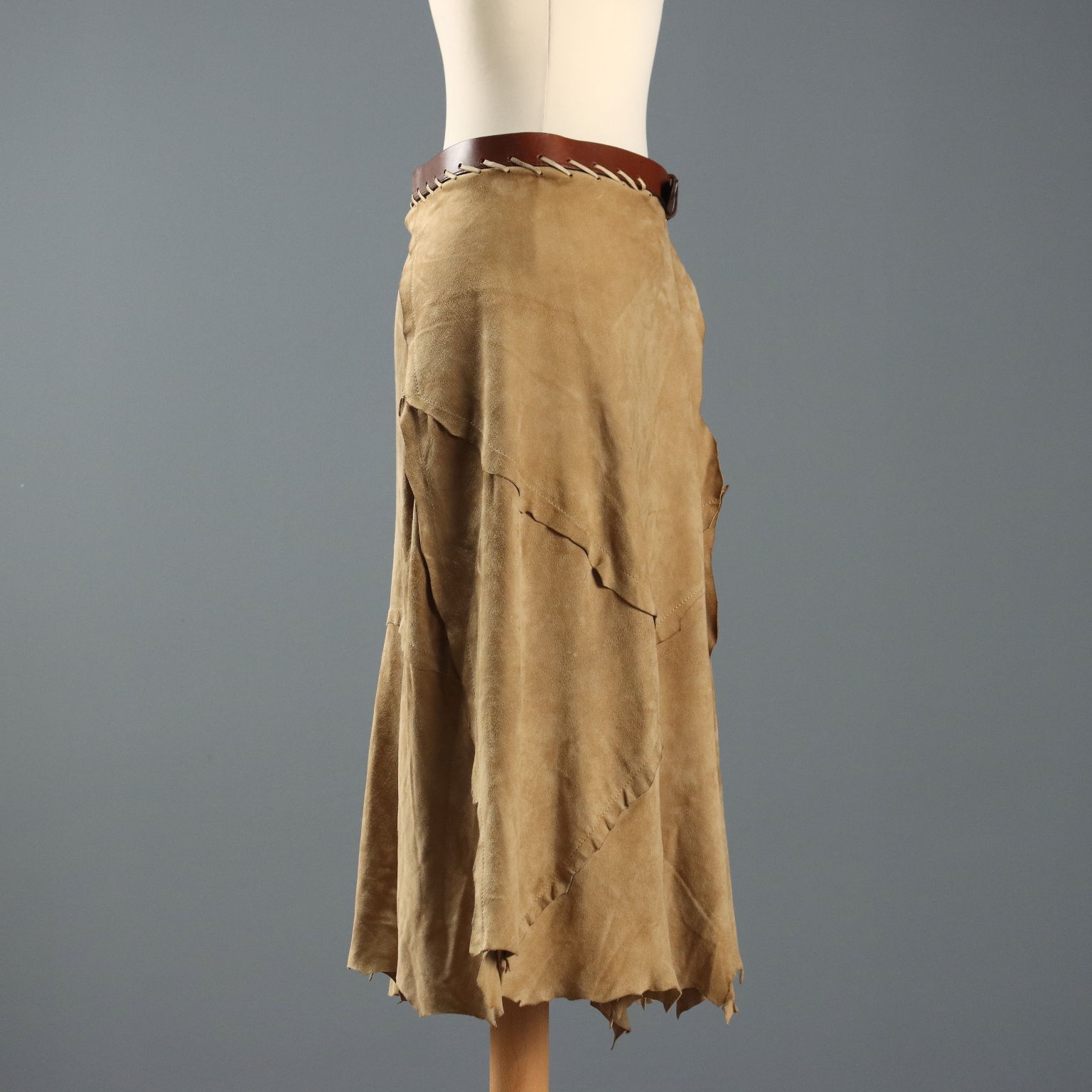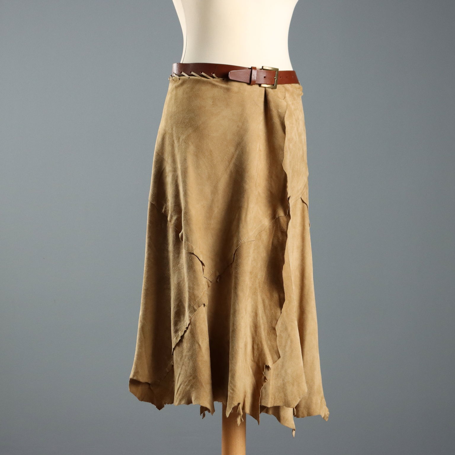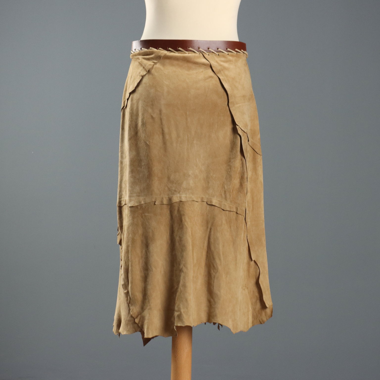 Falda de piel de cabra, con acabado sin rematar y bajo irregular. El cinturón está cosido a la falda. Hecha en Italia. Ancho (medido a la cintura): 37 cm. Largo: 71 a 79 cm. La piel presenta ligeras imperfecciones.