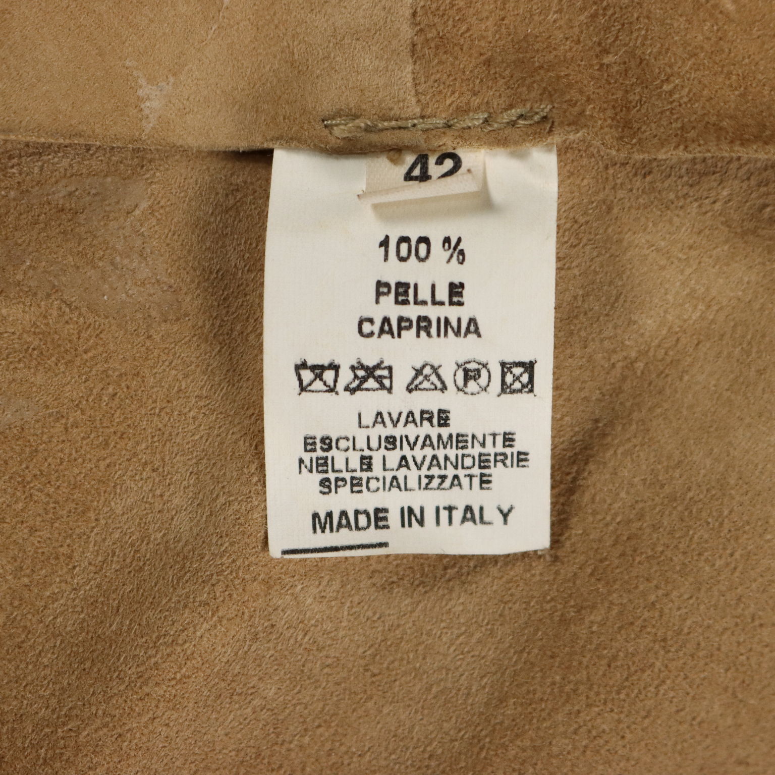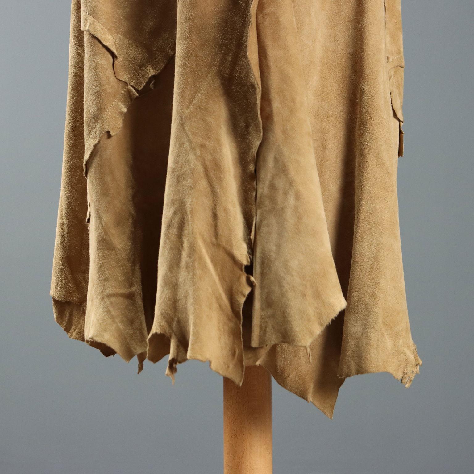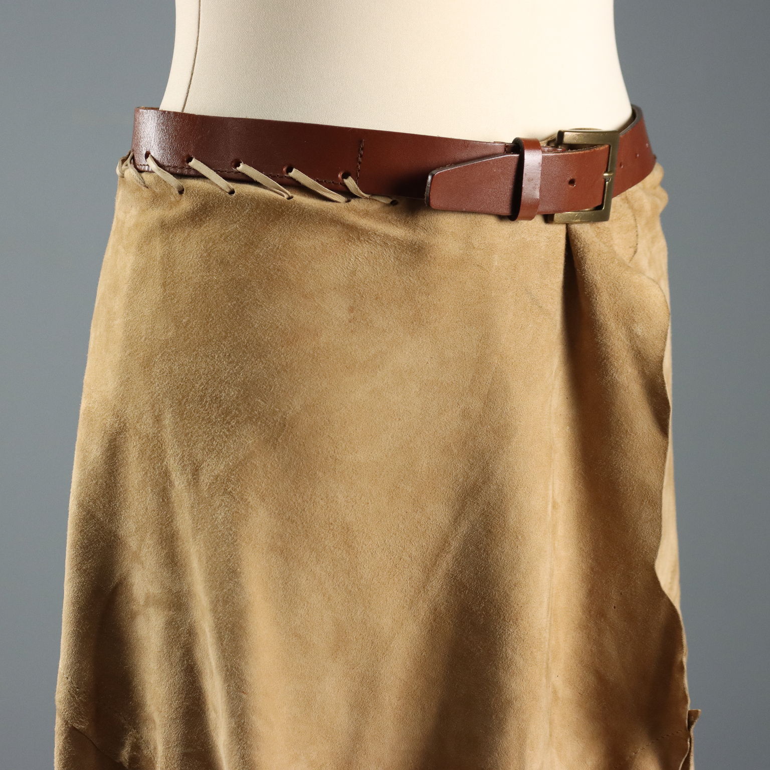 Falda de piel de cabra, con acabado sin rematar y bajo irregular. El cinturón está cosido a la falda. Hecha en Italia. Ancho (medido a la cintura): 37 cm. Largo: 71 a 79 cm. La piel presenta ligeras imperfecciones.