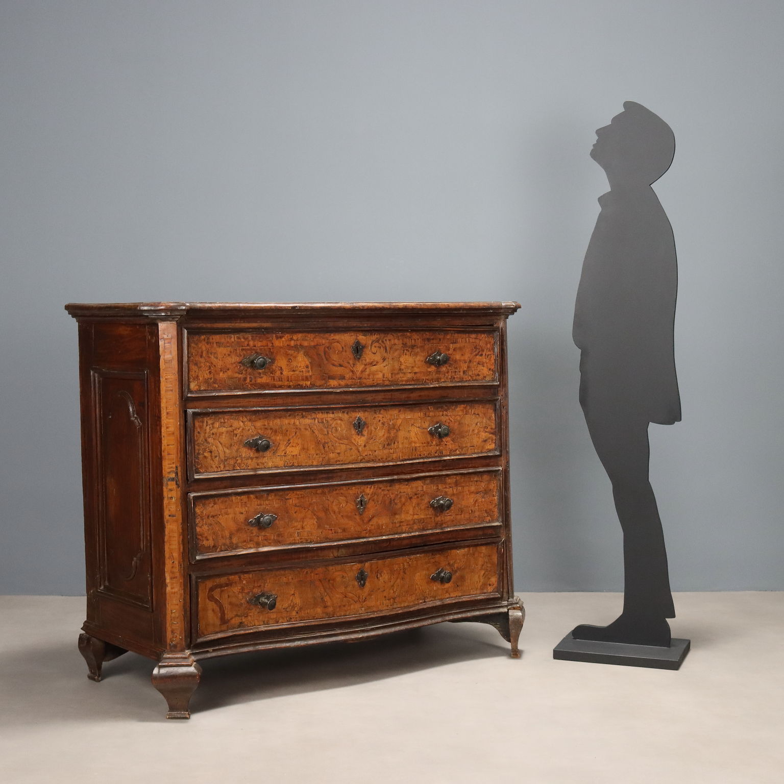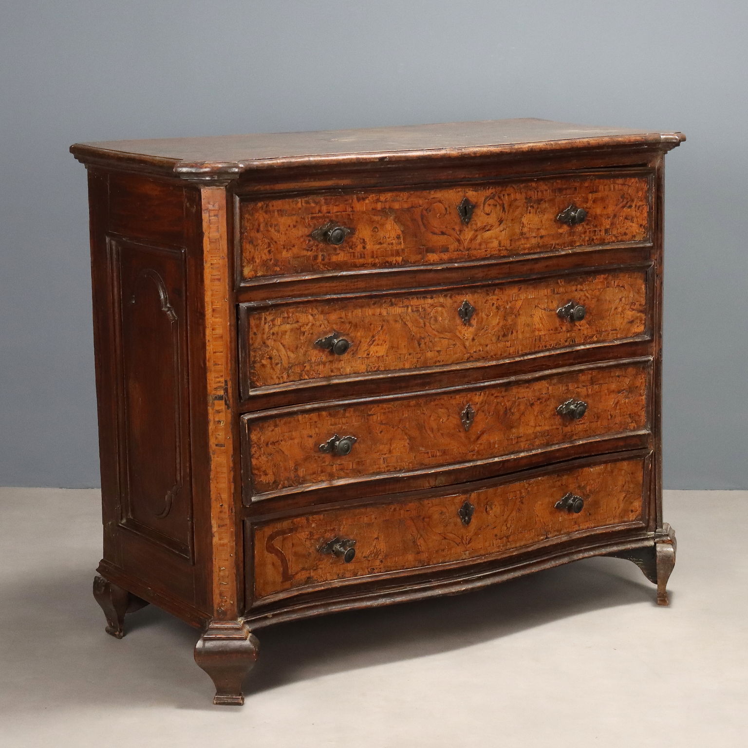 Cómoda barroca de nogal. El frente curvo presenta cuatro cajones con filetes de arce y algarrobo que se extienden hasta los montantes en un ángulo de cuarenta y cinco grados. Molduras ebonizadas y patas salientes, interior de álamo, bocallaves y tiradores de bronce. Lombardía, principios del siglo XVIII.