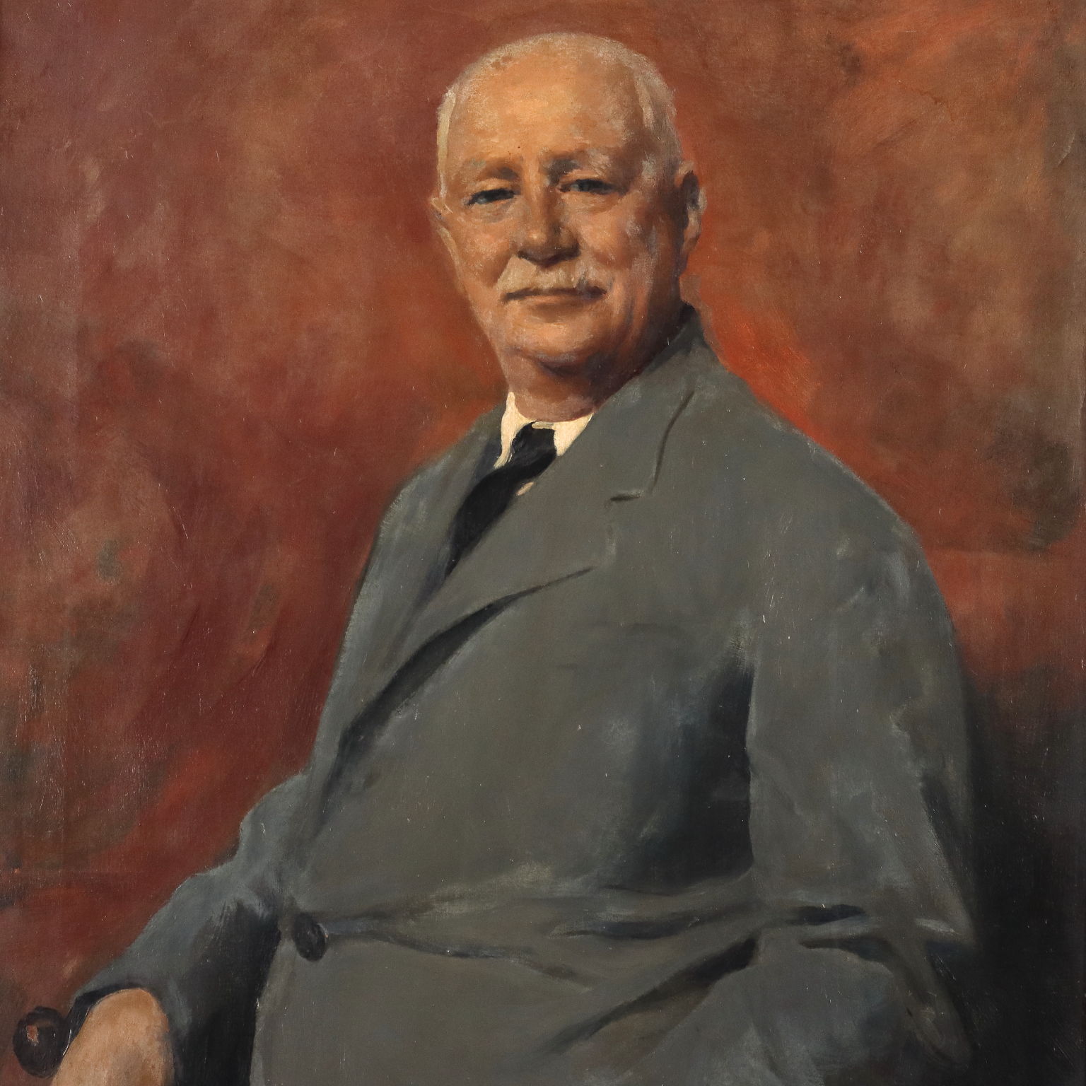 Óleo sobre lienzo. Firma desconocida en el ángulo inferior izquierdo. Retrato de un hombre elegante y digno, sonriente pero sereno y severo. Presentado en un marco contemporáneo.