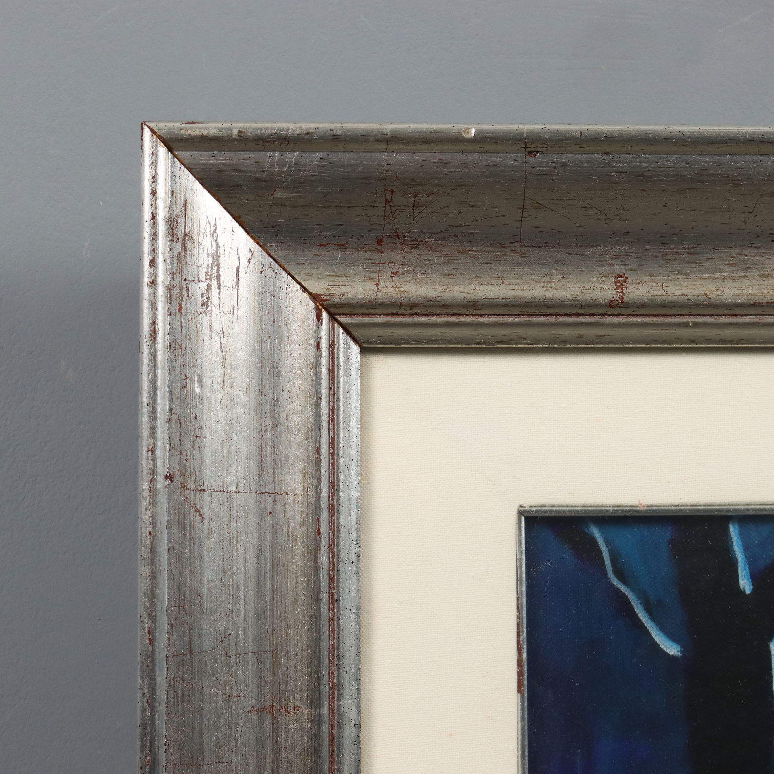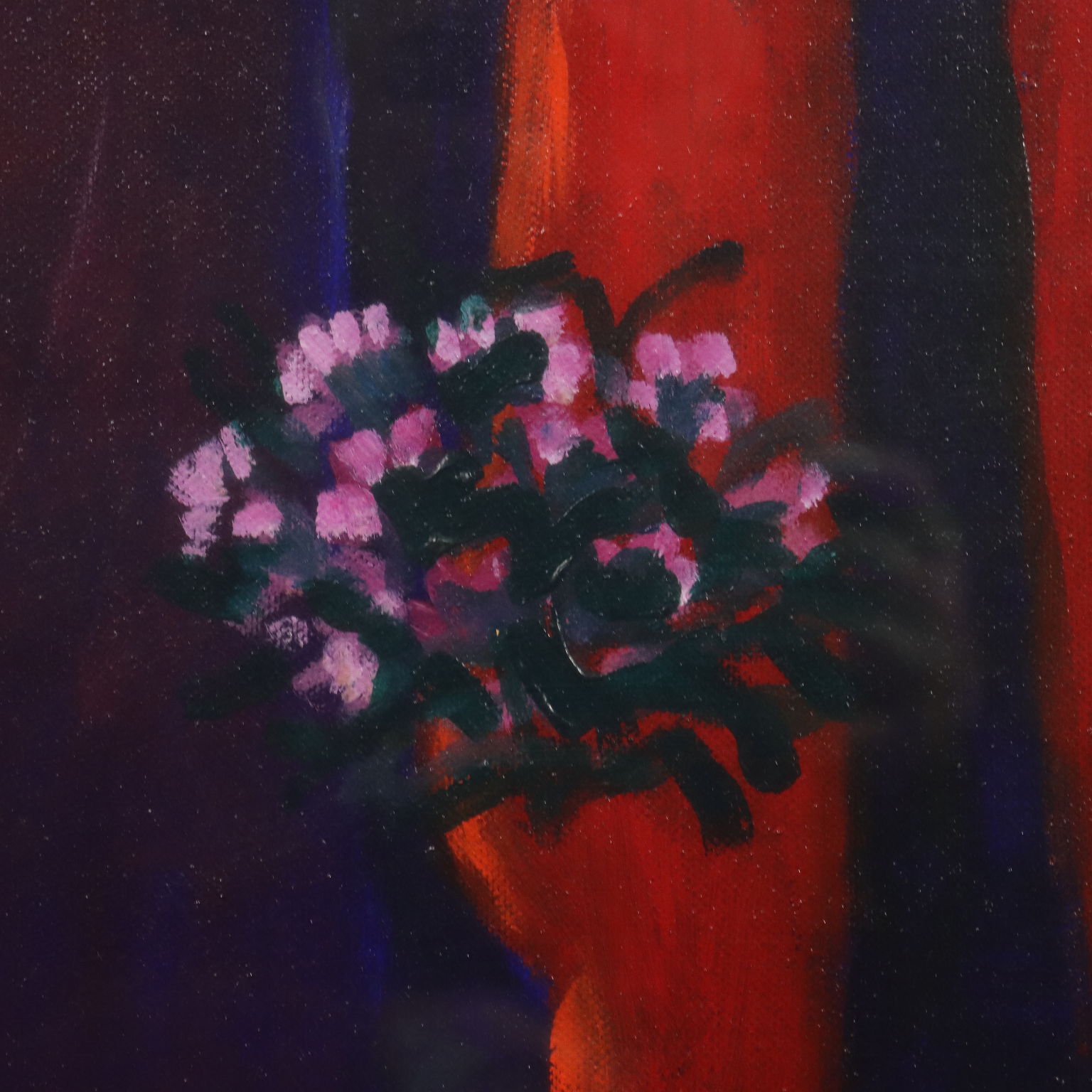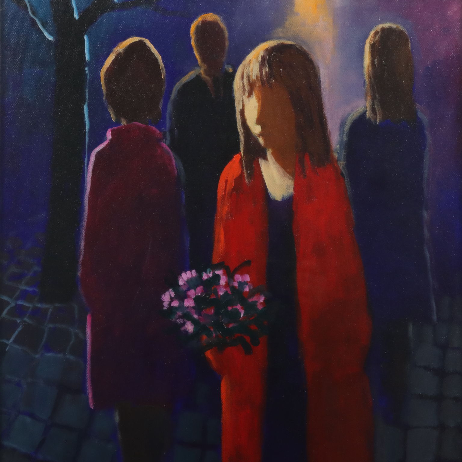 Óleo sobre lienzo. Firmado en el ángulo inferior izquierdo. En el reverso figura una declaración de autenticidad firmada. Influenciado por el expresionismo durante su estancia en París, Fantuzzi puso un fuerte énfasis en la expresión de emociones y estados de ánimo en sus obras. El color domina sus lienzos, generalmente en tonos fríos de azul, verde y púrpura, creando contrastes a veces intensos. Los temas principales de Fantuzzi son la soledad de la metrópolis y la dificultad de la comunicación en las relaciones interpersonales; a menudo pinta figuras poco definidas y rostros sin ojos. Enmarcado.