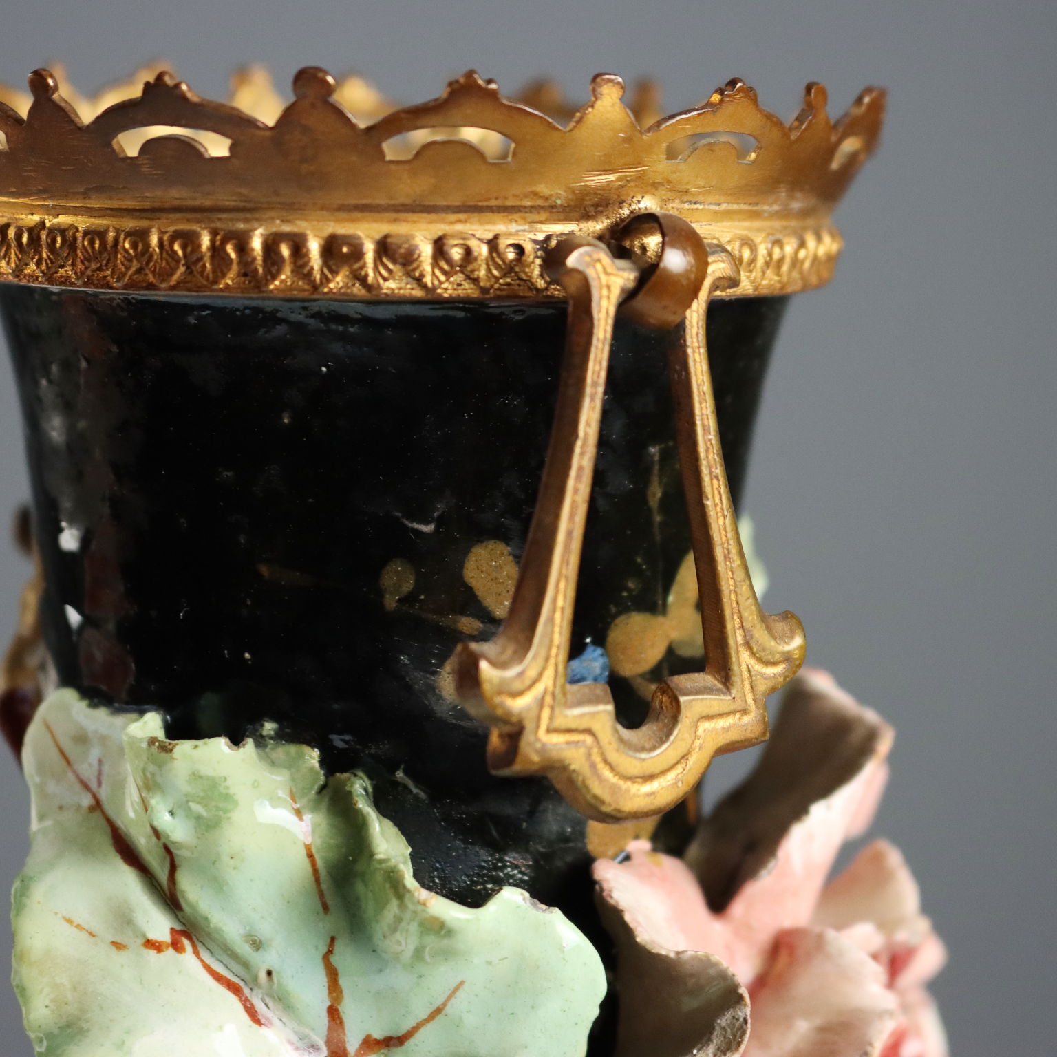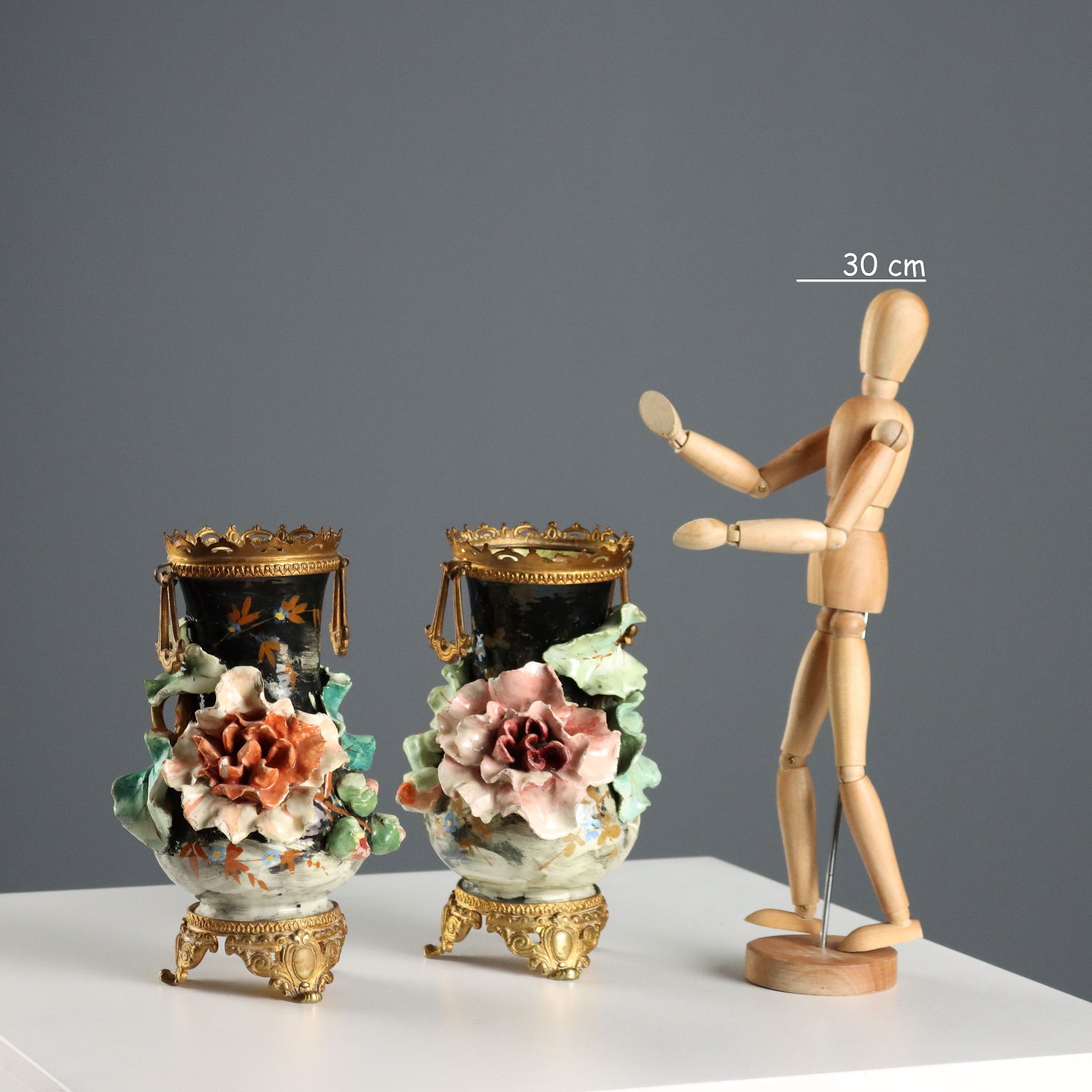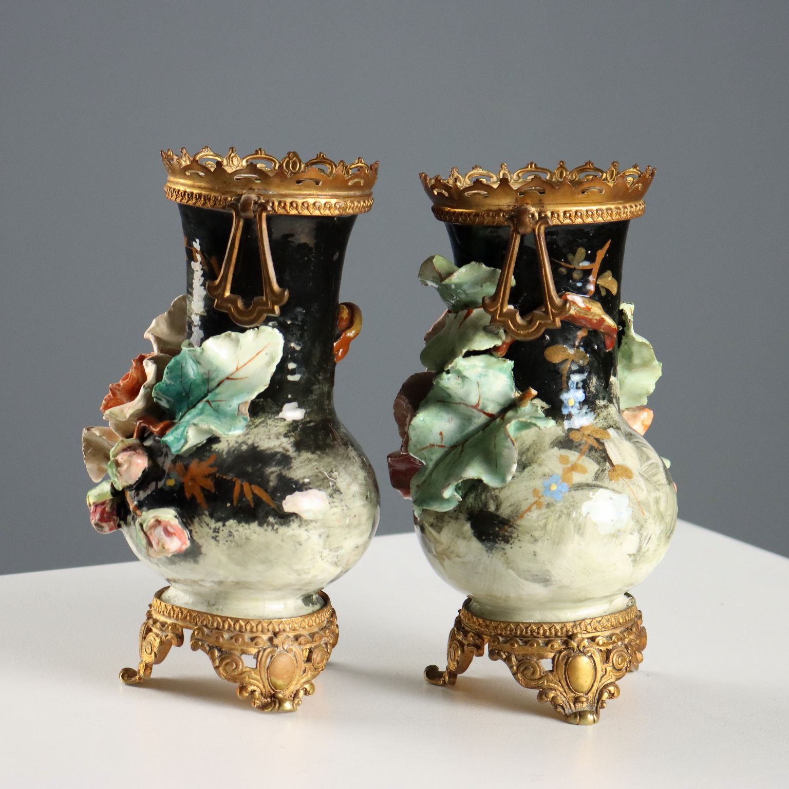 Par de jarrones de cerámica barbotina decorados en policromía con una rama florida. Base y anillo de bronce dorado. Marca de fabricante no identificada estampada bajo la base.