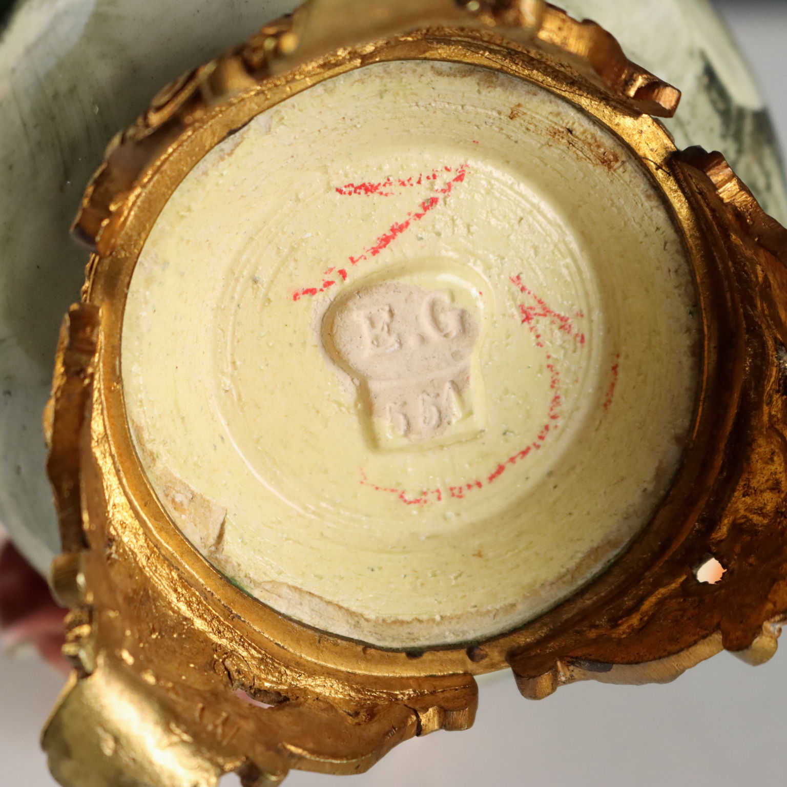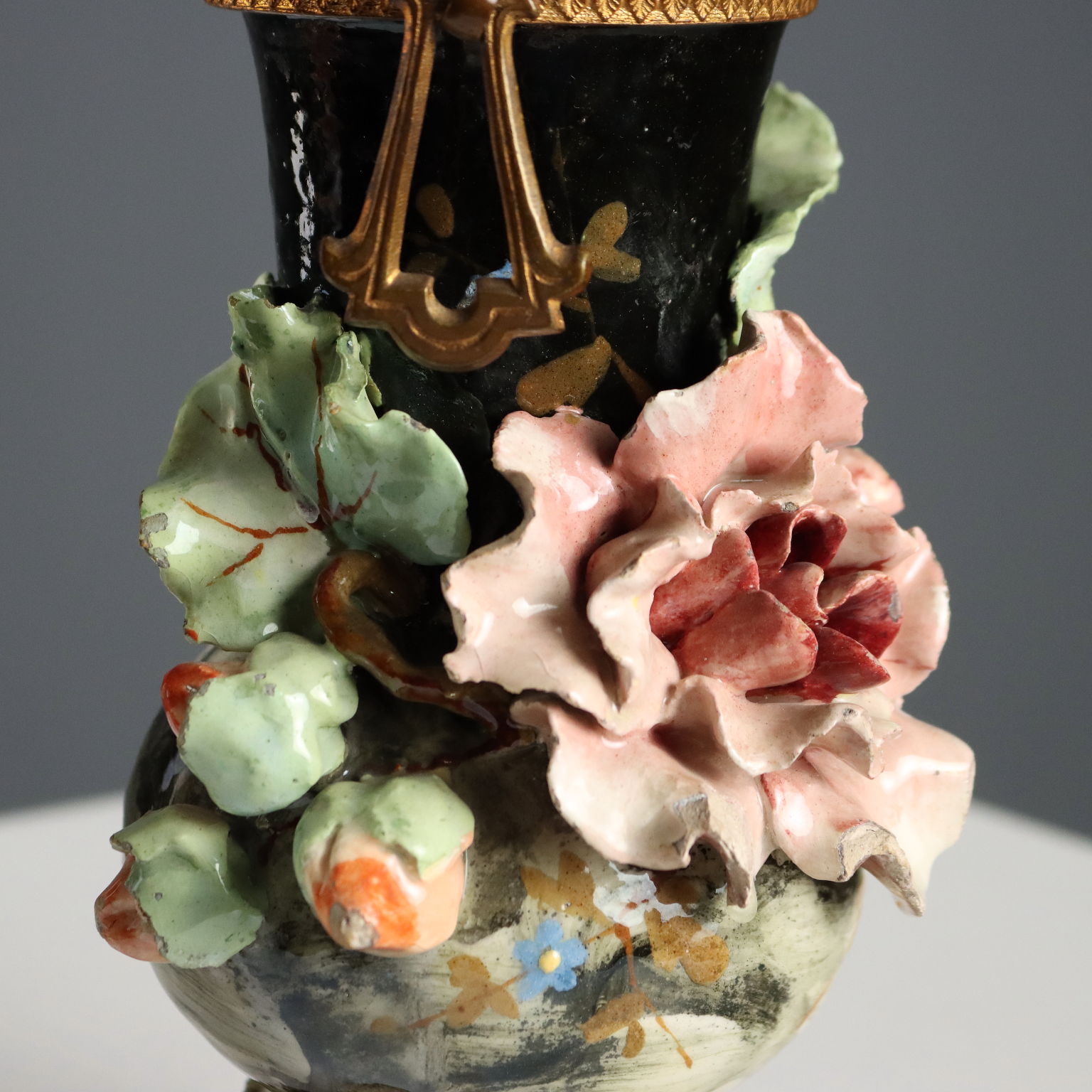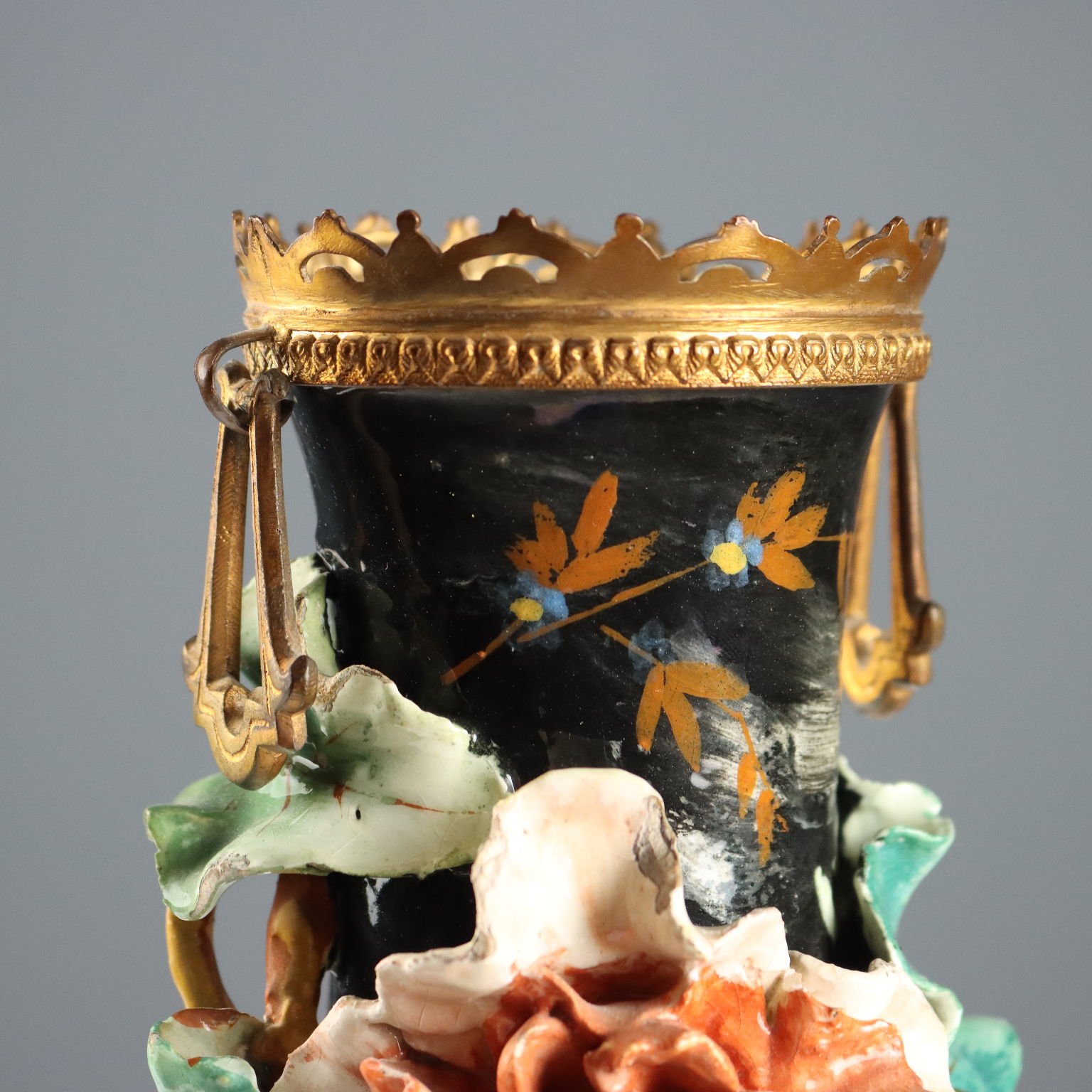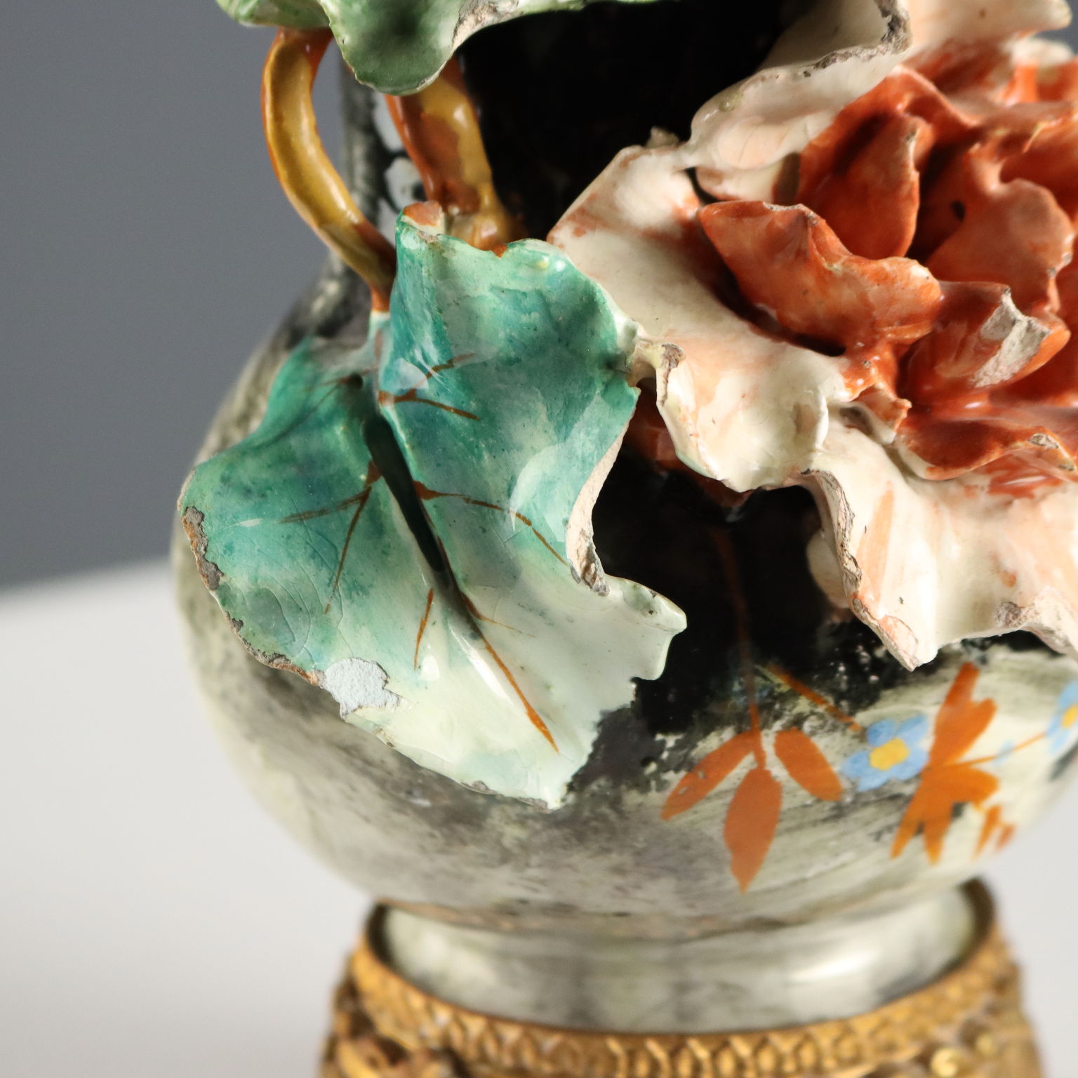 Par de jarrones de cerámica barbotina decorados en policromía con una rama florida. Base y anillo de bronce dorado. Marca de fabricante no identificada estampada bajo la base.