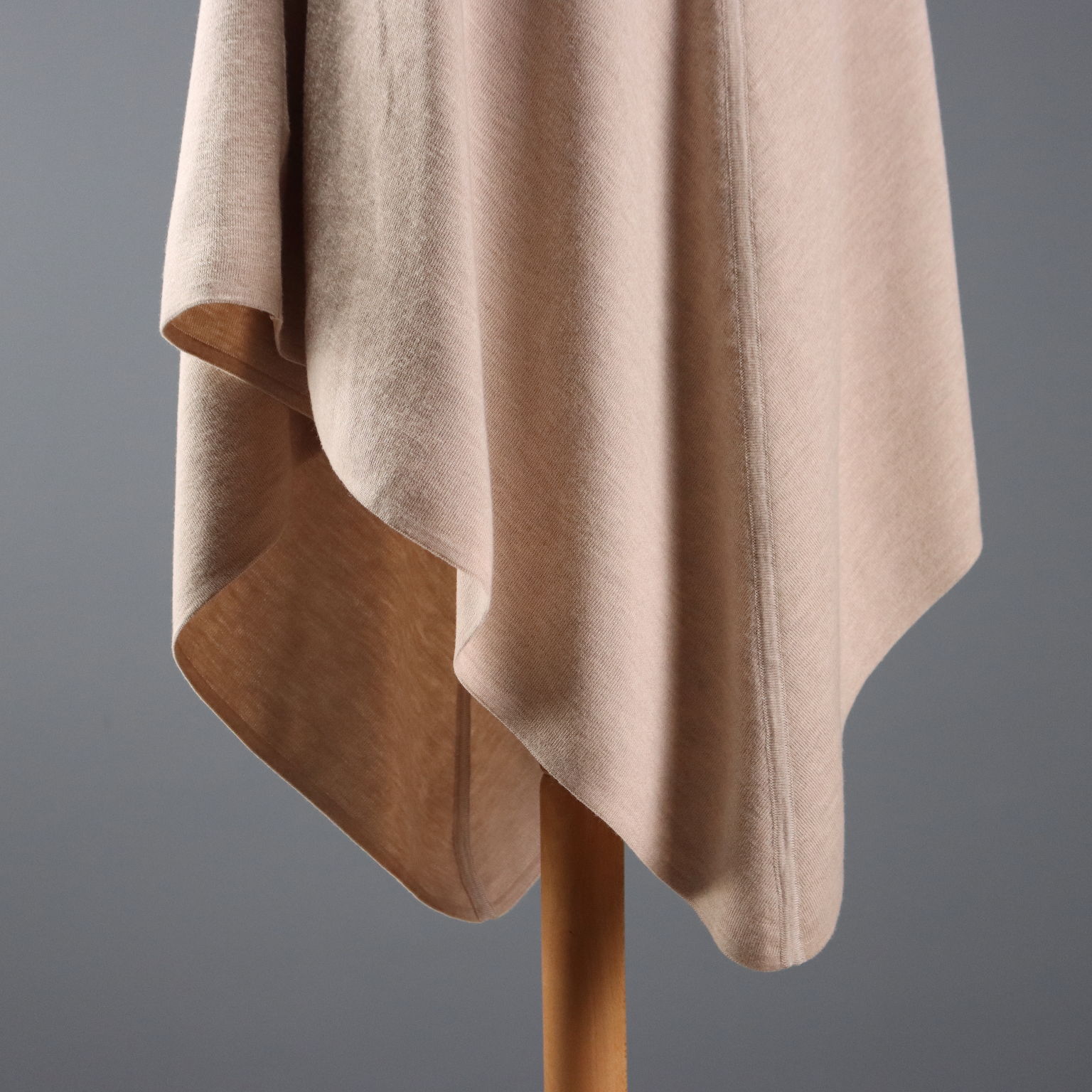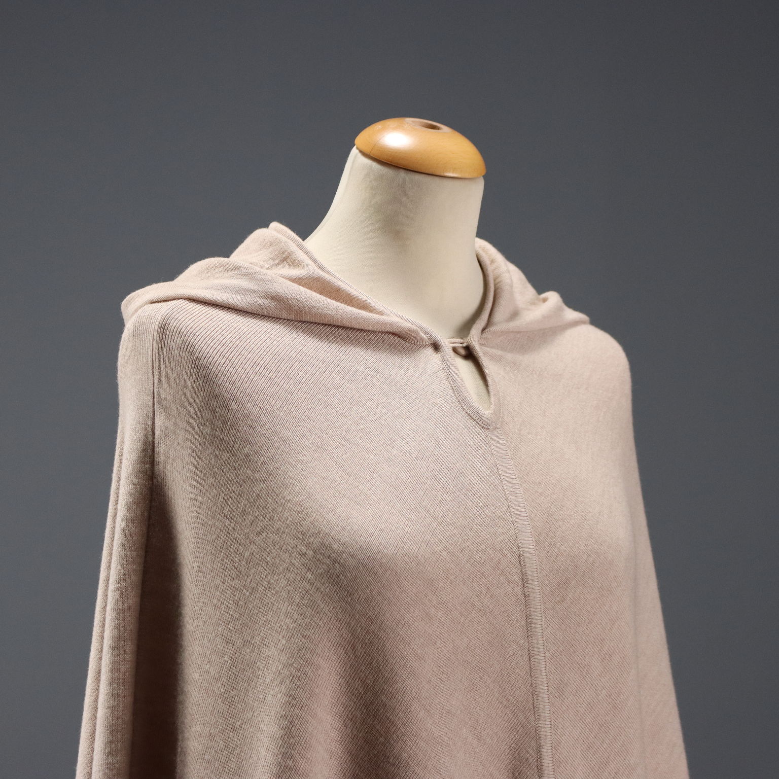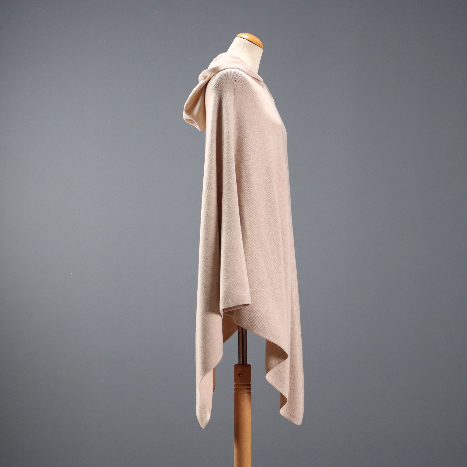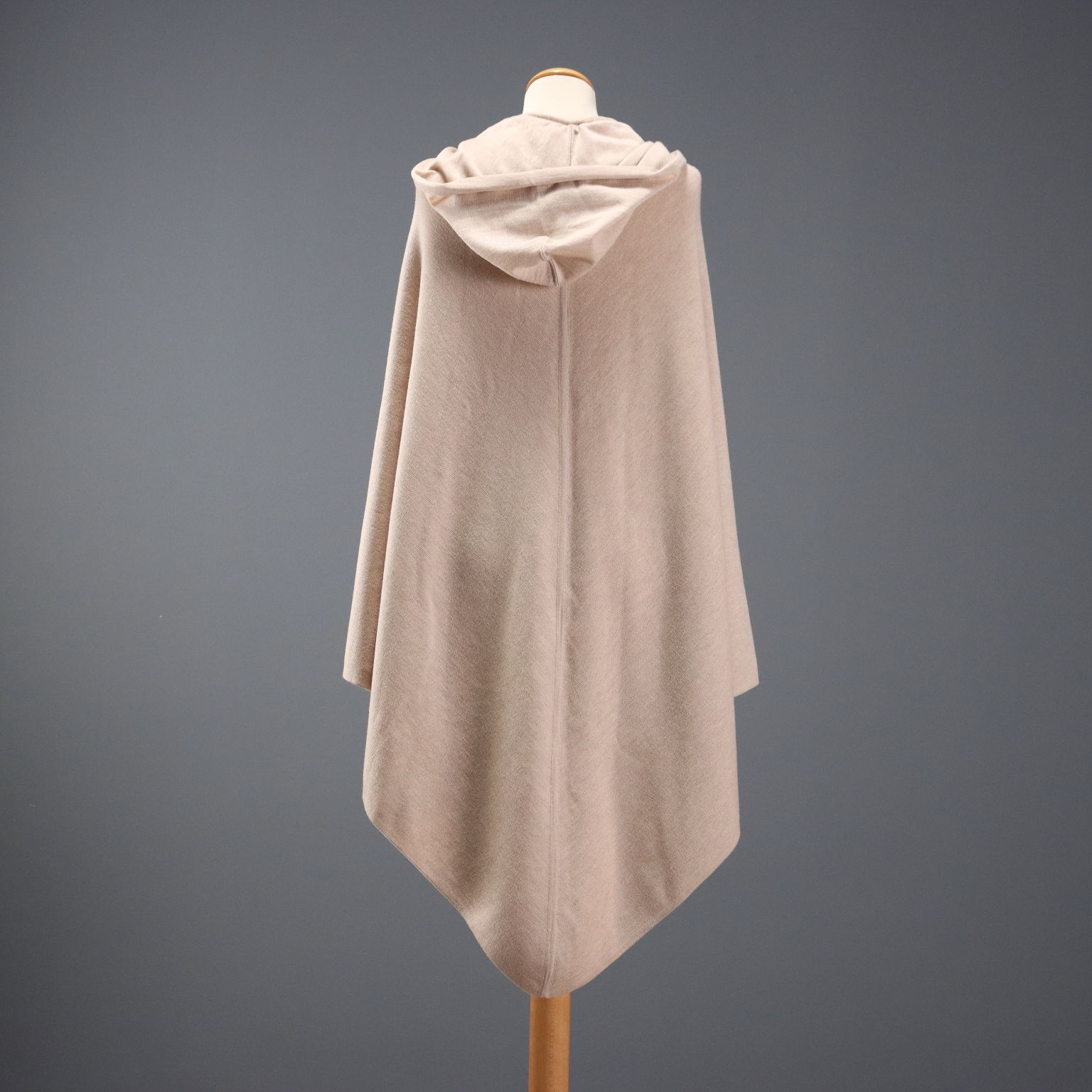 Capa suave con capucha confeccionada en pura lana color beige claro. El escote presenta un botón y un ojal a tono. Es una prenda de talla única, con las siguientes medidas: Largo total: 113 cm. Ancho: 122 cm. Largo de hombros: 78 cm.