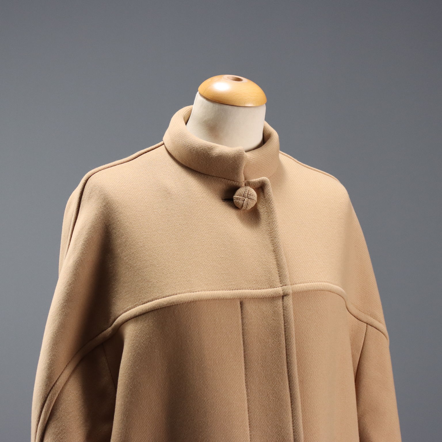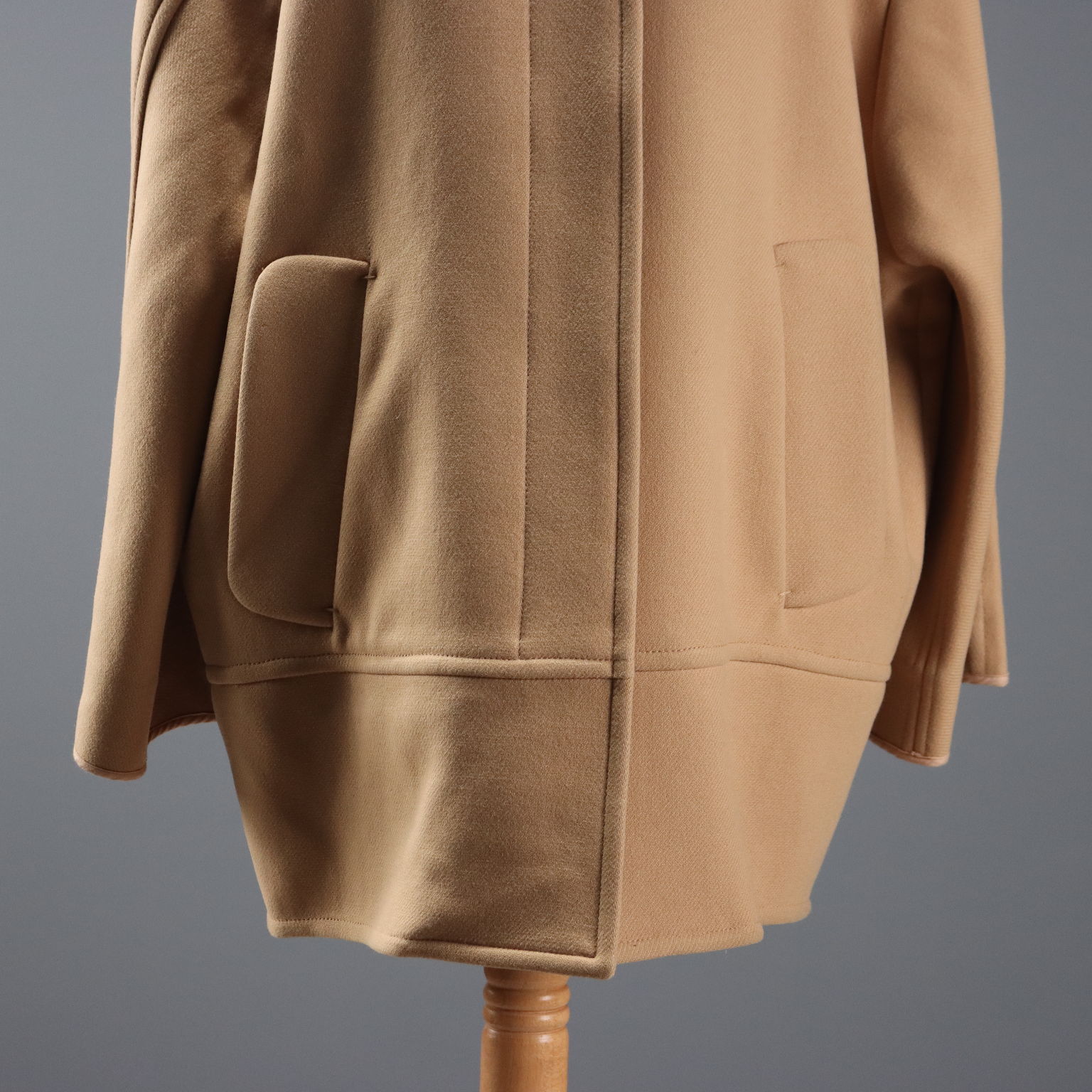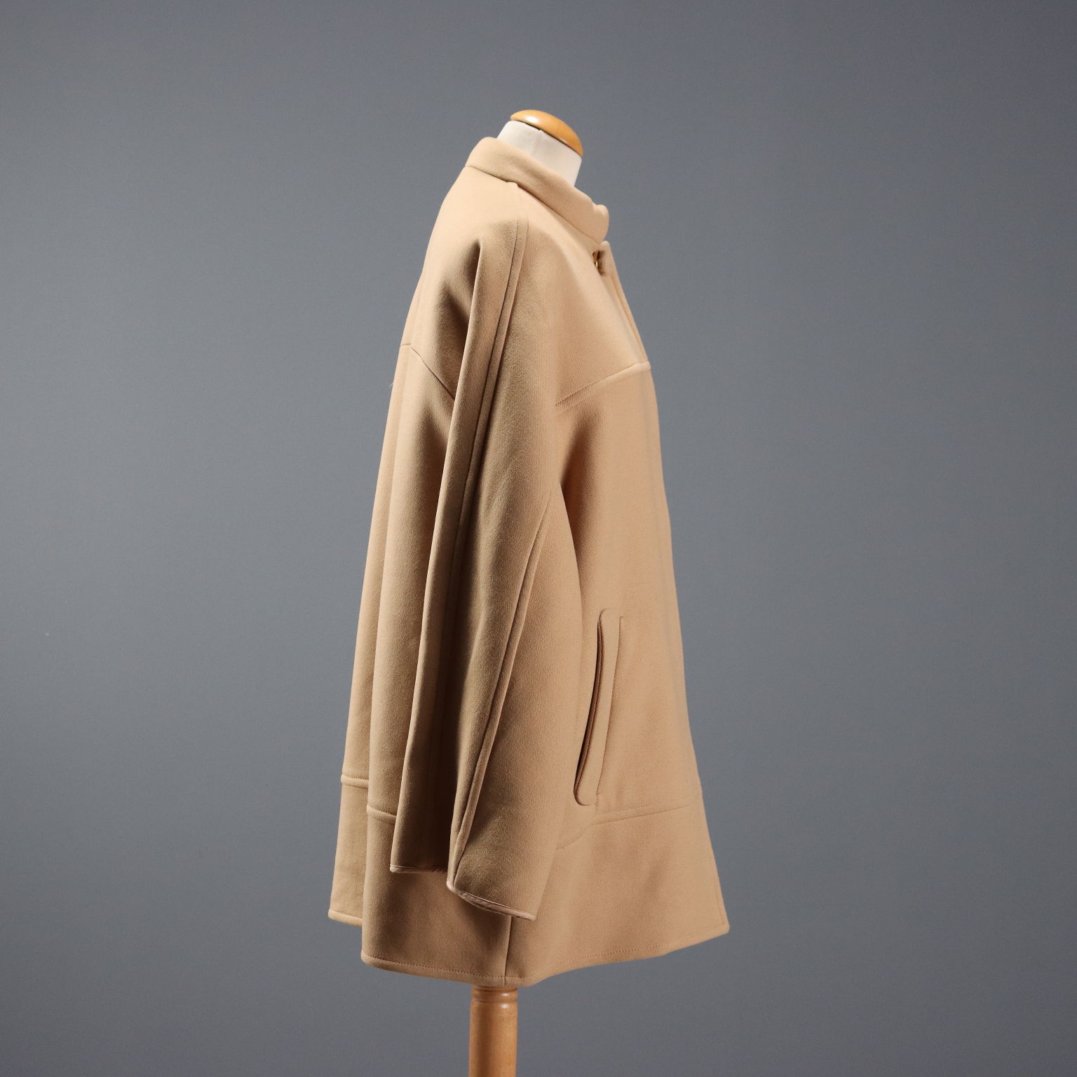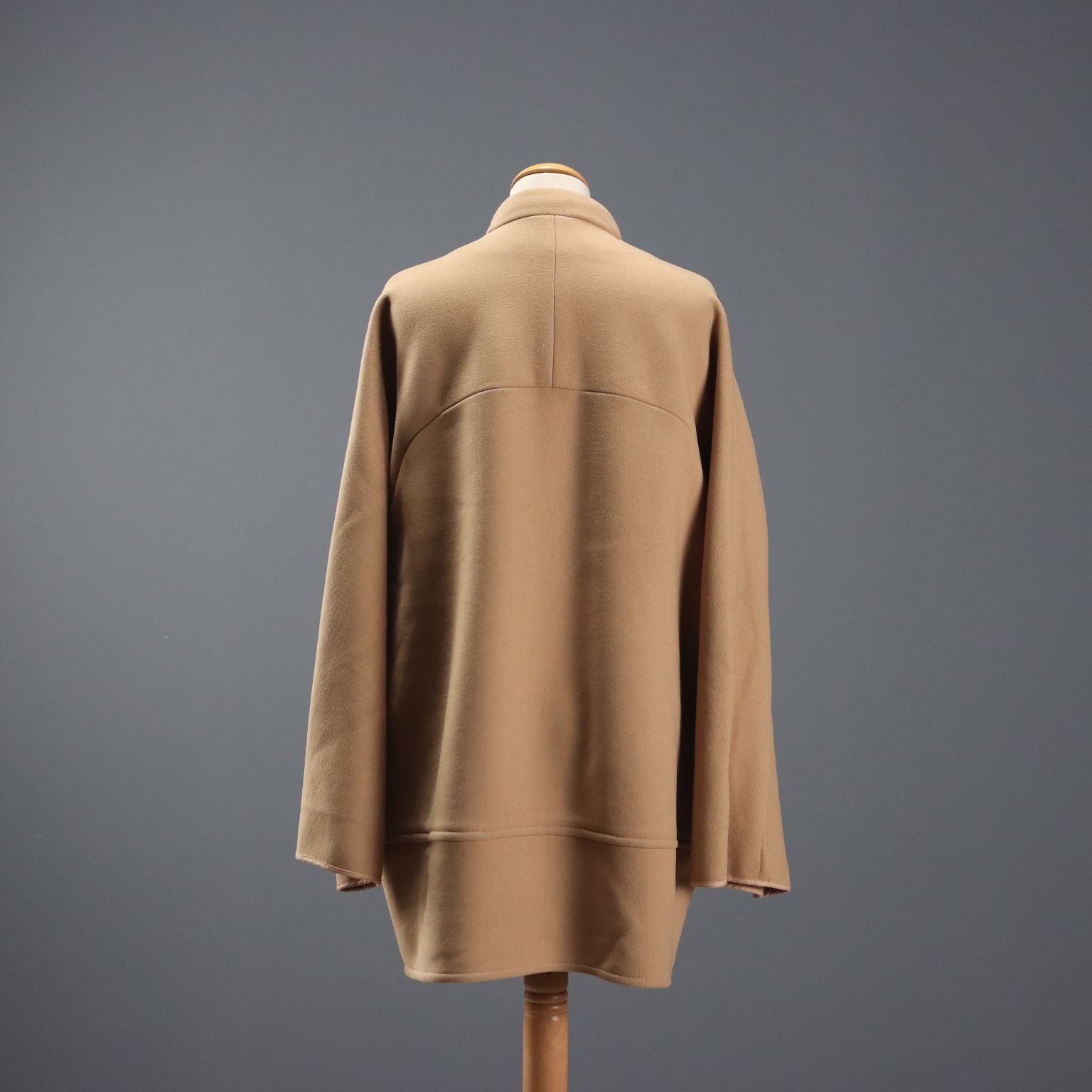 Elegante abrigo oversize de pura lana camel, de corte corto y con detalles refinados. La tapeta de un solo botón está oculta, a excepción del botón superior forrado en lana tono sobre tono. Presenta mangas anchas y dos bolsillos. La talla mostrada es la 36 francesa, que corresponde a la 40 italiana. Al tratarse de un modelo oversize, las medidas se detallan a continuación: Largo: 84,5 cm. Contorno de pecho: 69 cm. Largo de manga: 80 cm (medido desde la base del cuello). La prenda se encuentra en un estado casi impecable, con solo pequeñas imperfecciones en las costuras de los puños, visibles únicamente desde el interior.