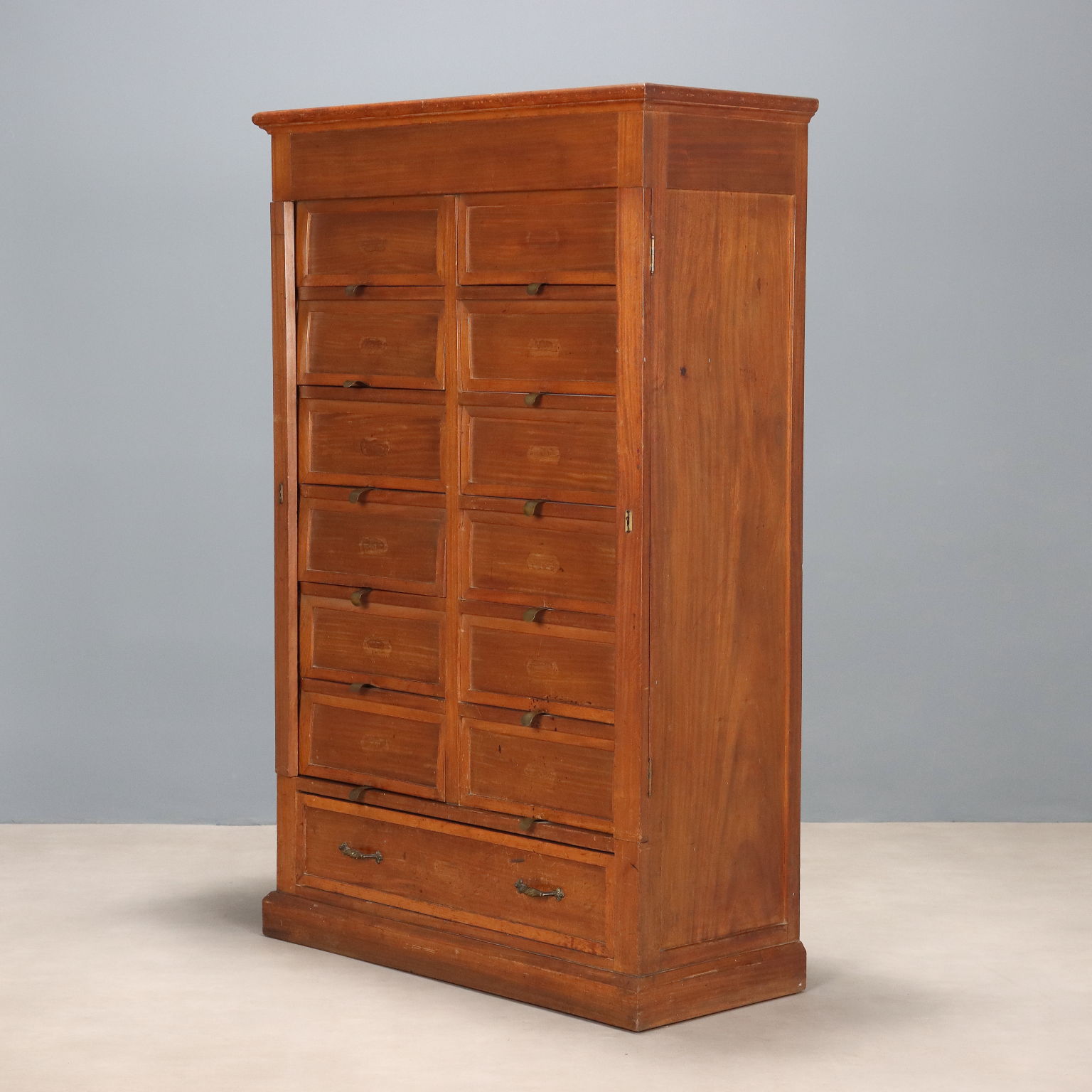 Cómoda de caoba, compuesta por una doble hilera de seis cajones con frente abatible y montantes con cerradura. Un cajón en la base. Interior de roble y álamo, tiradores de bronce. Italia, principios del siglo XX.