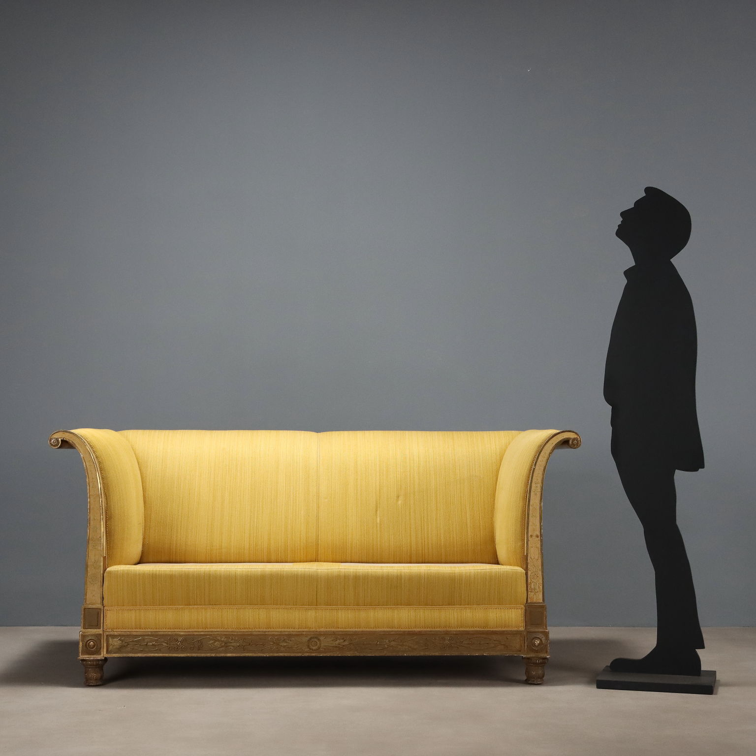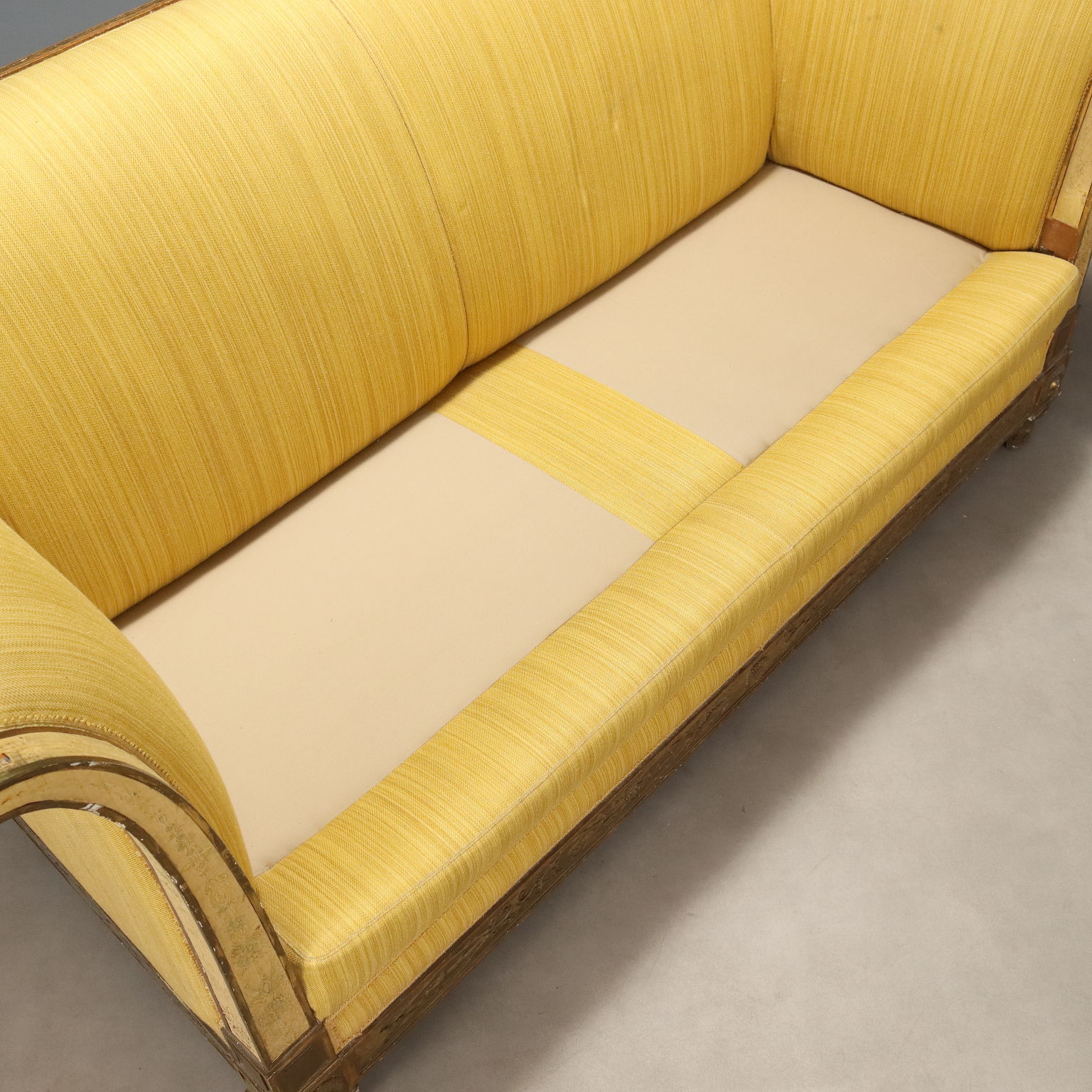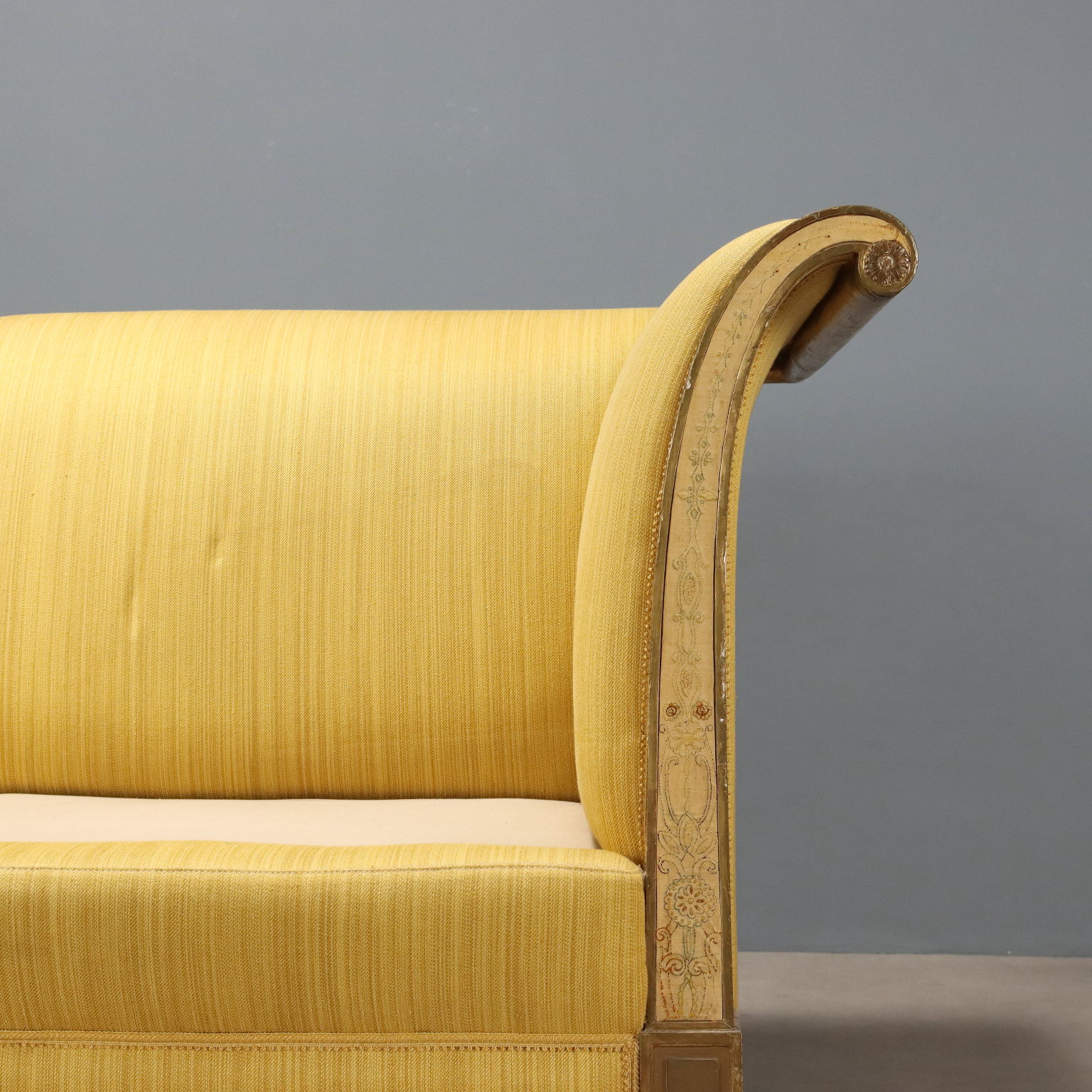 Sofá abierto de la época de la Restauración, en madera tallada y dorada. La sección inferior presenta tallas neoclásicas, al igual que las patas torneadas. El respaldo y los laterales culminan en una curva, elegantemente adornada con inserciones de tela bordada con motivos neoclásicos, enmarcadas por molduras doradas. Las inserciones frontales están muy descoloridas. El respaldo, los laterales y el asiento están acolchados; faltan los cojines. Italia, segundo cuarto del siglo XIX.