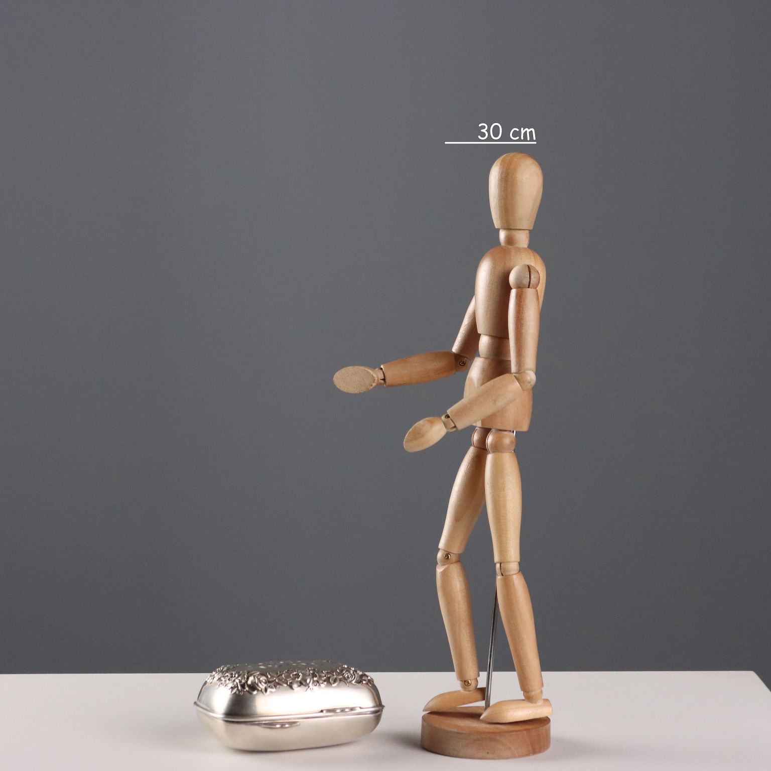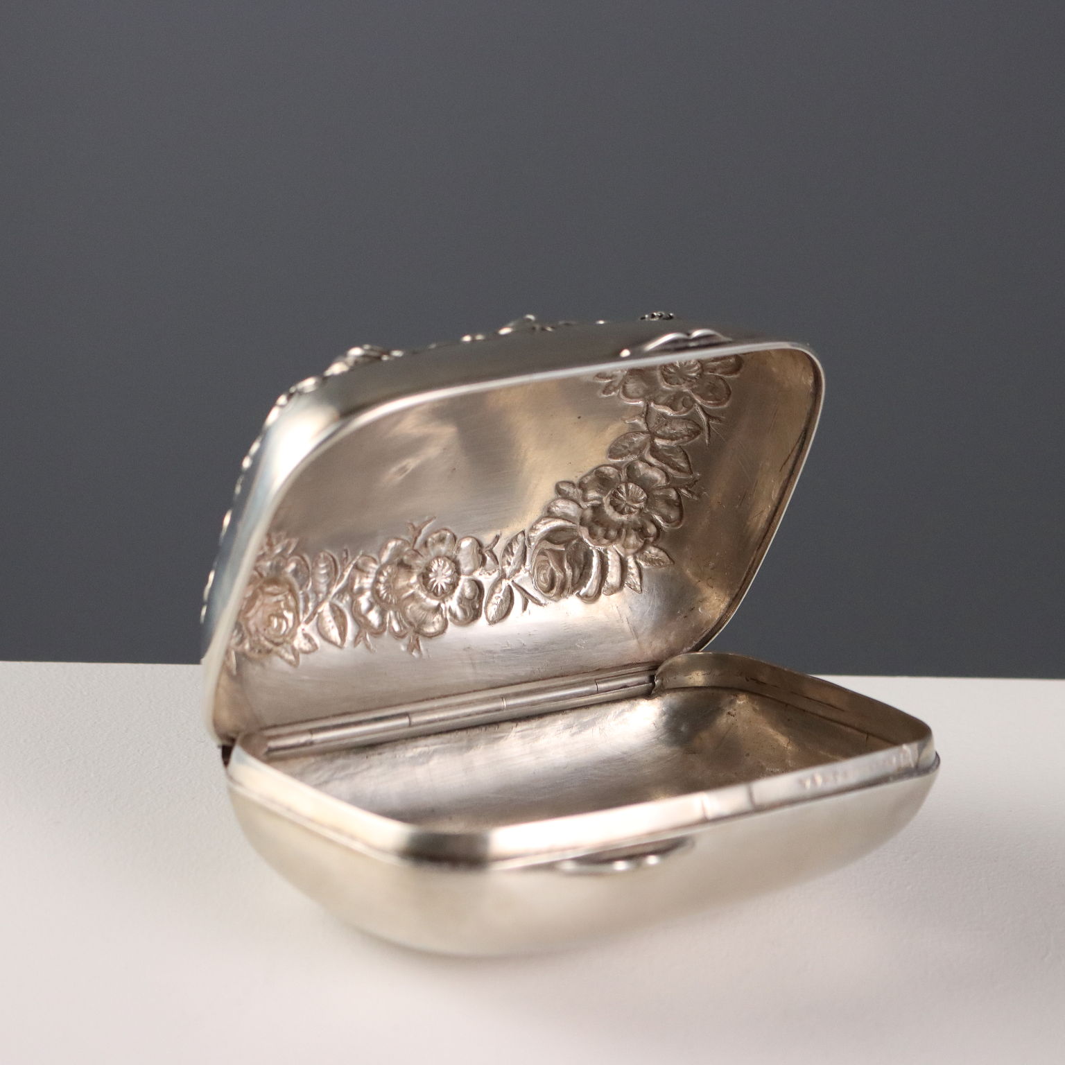 Caja de plata de ley repujada. Decoración repujada con un marco floral. Números grabados en el centro. Contrastes de plata grabados en el borde interior. Peso: 110 gramos.