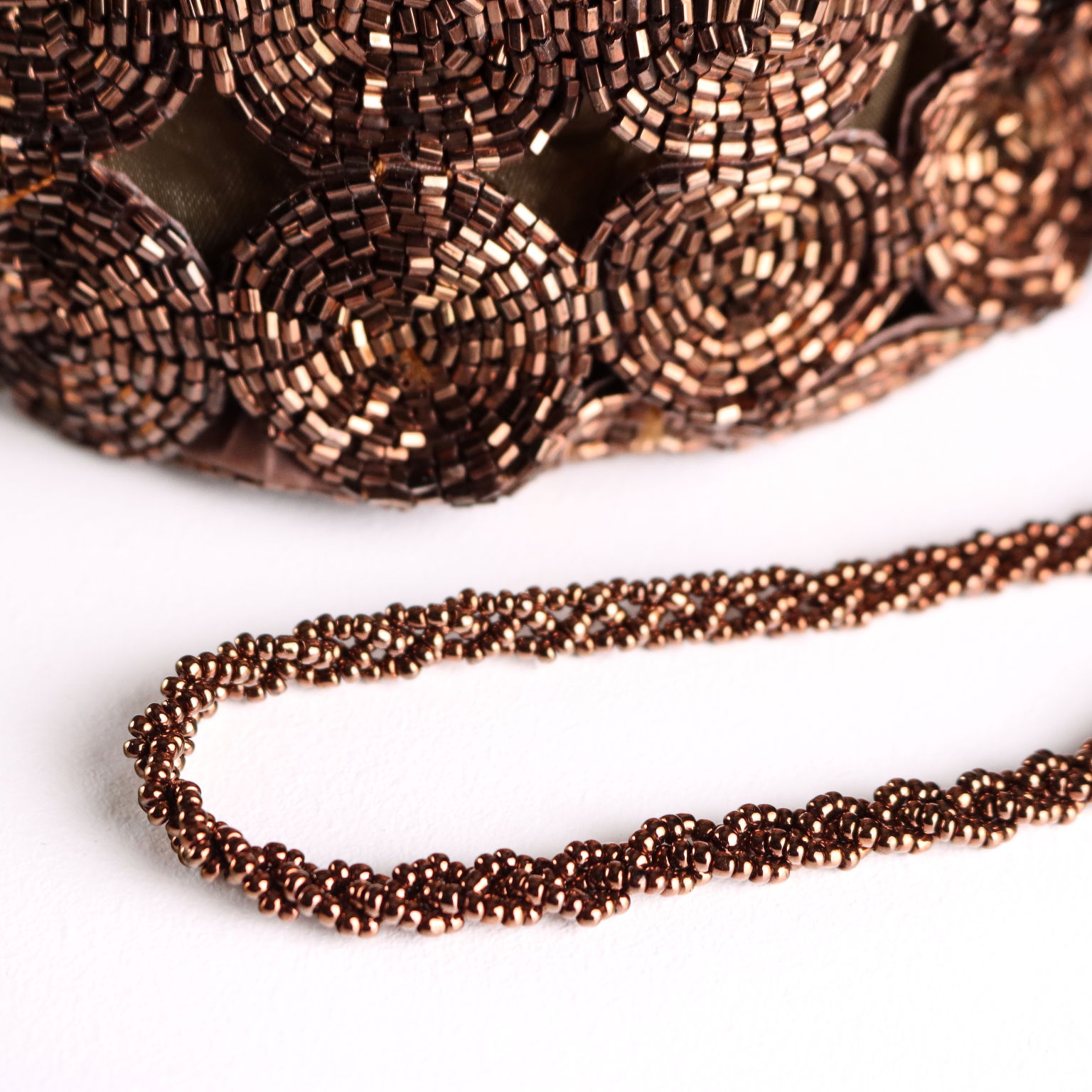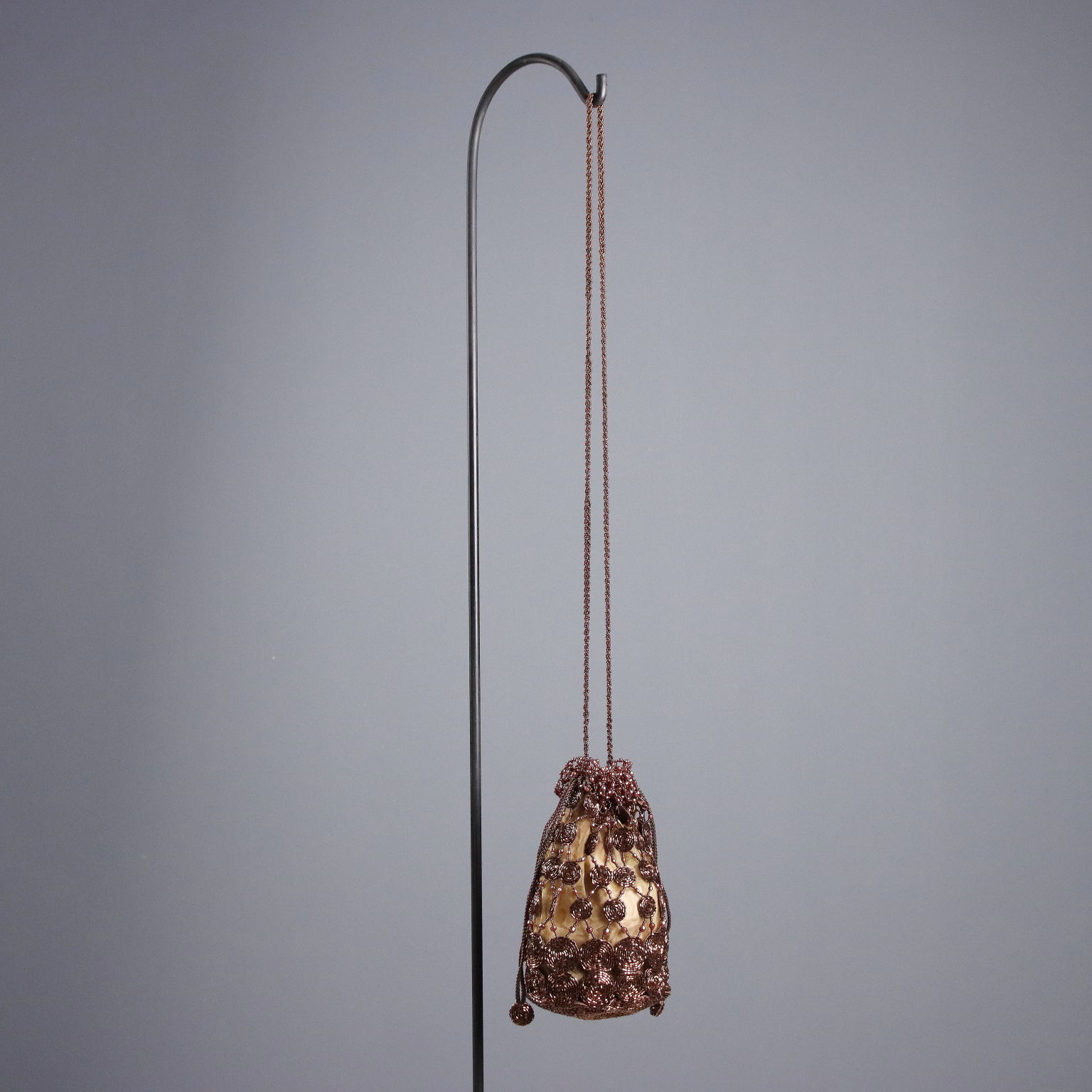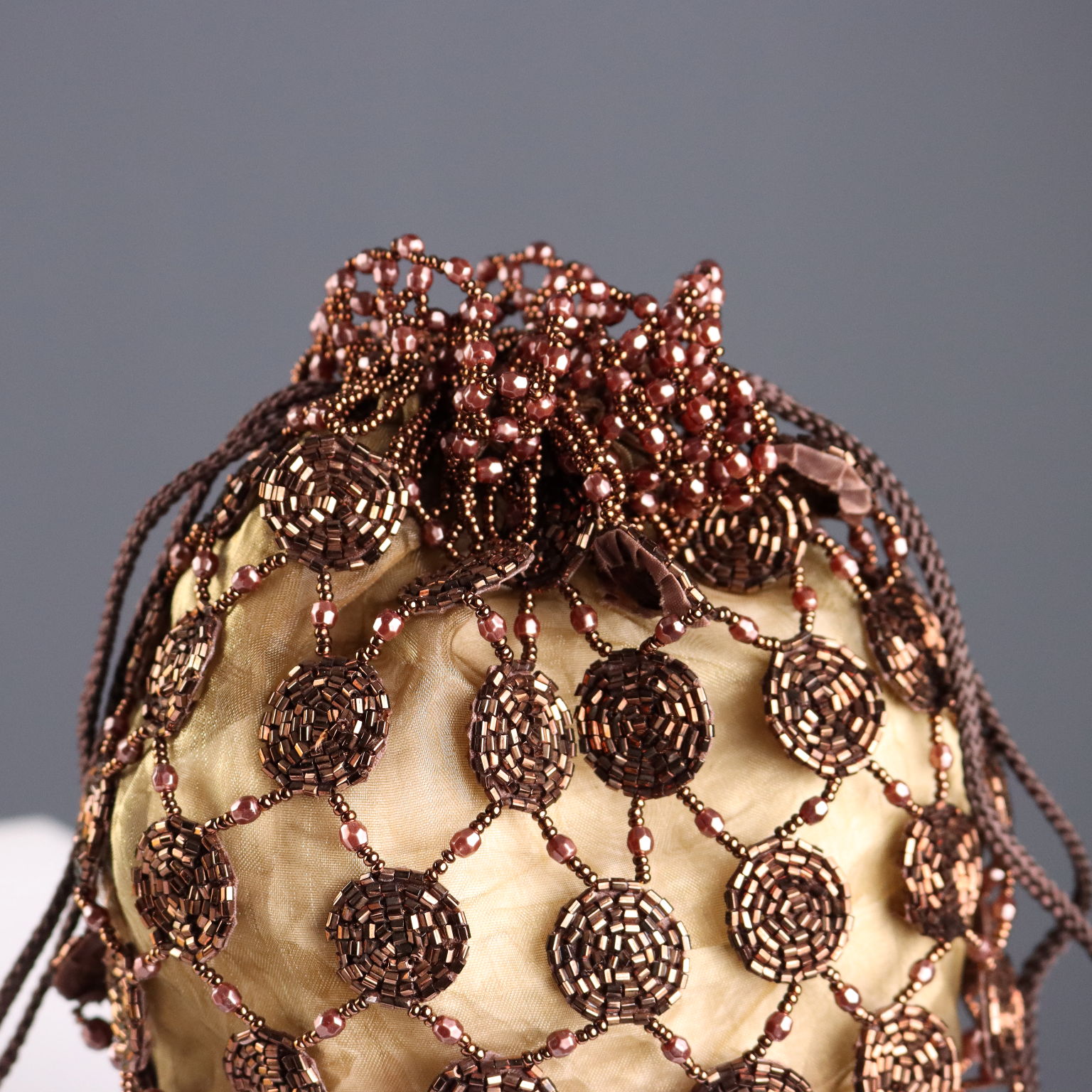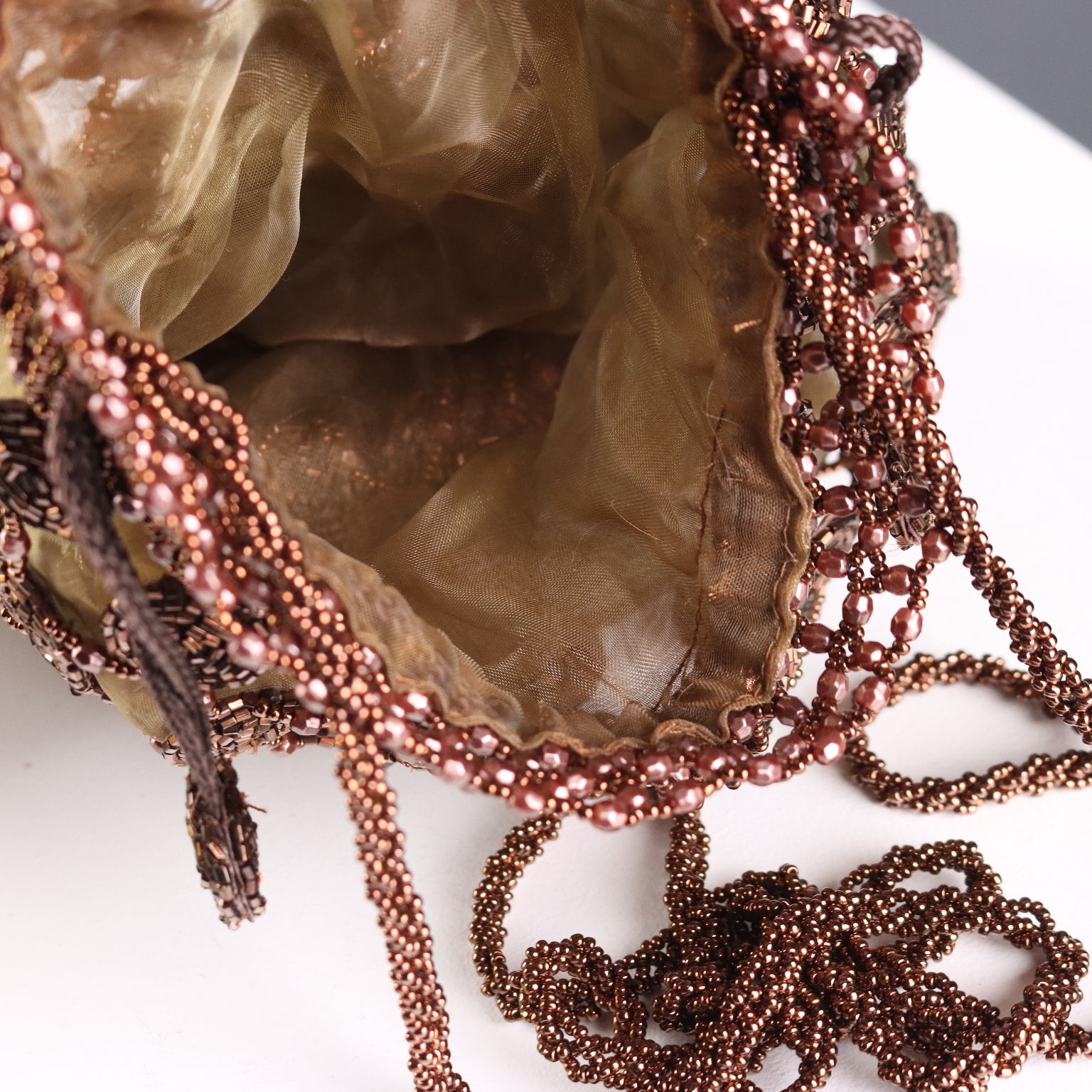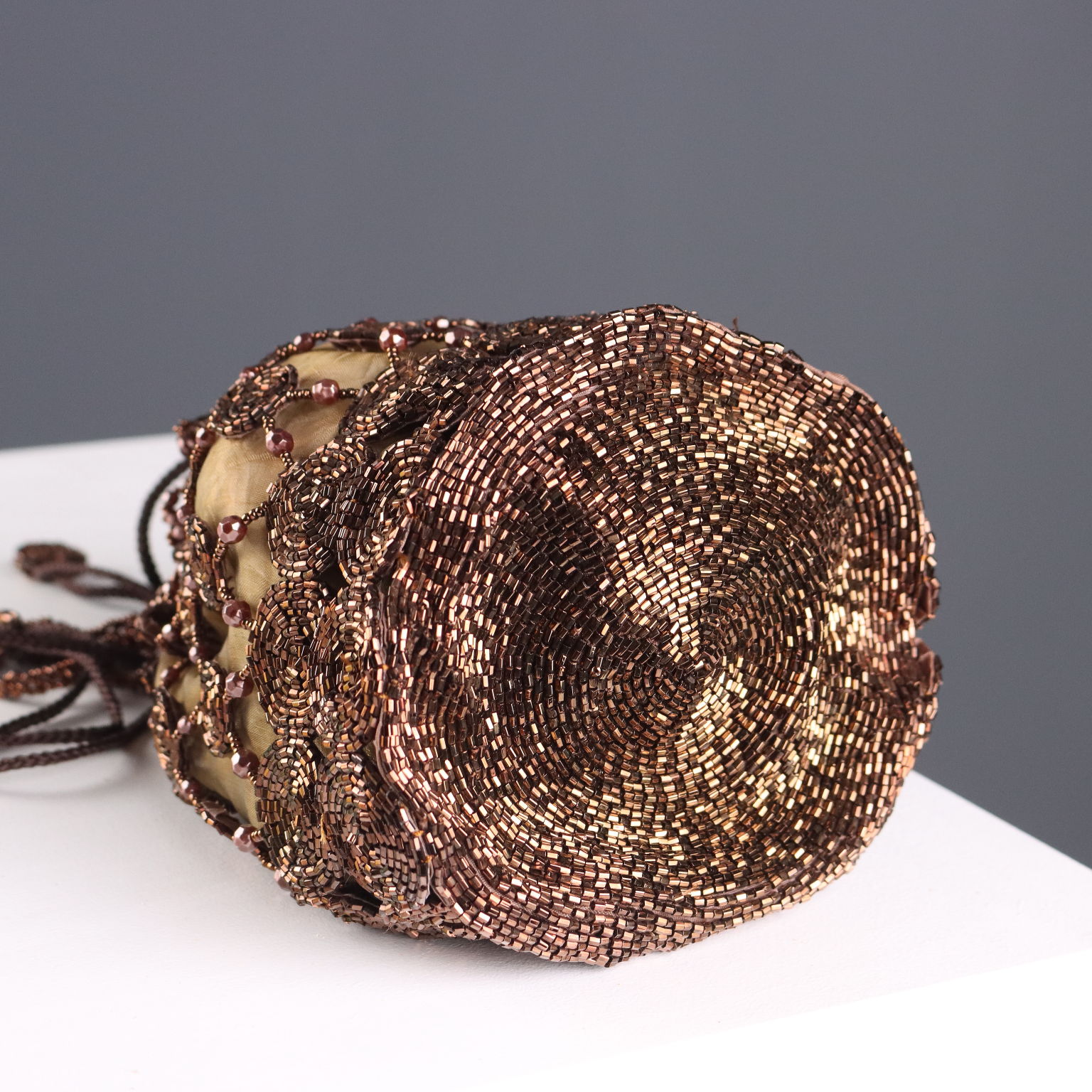 Un bolso tipo cubo hecho a mano con un precioso trabajo de cuentas marrones en forma circular. Tiene cierre de cordón y una correa de hombro de cadena con cuentas.