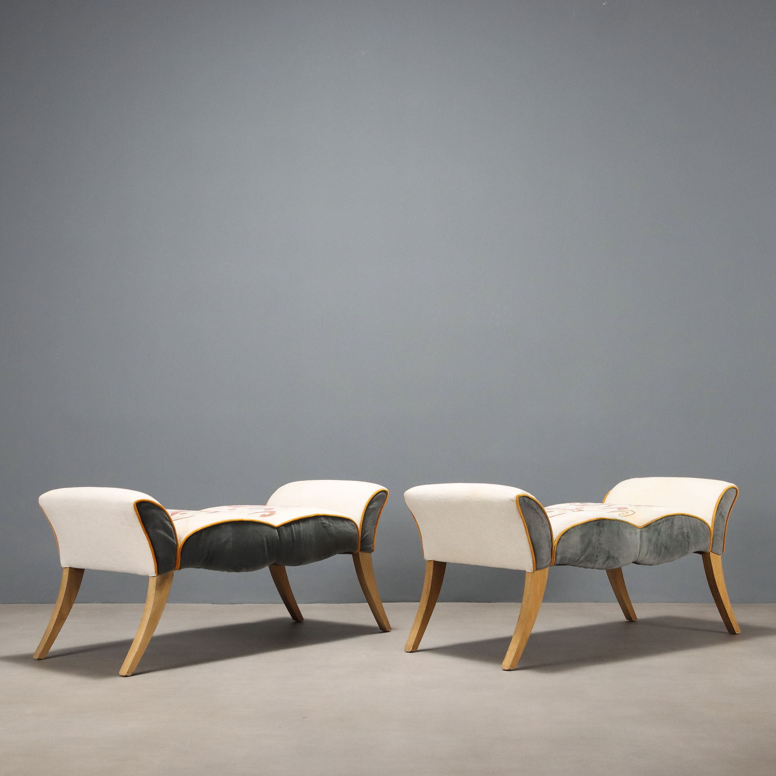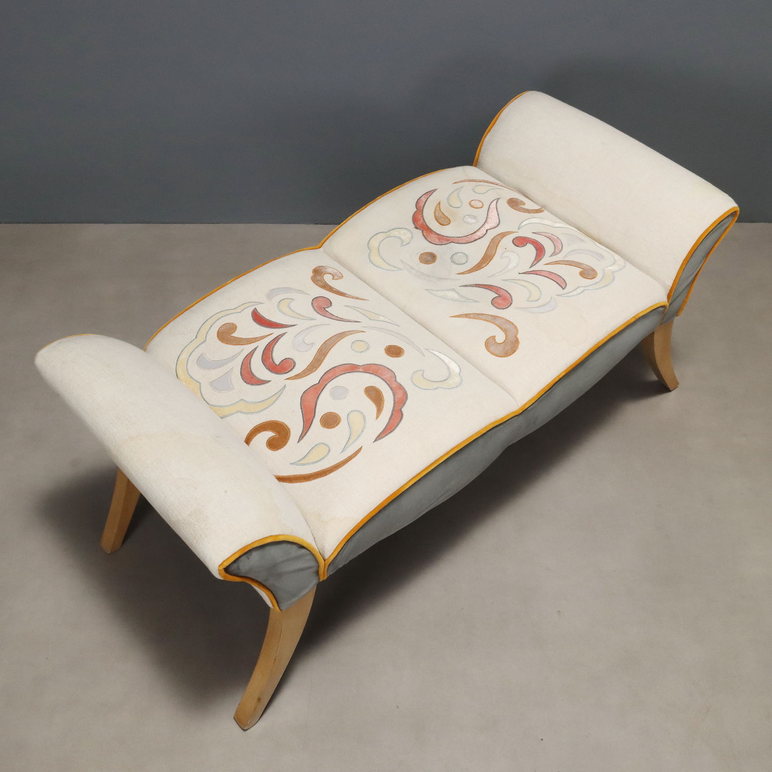 Pareja de sofás con forma de barco. Reposabrazos y asiento tapizados, tela bordada, patas de haya. Italia, siglo XX.
