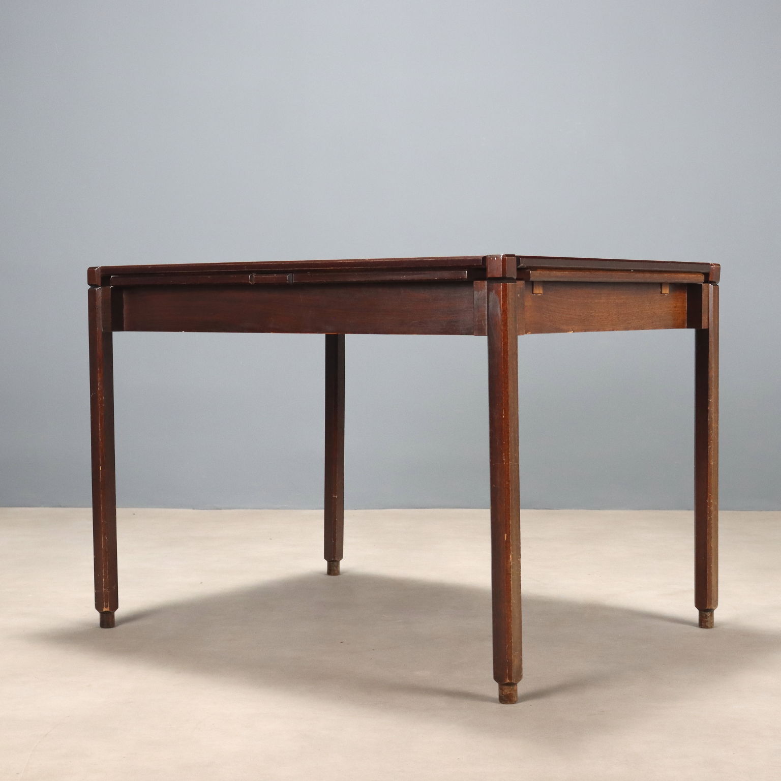 Mesa vintage chapada en madera exótica, extensible mediante extensiones y con tablero que puede abatirse hacia arriba y usarse como mesa de juego.