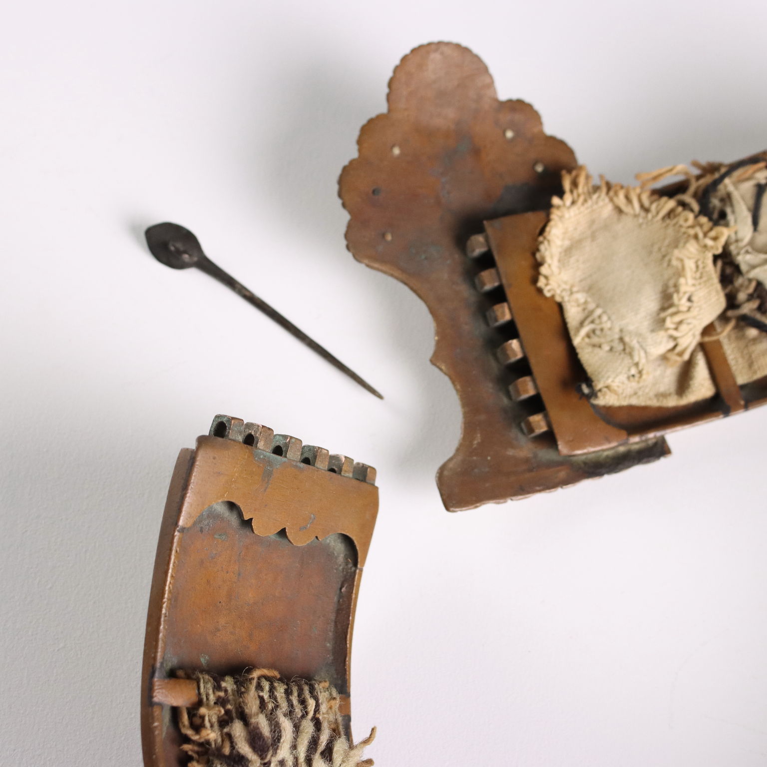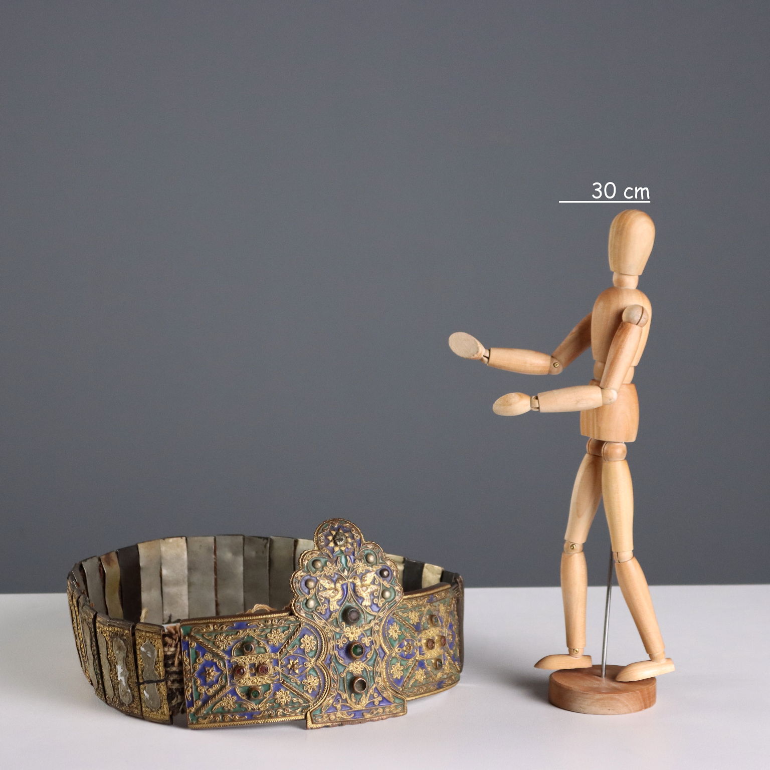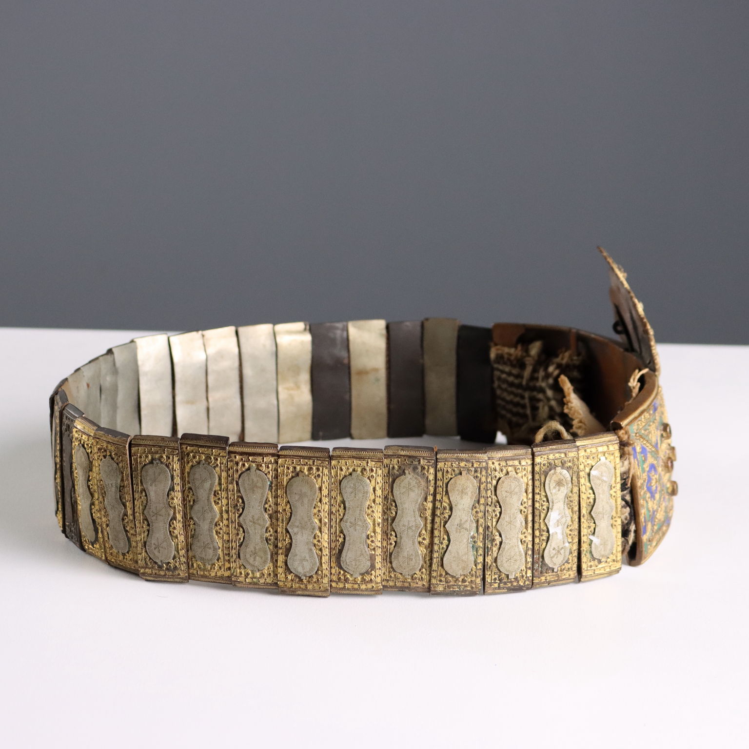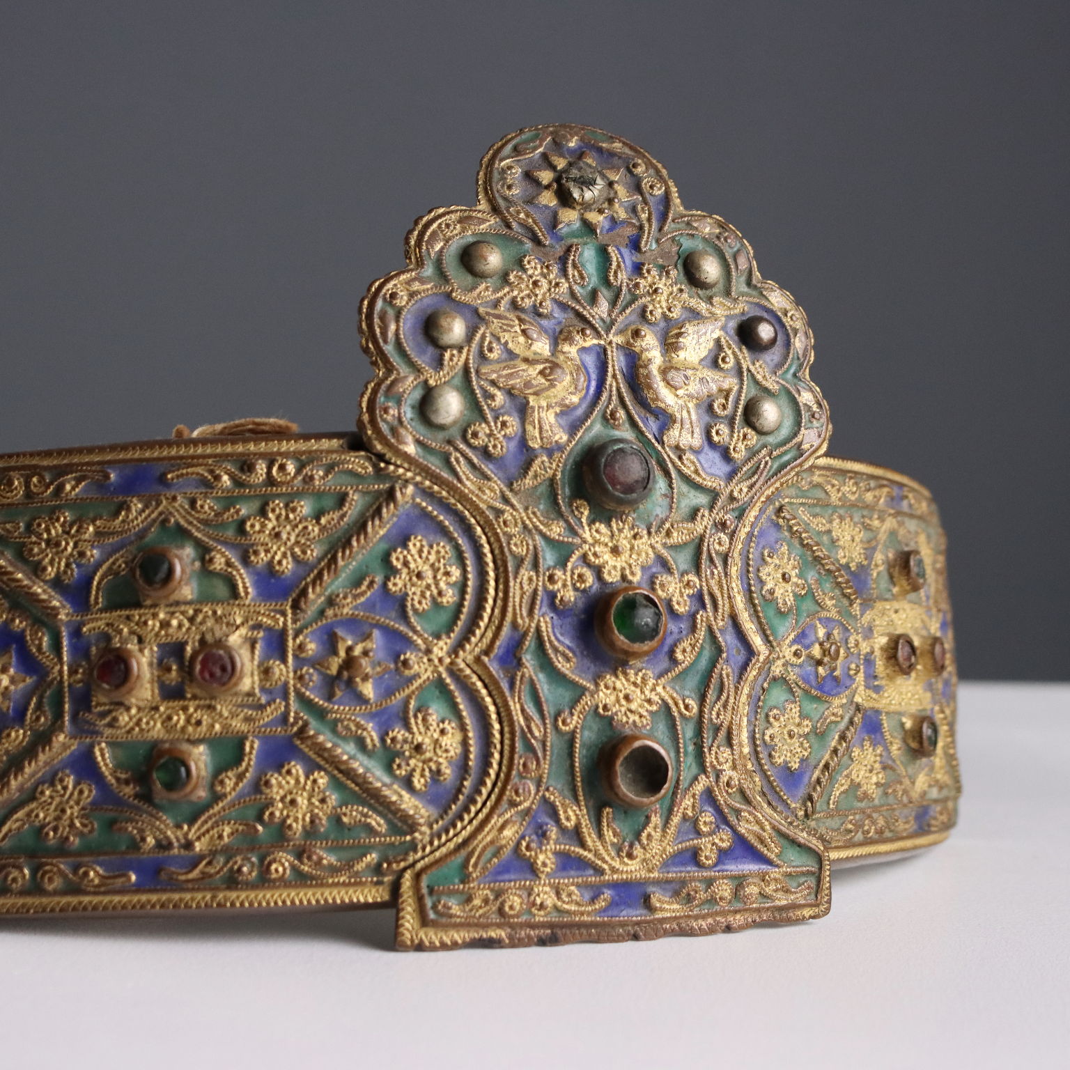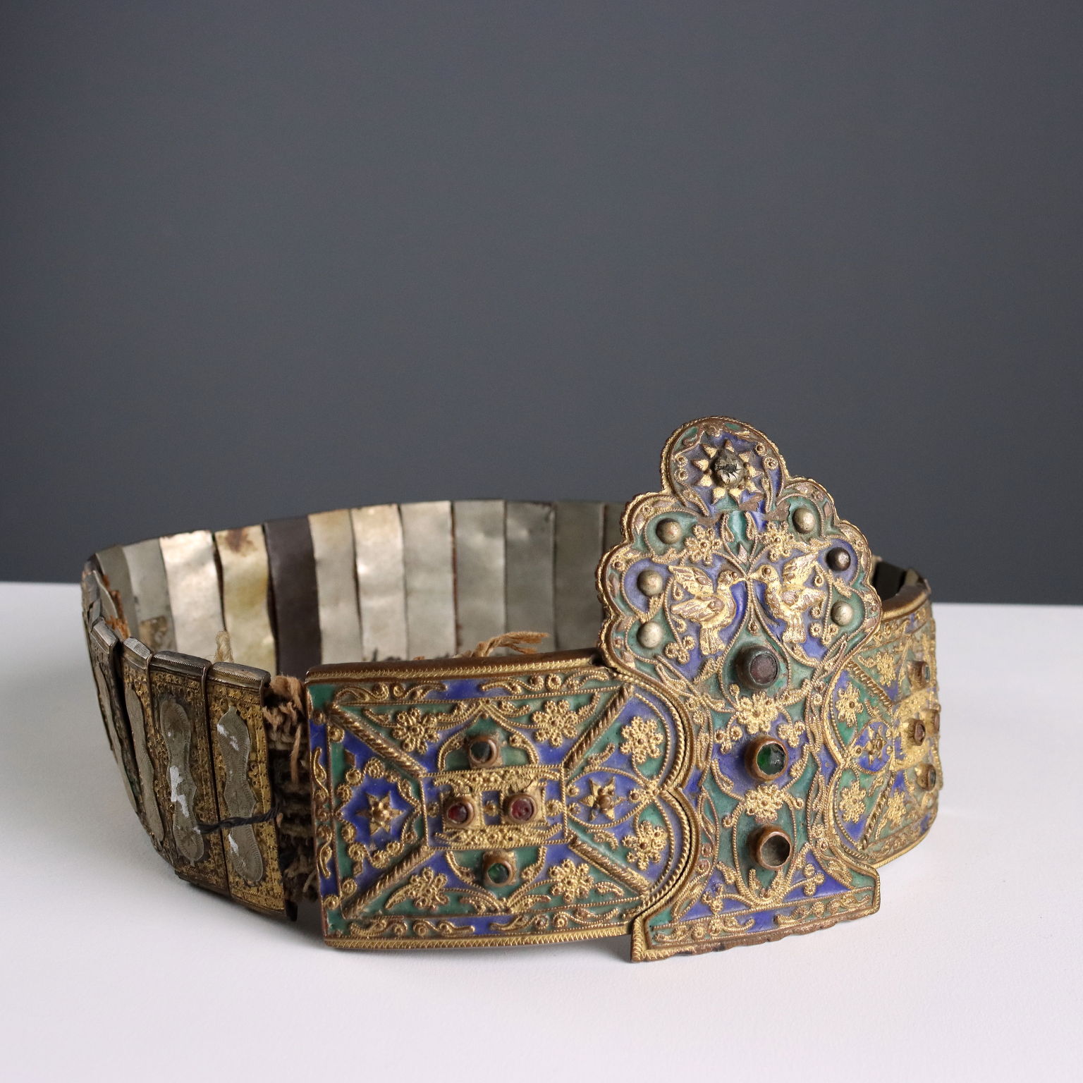 Cinturón ceremonial confeccionado con placas de metal grabadas. En el centro presenta una placa con forma decorada con filigrana de bronce, esmaltes policromados y gemas.