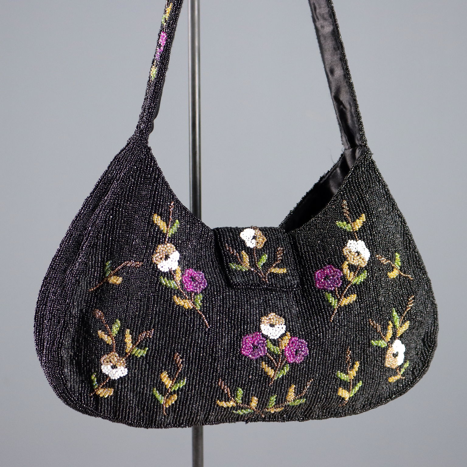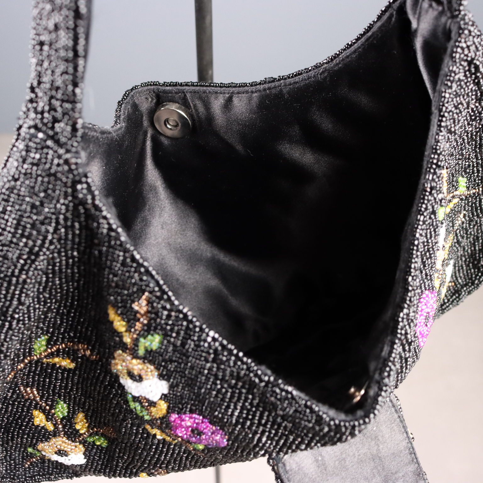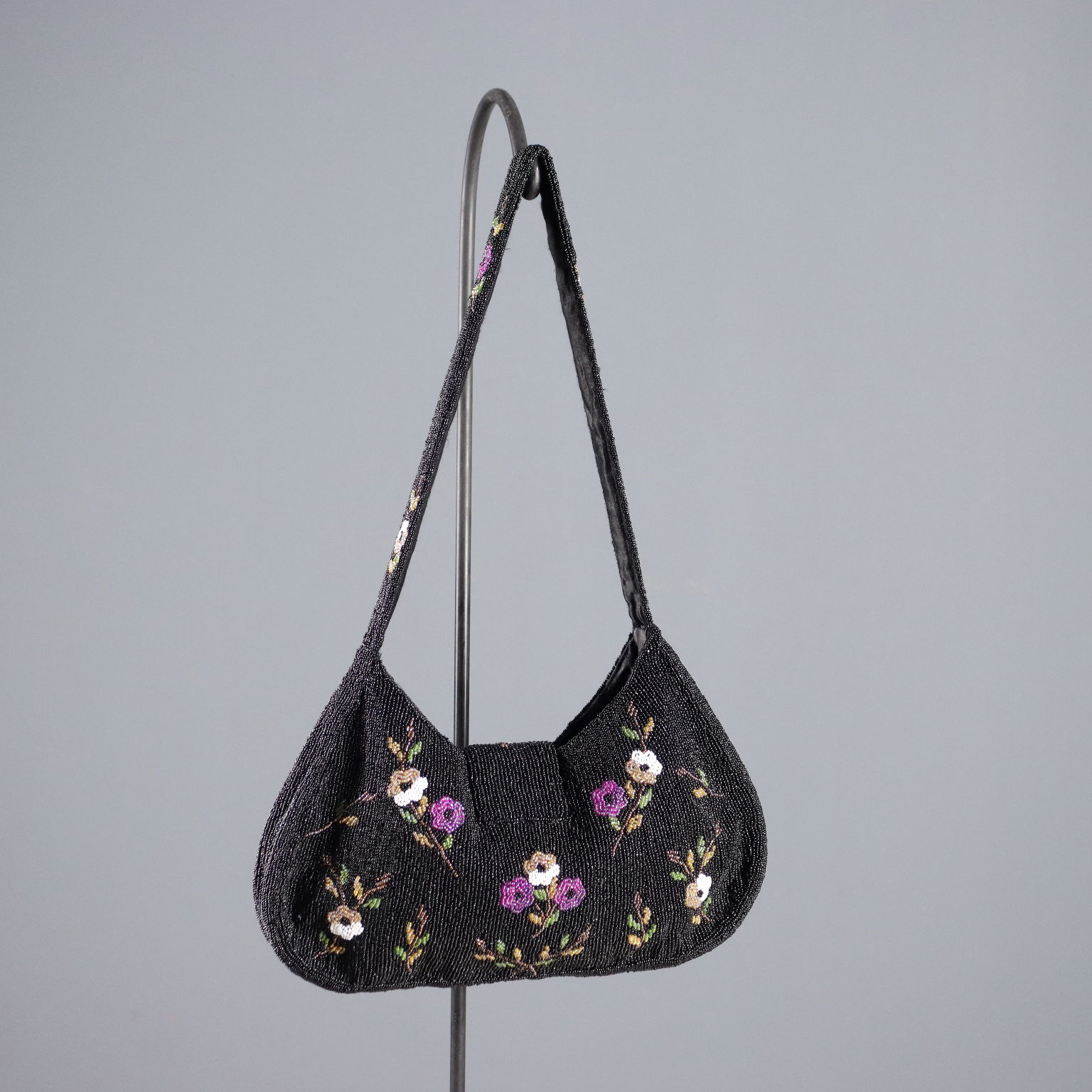 Bolso de hombro adornado con flores moradas, blancas y doradas sobre fondo negro. Cierre de doble broche. Interior forrado.