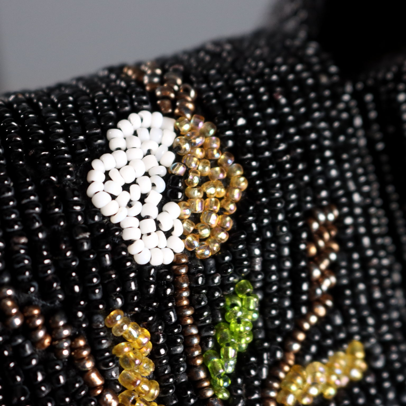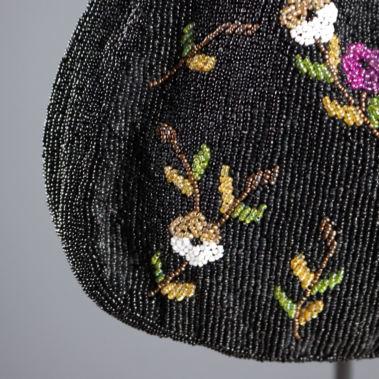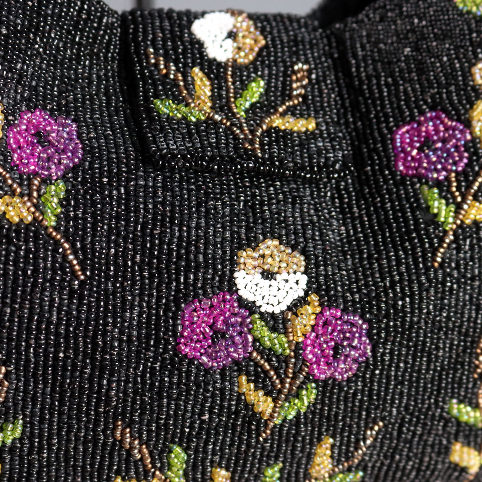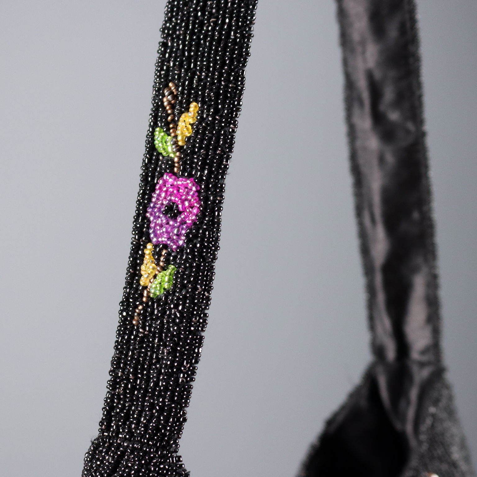 Bolso de hombro adornado con flores moradas, blancas y doradas sobre fondo negro. Cierre de doble broche. Interior forrado.
