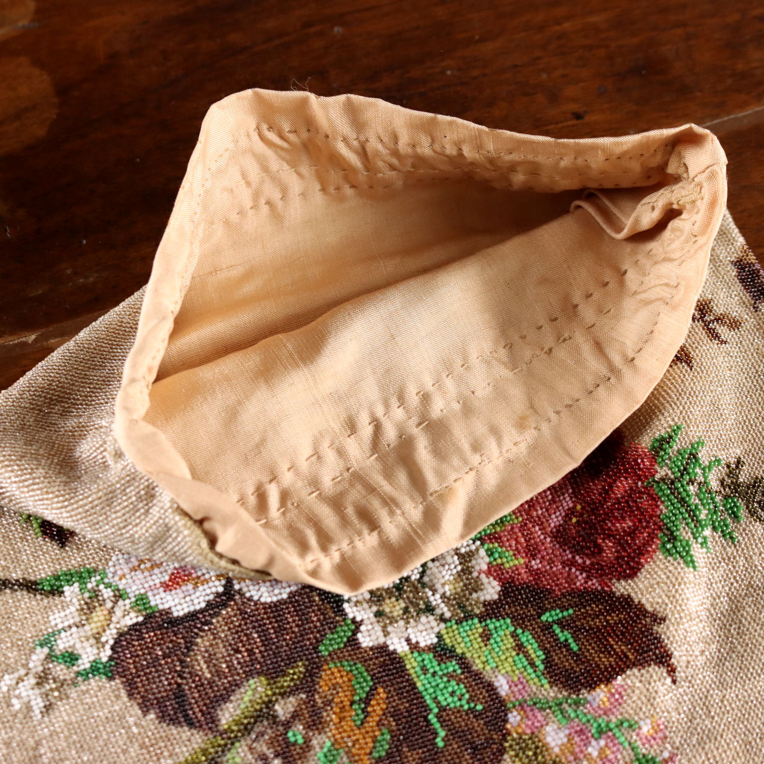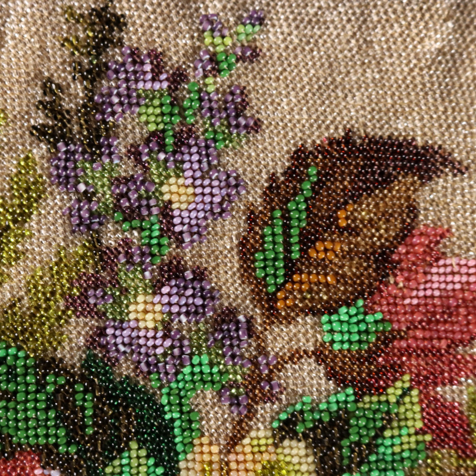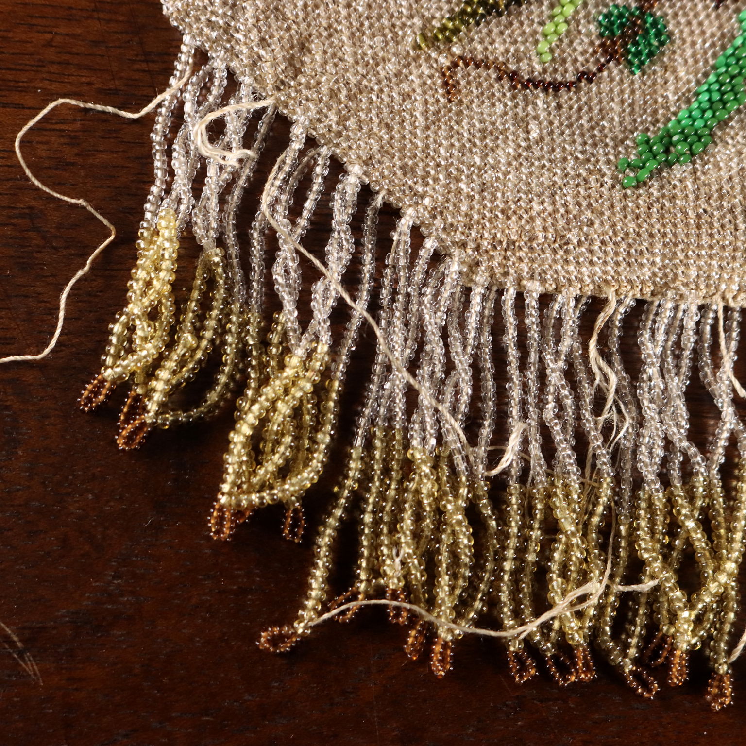 Bolso bordado con cuentas de vidrio y diseño floral. Los flecos presentan algunas imperfecciones.