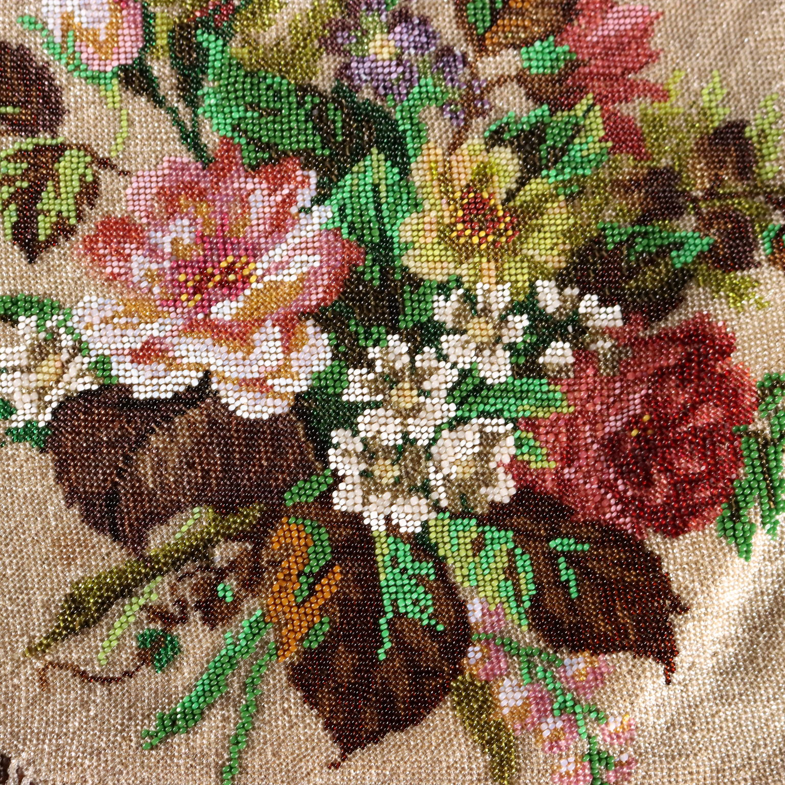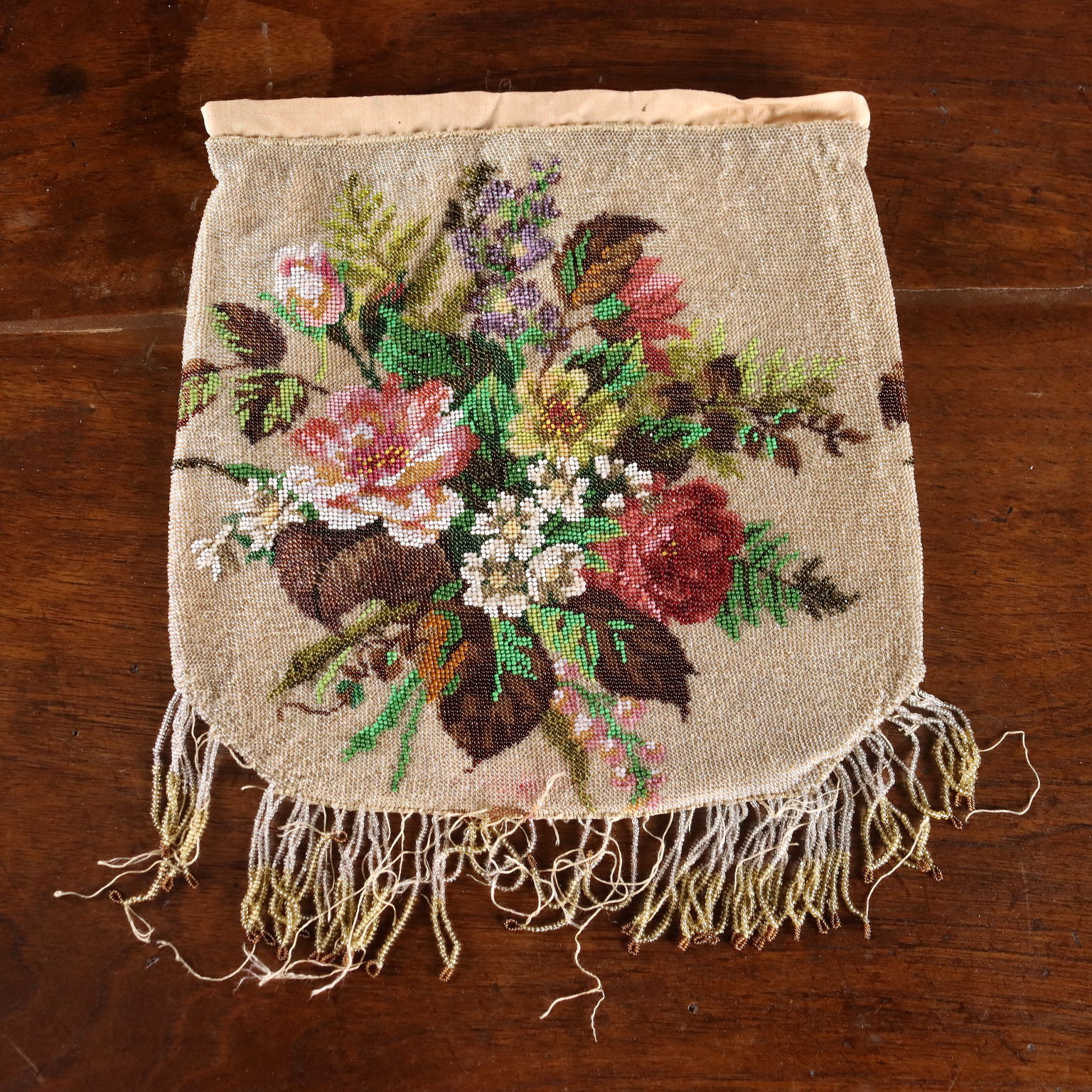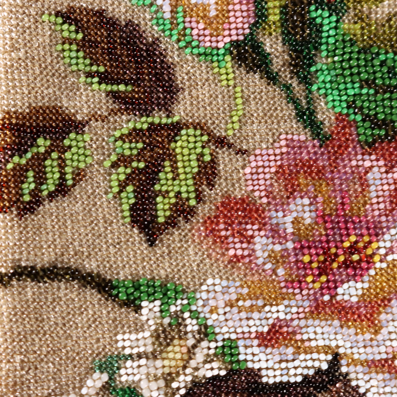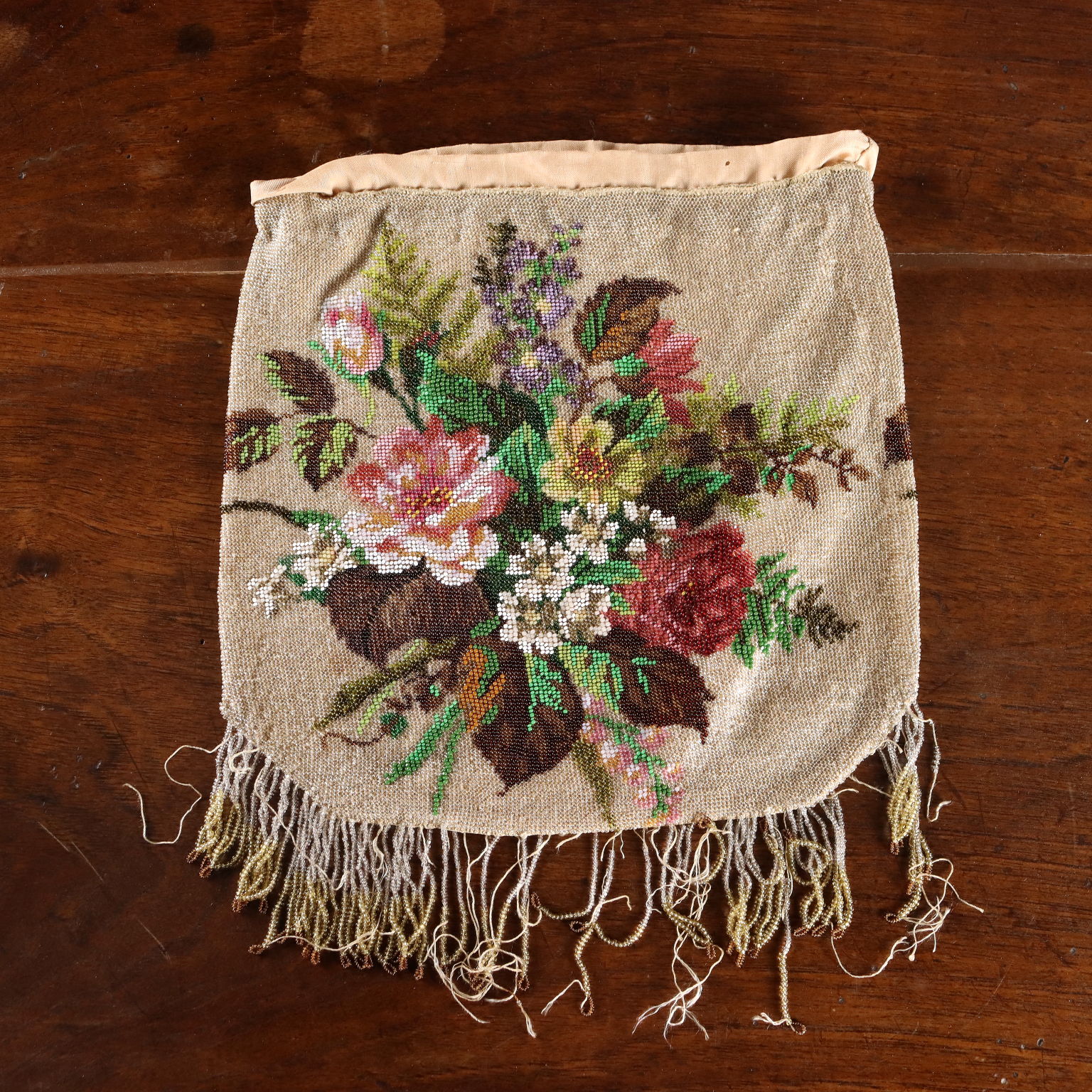 Bolso bordado con cuentas de vidrio y diseño floral. Los flecos presentan algunas imperfecciones.