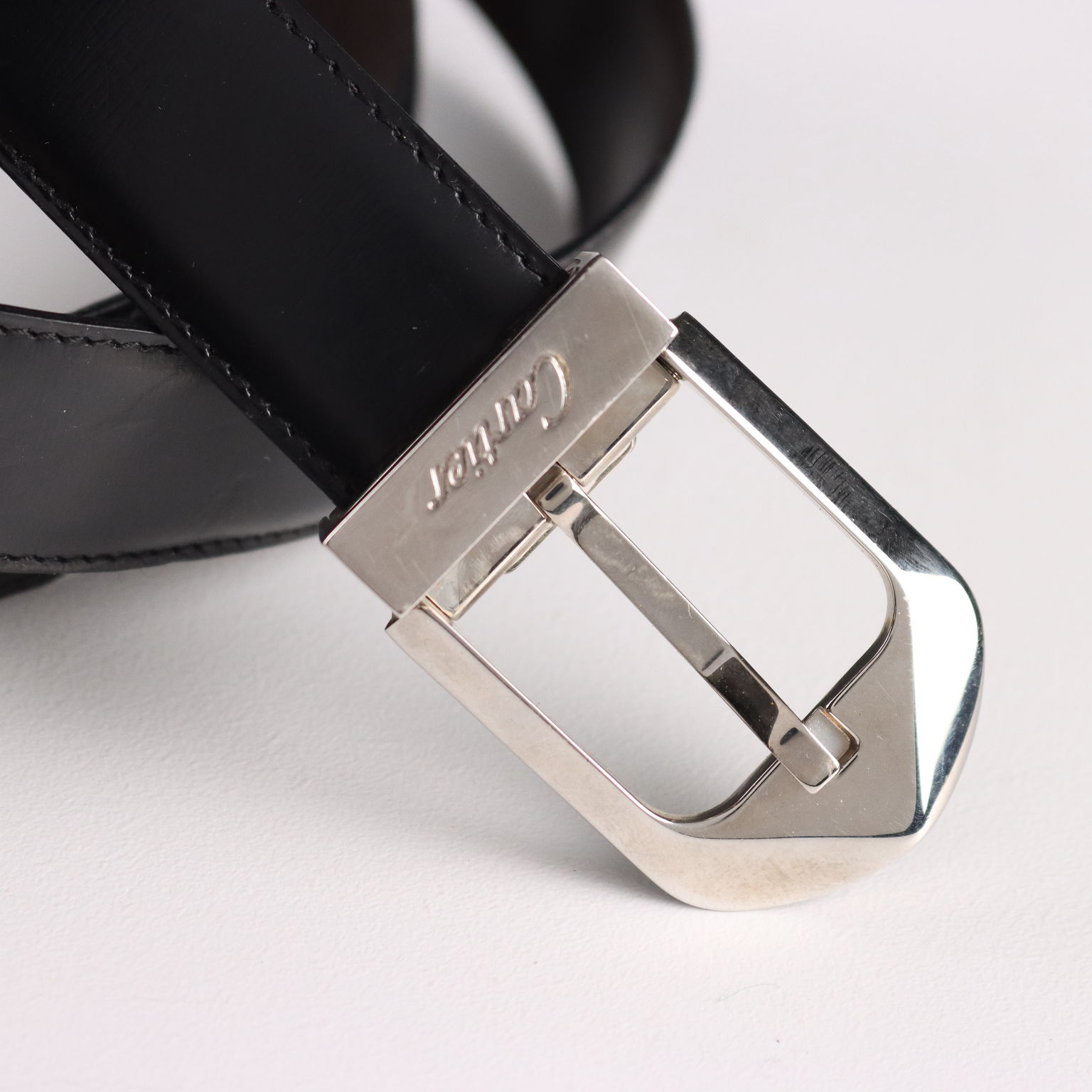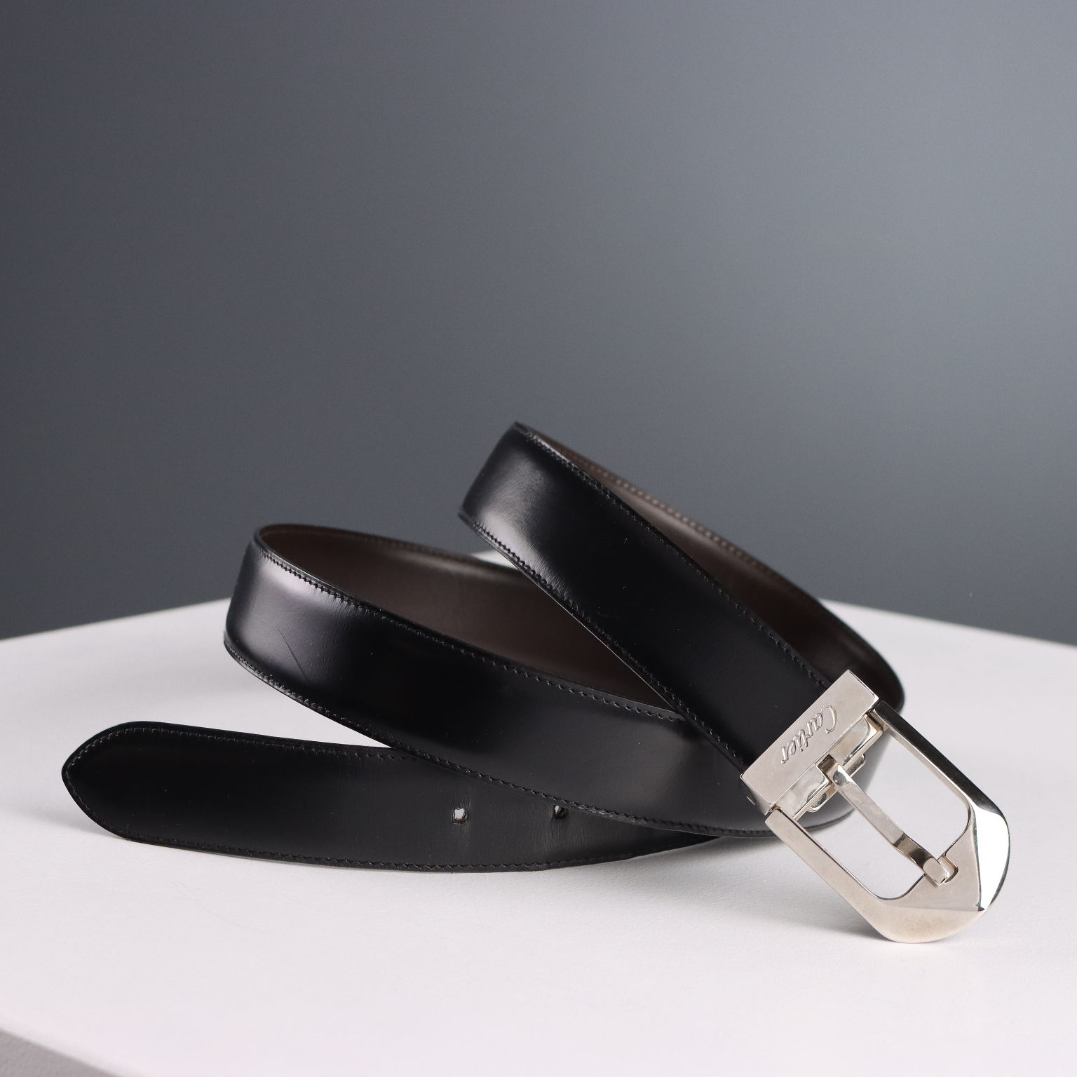 Cinturón de cuero liso de doble cara, uno negro y el otro marrón. La hebilla es extraíble. Largo total (sin hebilla): 112 cm. Alto: 3 cm. El artículo está en buen estado, con ligeras marcas de uso en el cuero.