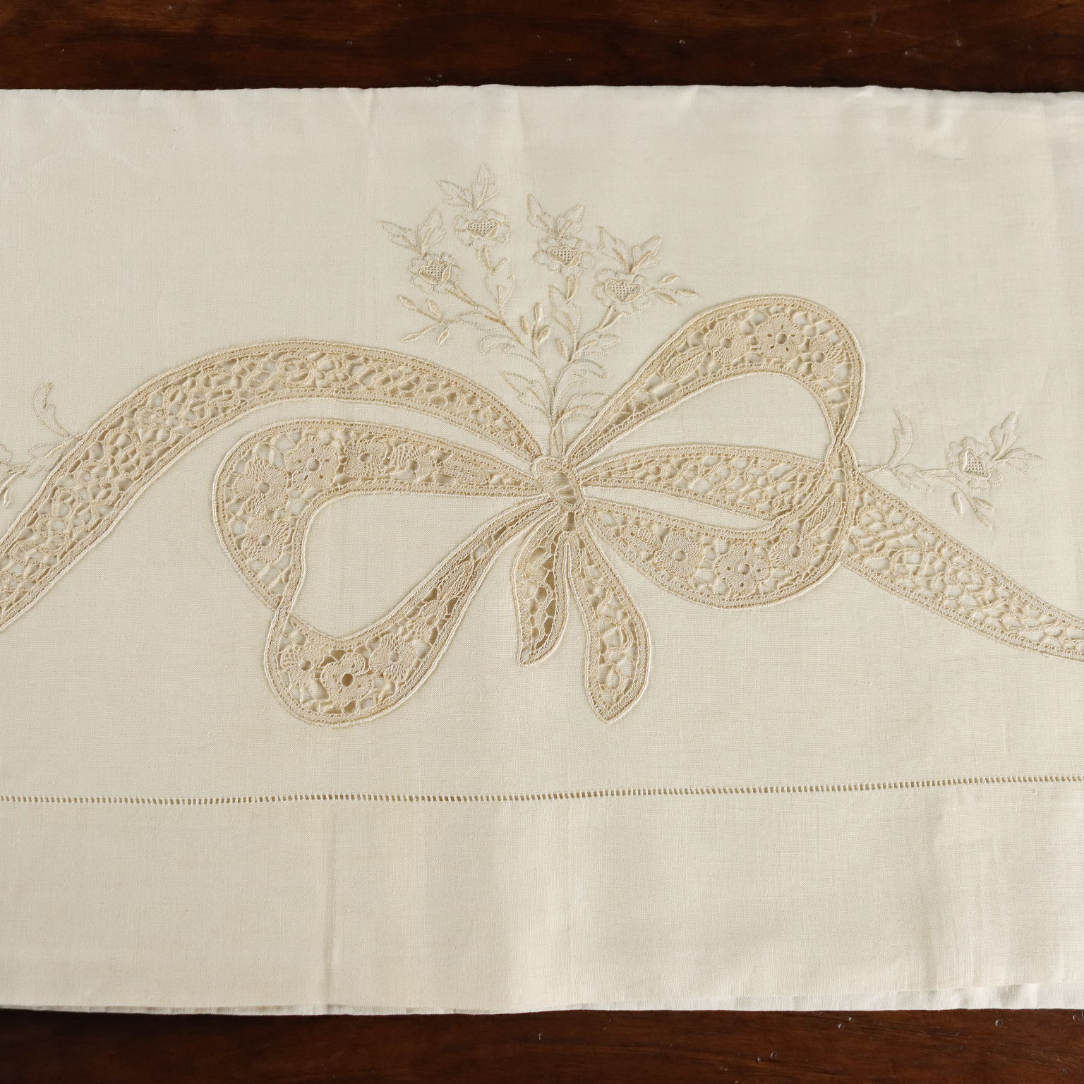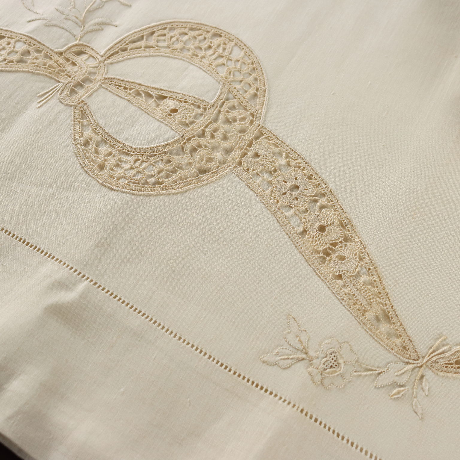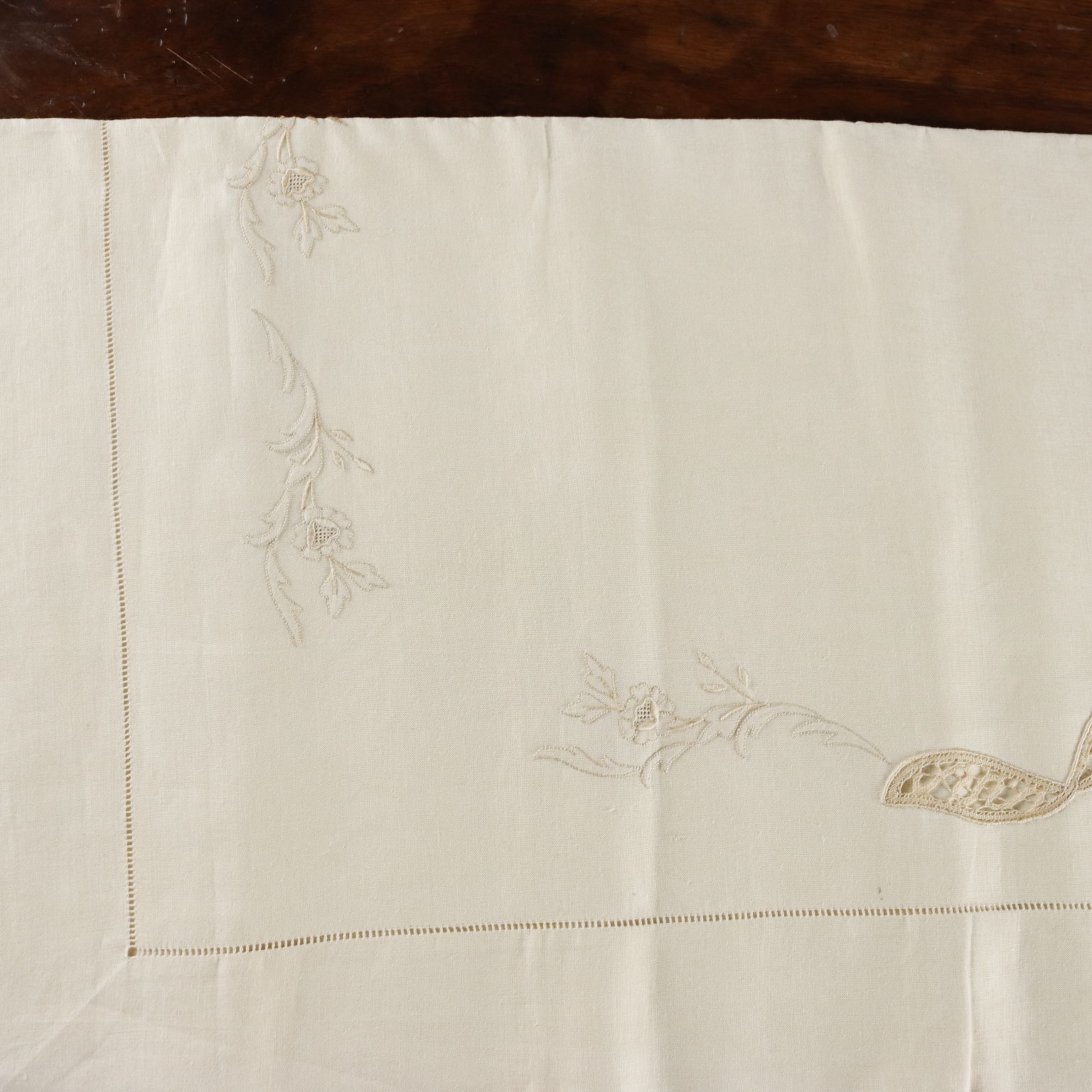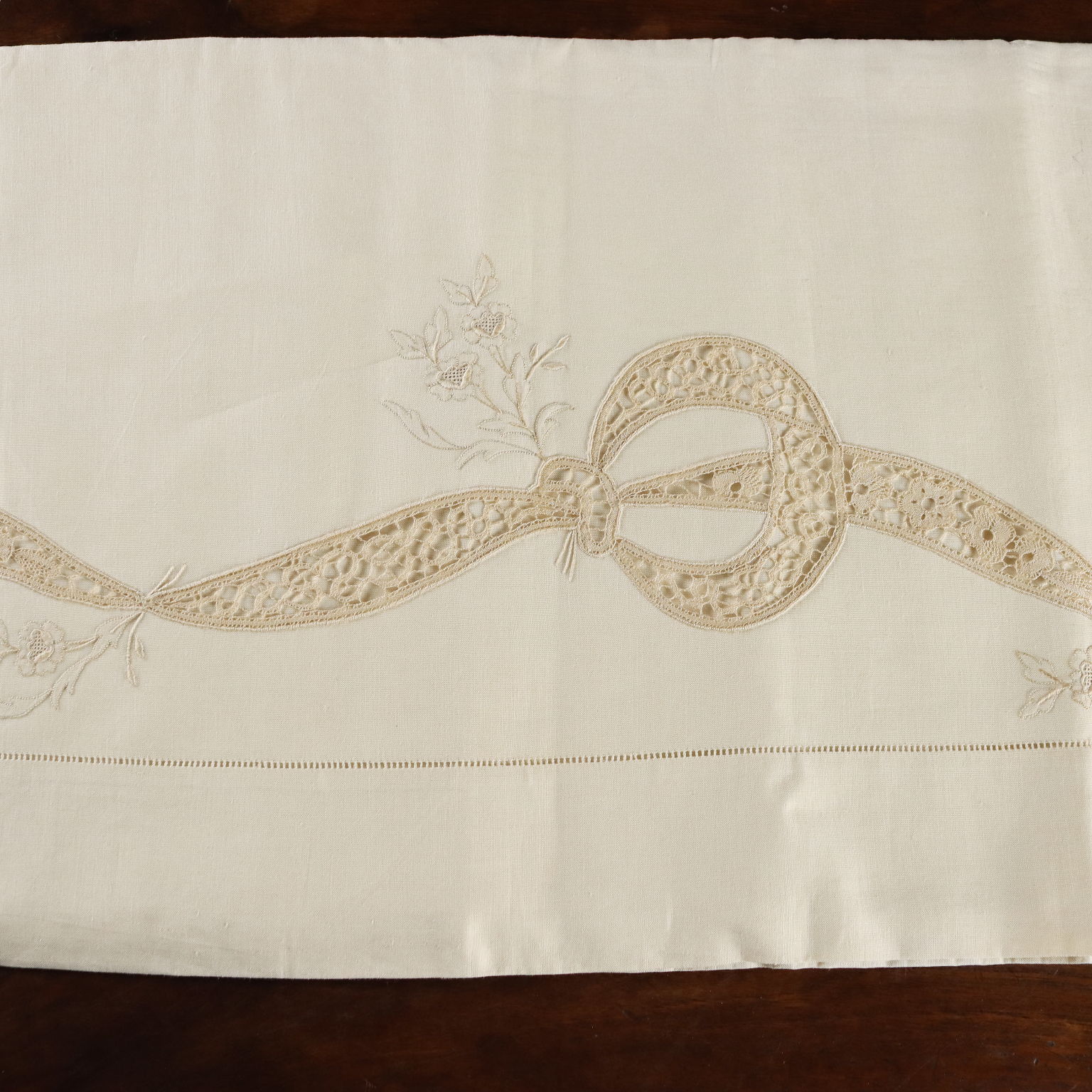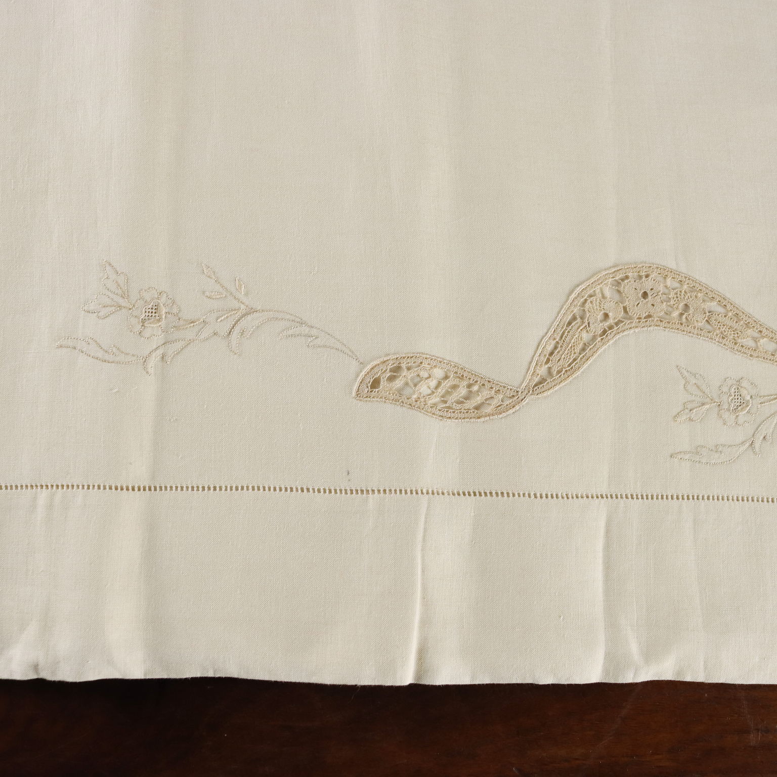 Sábana de lino con dos fundas de almohada, puntada de satén, puntada de sombra e inserciones de encaje Cantù. Presenta ligeras marcas del paso del tiempo.