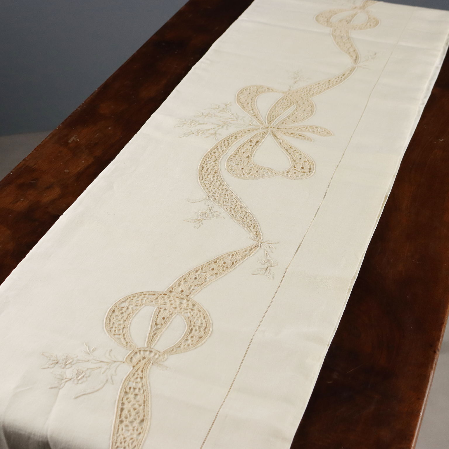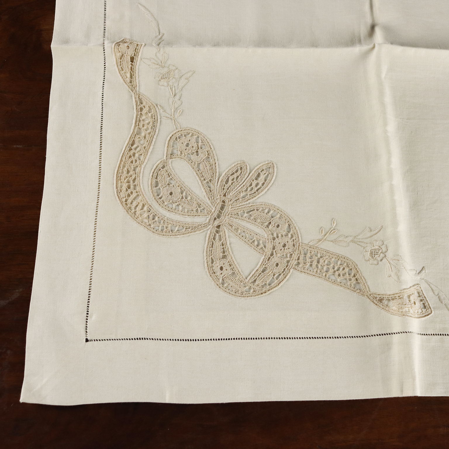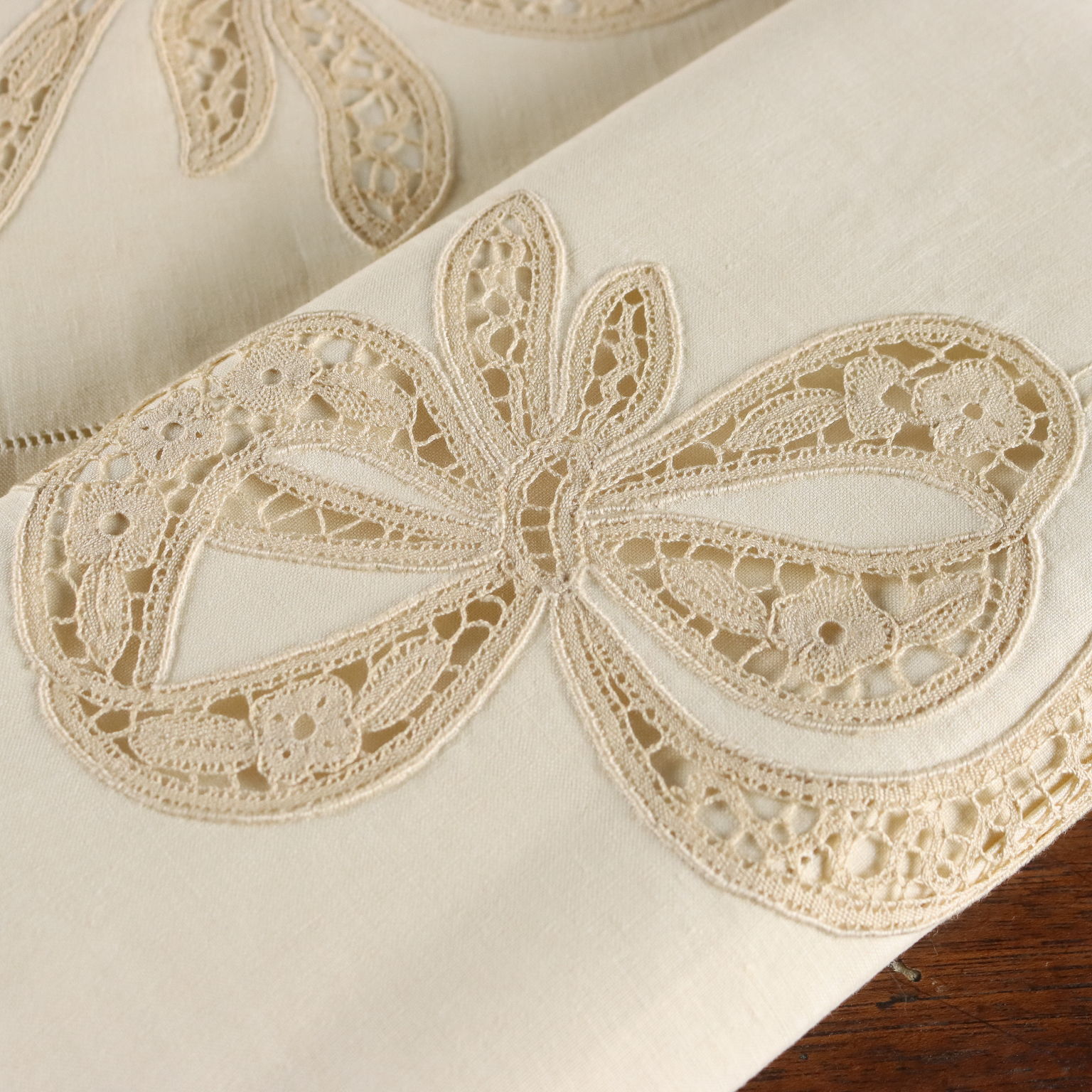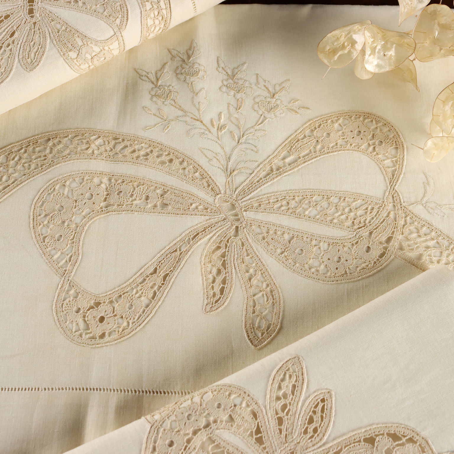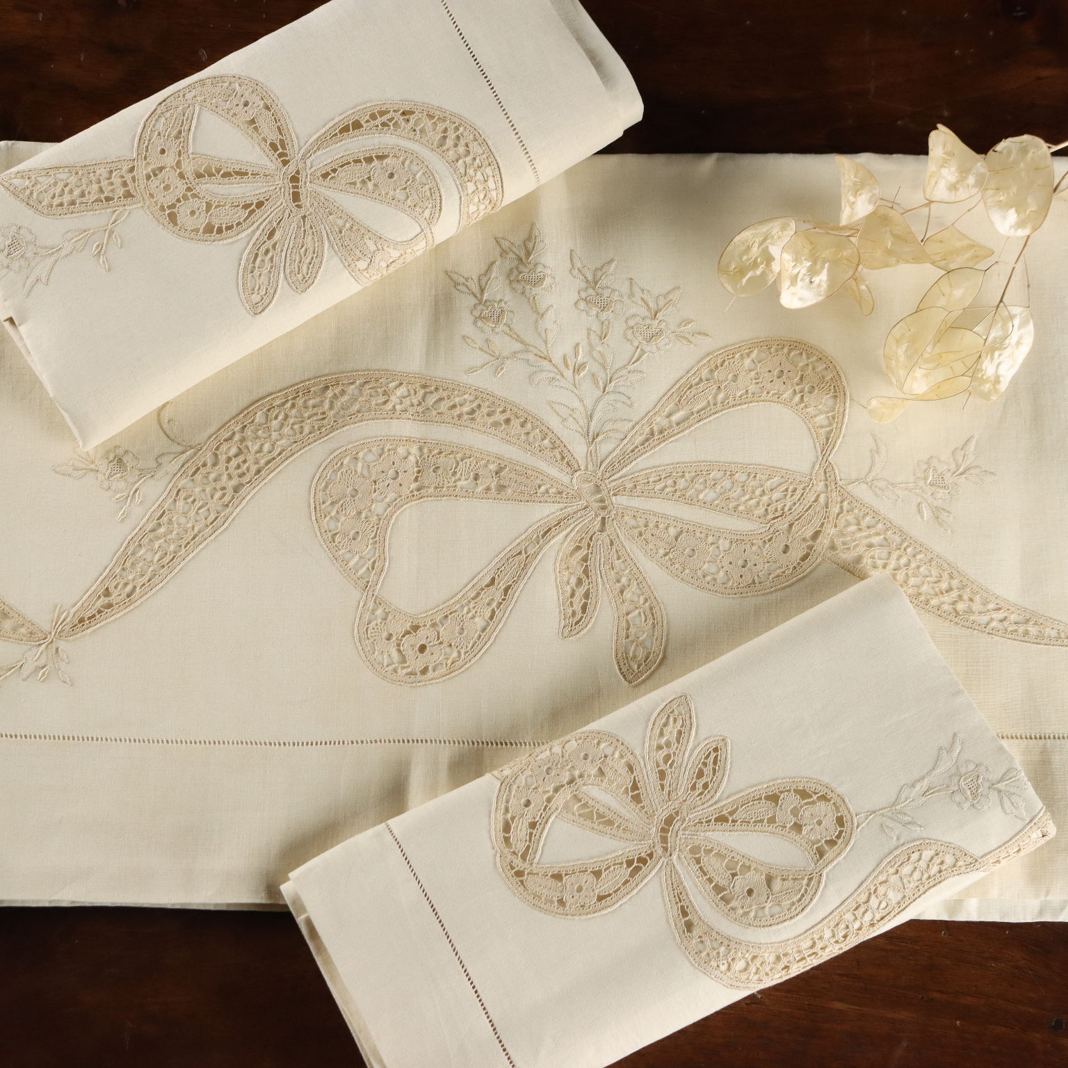 Sábana de lino con dos fundas de almohada, puntada de satén, puntada de sombra e inserciones de encaje Cantù. Presenta ligeras marcas del paso del tiempo.
