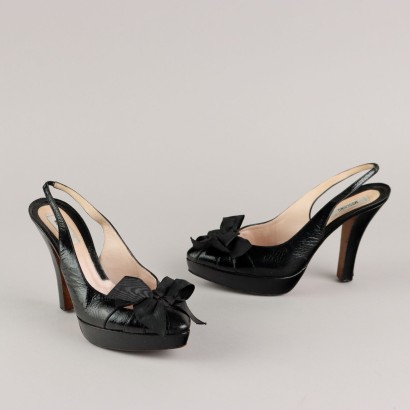 Chaussures en cuir verni fuchsia, avec détail chaîne en métal sur le bout. Le cuir est en bon état, avec seulement quelques légères traces d'utilisation. Semelles et talons présentant des traces d'utilisation.