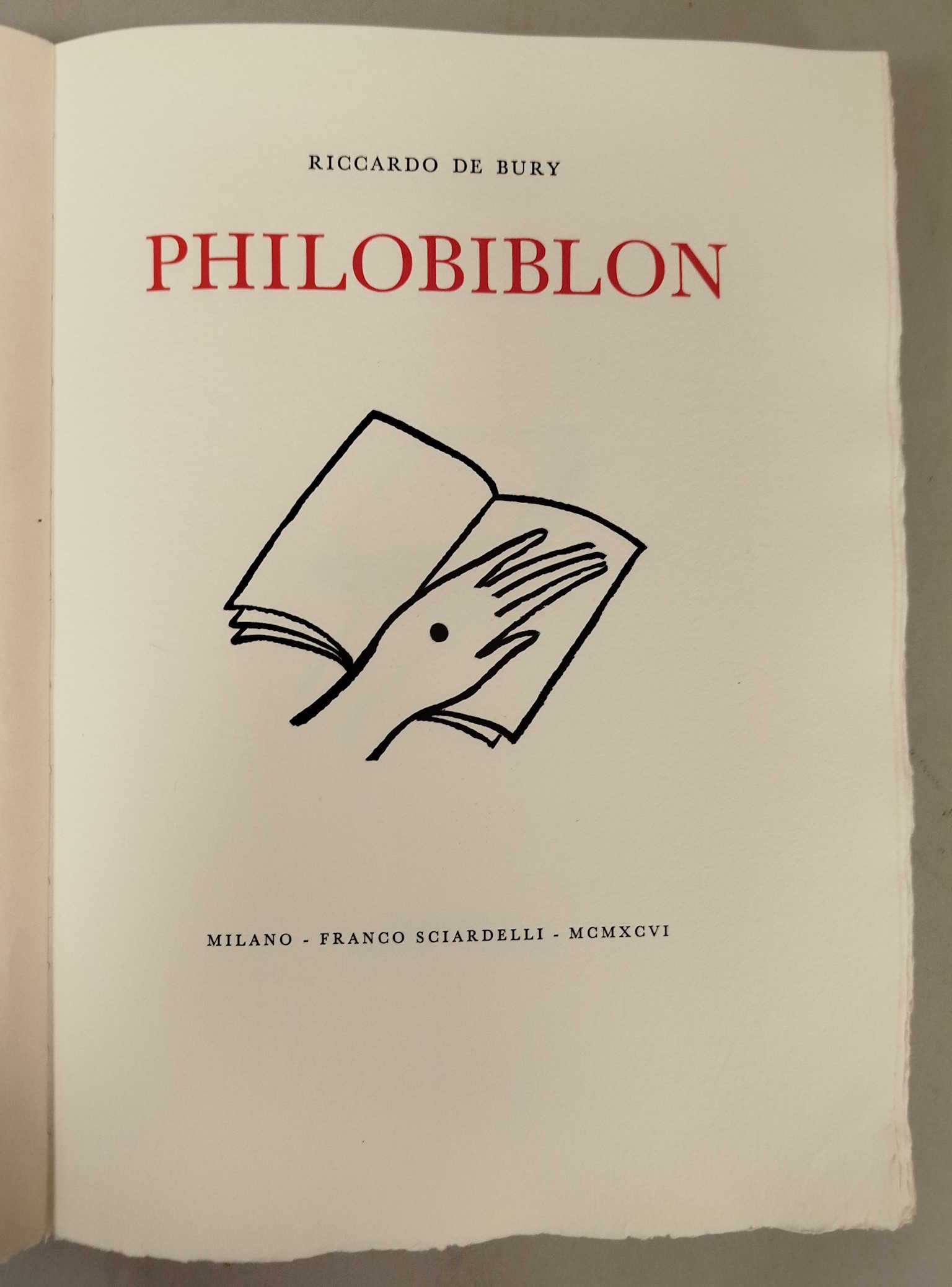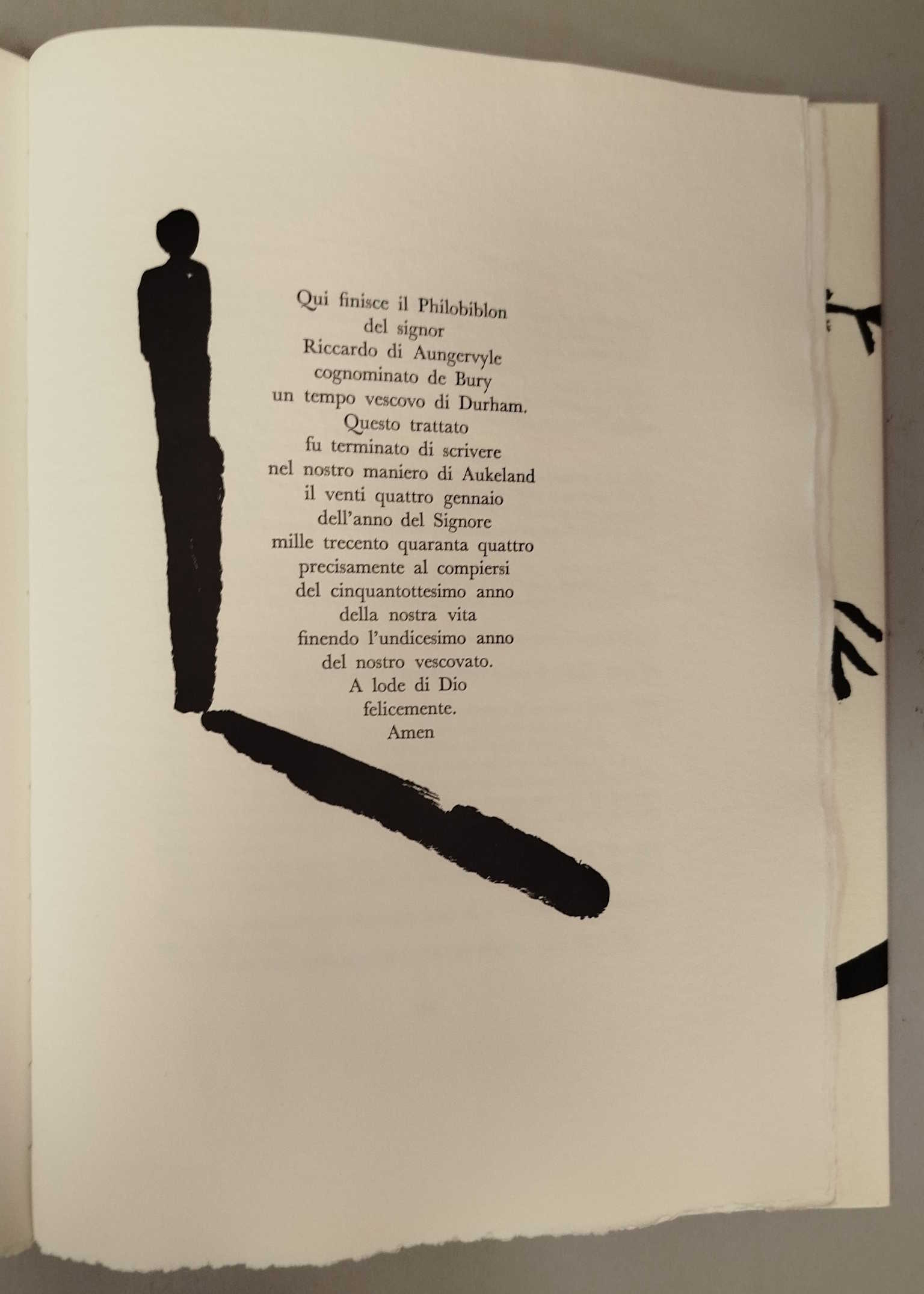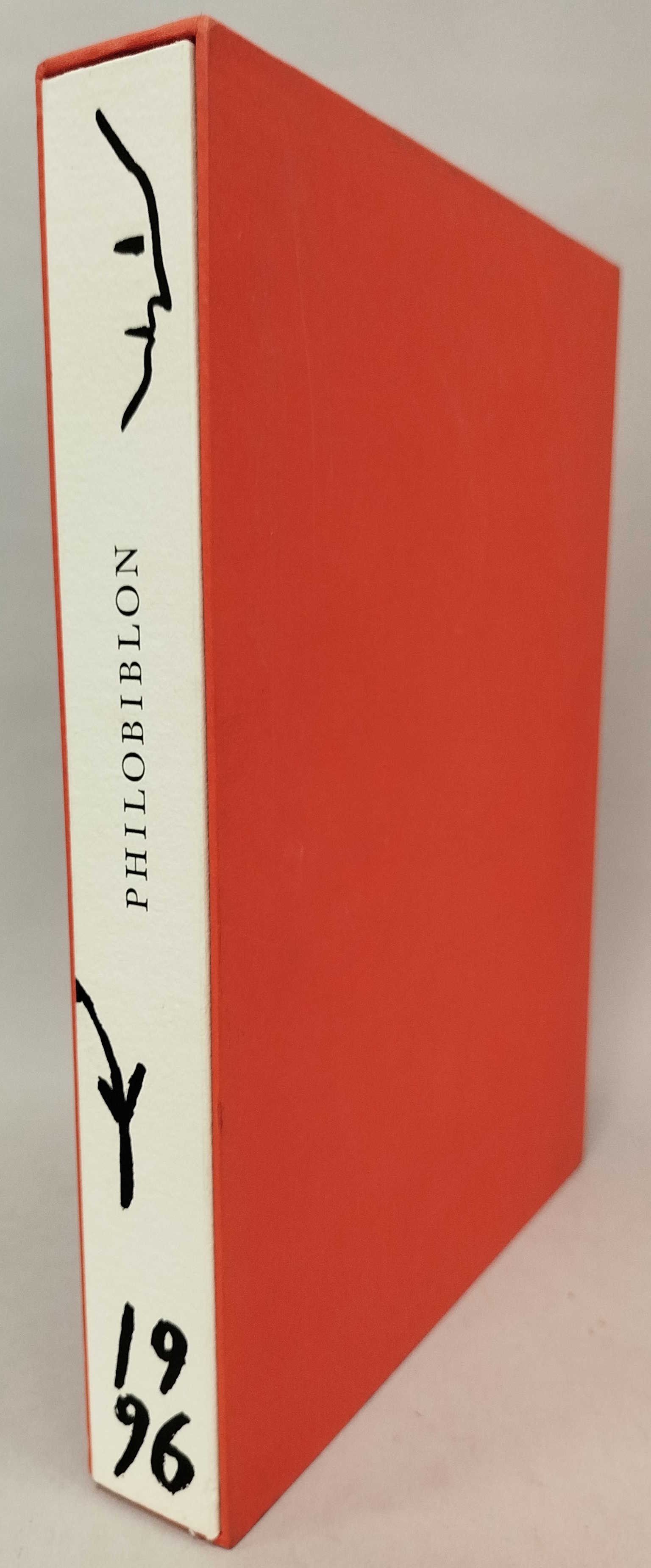 Splendide édition illustrée par Mimmo Paladino de ce qui est considéré comme le plus ancien traité de bibliophilie, œuvre de Richard de Bury (1287-1354), ambassadeur à la cour papale d'Avignon, où il rencontra Pétrarque. Il fut également chancelier du roi Édouard III, évêque de Durham, et précurseur des humanistes, passionné de manuscrits anciens. Il possédait également une importante bibliothèque, qu'il illustra dans son Philobiblon, ouvrage largement diffusé, même sous forme manuscrite (45 codex sont connus), et dont la première impression fut réalisée à Cologne en 1473. Franco Sciardelli nous offre une précieuse édition dans la version de Francesco Tissoni, avec une introduction de Gianmarco Gaspari et une pointe sèche originale en frontispice signée au crayon, ainsi que 60 gravures sur bois de Mimmo Paladino. Le colophon justifie l'édition : Cette édition est illustrée d'une gravure originale de Mimmo Paladino et de soixante gravures sur bois spécialement conçues par l'artiste et gravées sur bois de bout par Adriano Porazzi. Le tirage total est de 125 exemplaires, dont 100 chiffres arabes, vingt chiffres romains et cinq personnalisés. Le texte a été composé en caractères Baskerville et imprimé par Ruggero Olivieri sur papier Alcantara filigrané par l'artiste, fabriqué à Tino par Cartiera Sicars. La reliure a été réalisée par Giovanni De Stefanis. La gravure à la pointe sèche a été pressée à la main par Franco Sciardelli sur papier Japon. Notre exemplaire porte le numéro 74.