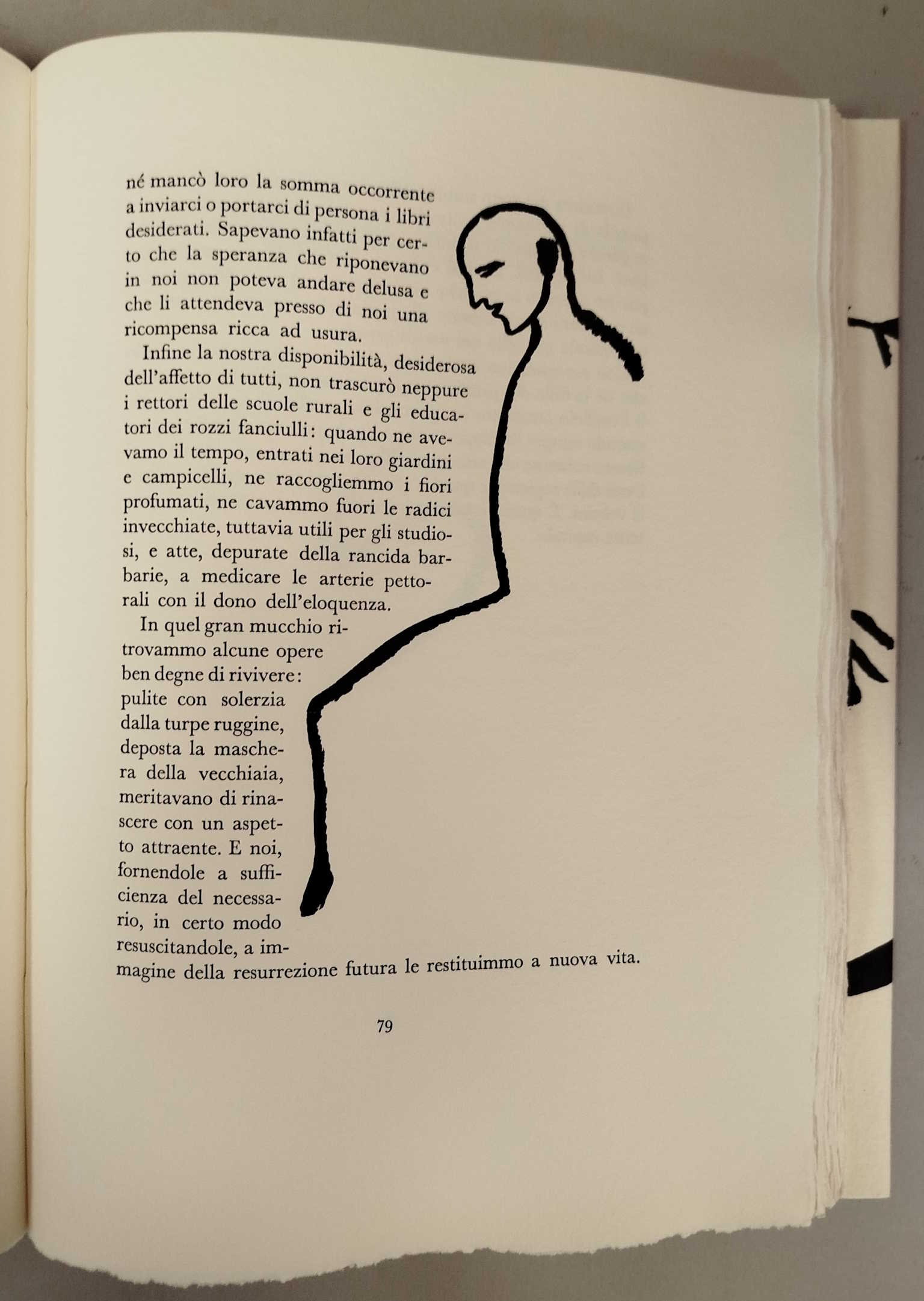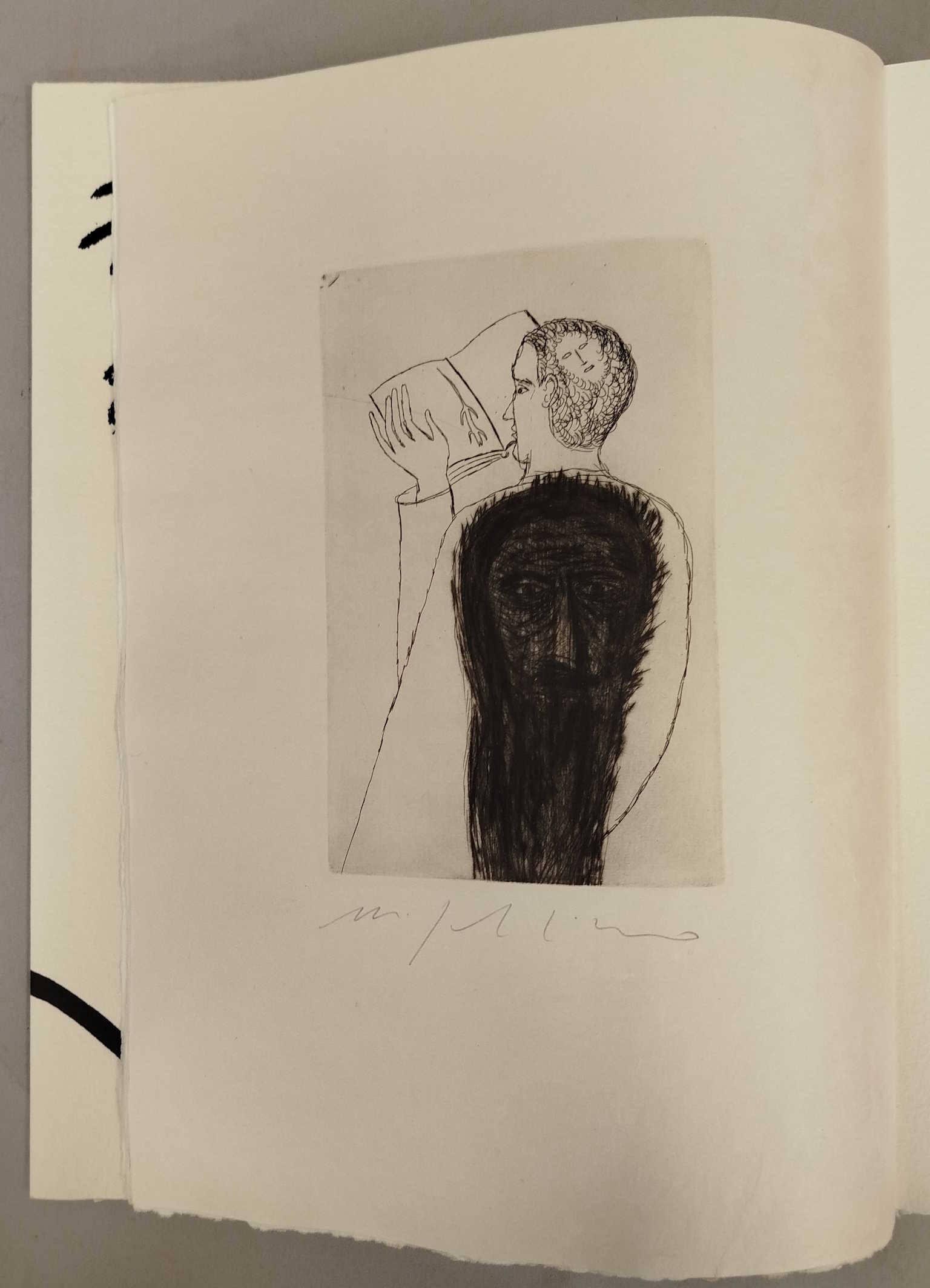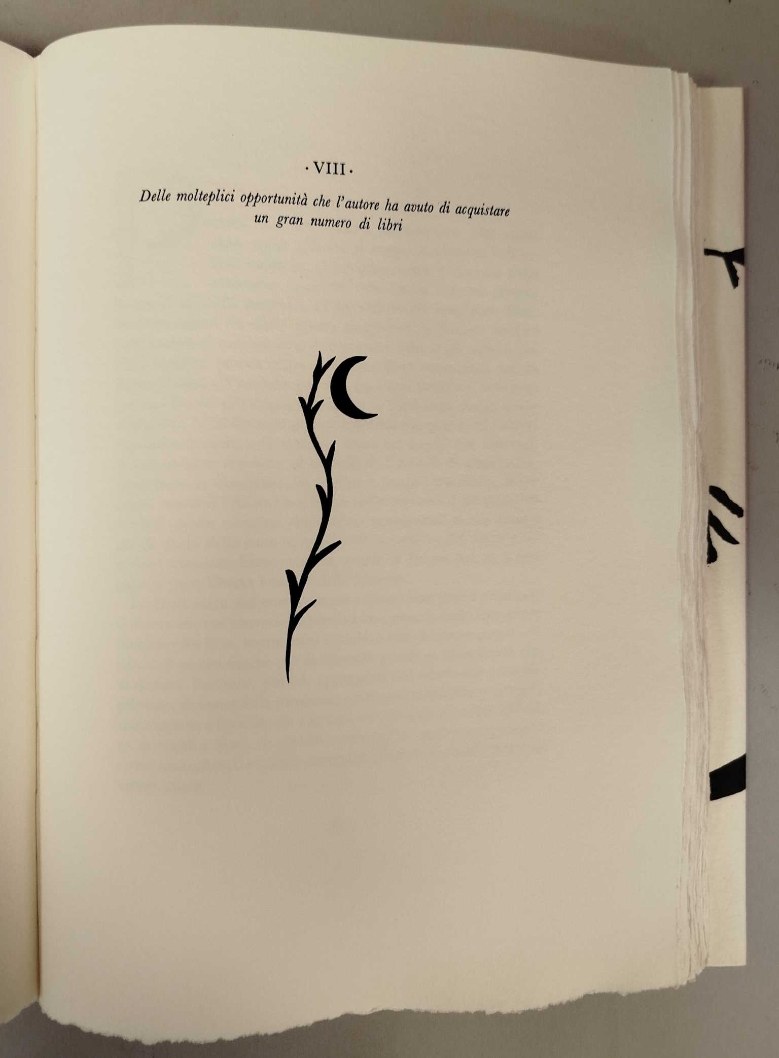 Splendide édition illustrée par Mimmo Paladino de ce qui est considéré comme le plus ancien traité de bibliophilie, œuvre de Richard de Bury (1287-1354), ambassadeur à la cour papale d'Avignon, où il rencontra Pétrarque. Il fut également chancelier du roi Édouard III, évêque de Durham, et précurseur des humanistes, passionné de manuscrits anciens. Il possédait également une importante bibliothèque, qu'il illustra dans son Philobiblon, ouvrage largement diffusé, même sous forme manuscrite (45 codex sont connus), et dont la première impression fut réalisée à Cologne en 1473. Franco Sciardelli nous offre une précieuse édition dans la version de Francesco Tissoni, avec une introduction de Gianmarco Gaspari et une pointe sèche originale en frontispice signée au crayon, ainsi que 60 gravures sur bois de Mimmo Paladino. Le colophon justifie l'édition : Cette édition est illustrée d'une gravure originale de Mimmo Paladino et de soixante gravures sur bois spécialement conçues par l'artiste et gravées sur bois de bout par Adriano Porazzi. Le tirage total est de 125 exemplaires, dont 100 chiffres arabes, vingt chiffres romains et cinq personnalisés. Le texte a été composé en caractères Baskerville et imprimé par Ruggero Olivieri sur papier Alcantara filigrané par l'artiste, fabriqué à Tino par Cartiera Sicars. La reliure a été réalisée par Giovanni De Stefanis. La gravure à la pointe sèche a été pressée à la main par Franco Sciardelli sur papier Japon. Notre exemplaire porte le numéro 74.