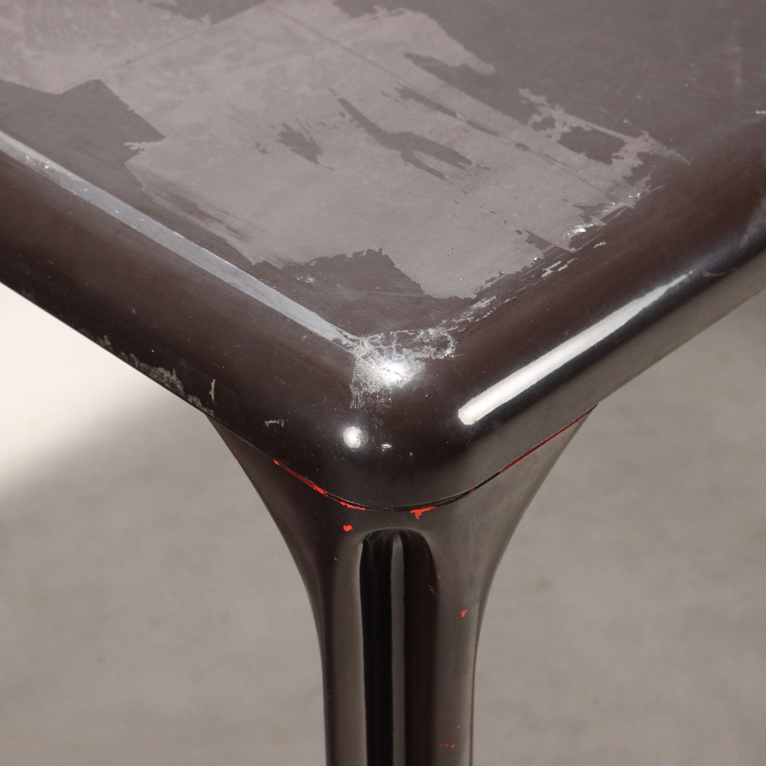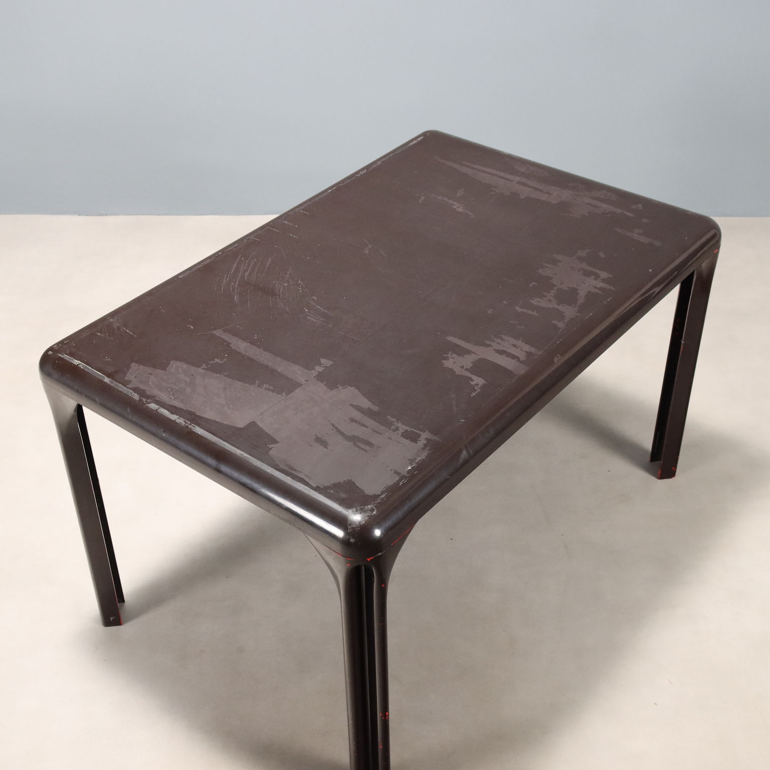 Table à manger vintage en plastique avec plateau rectangulaire et angles arrondis. En bon état, avec quelques traces d'usure, elle pourrait être restaurée.