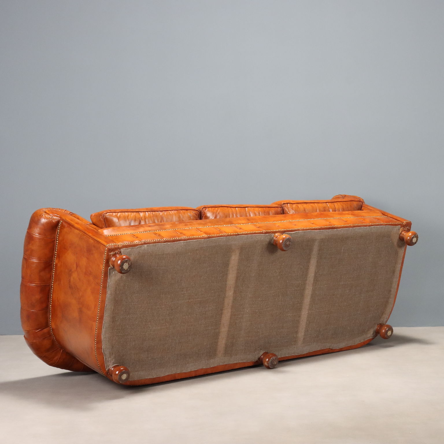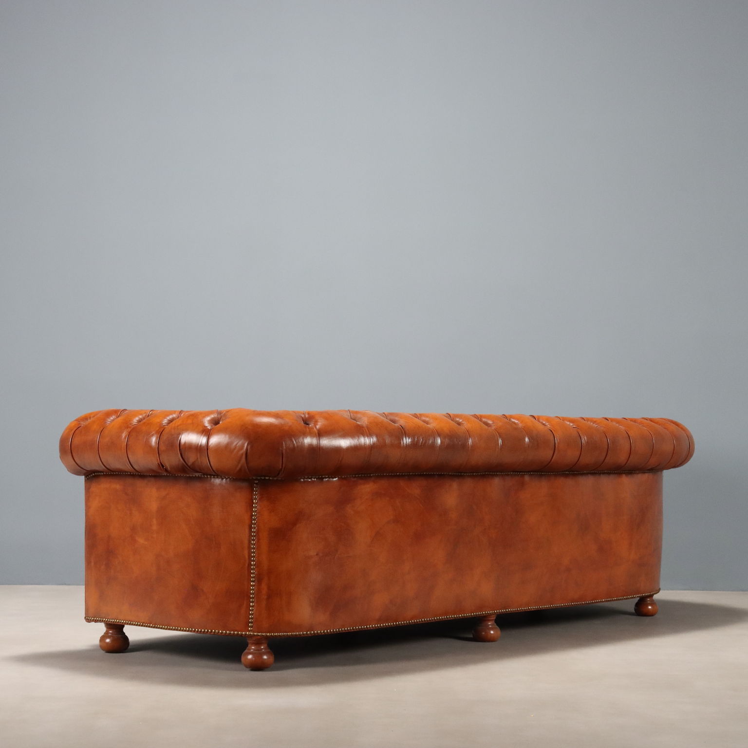 Canapé 3 places de style Chesterfield. Cuir brun tanné avec finition boutonnée, clous dorés et pieds bulbe en hêtre teinté noyer. Italie, XXe siècle.