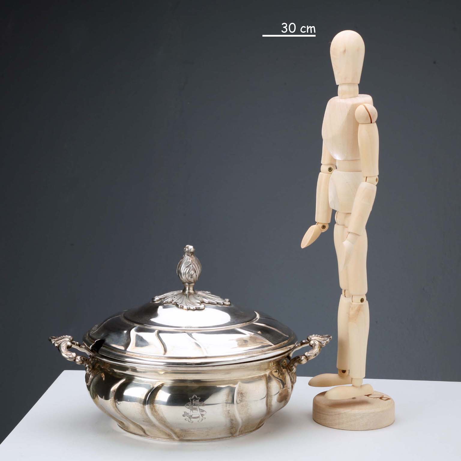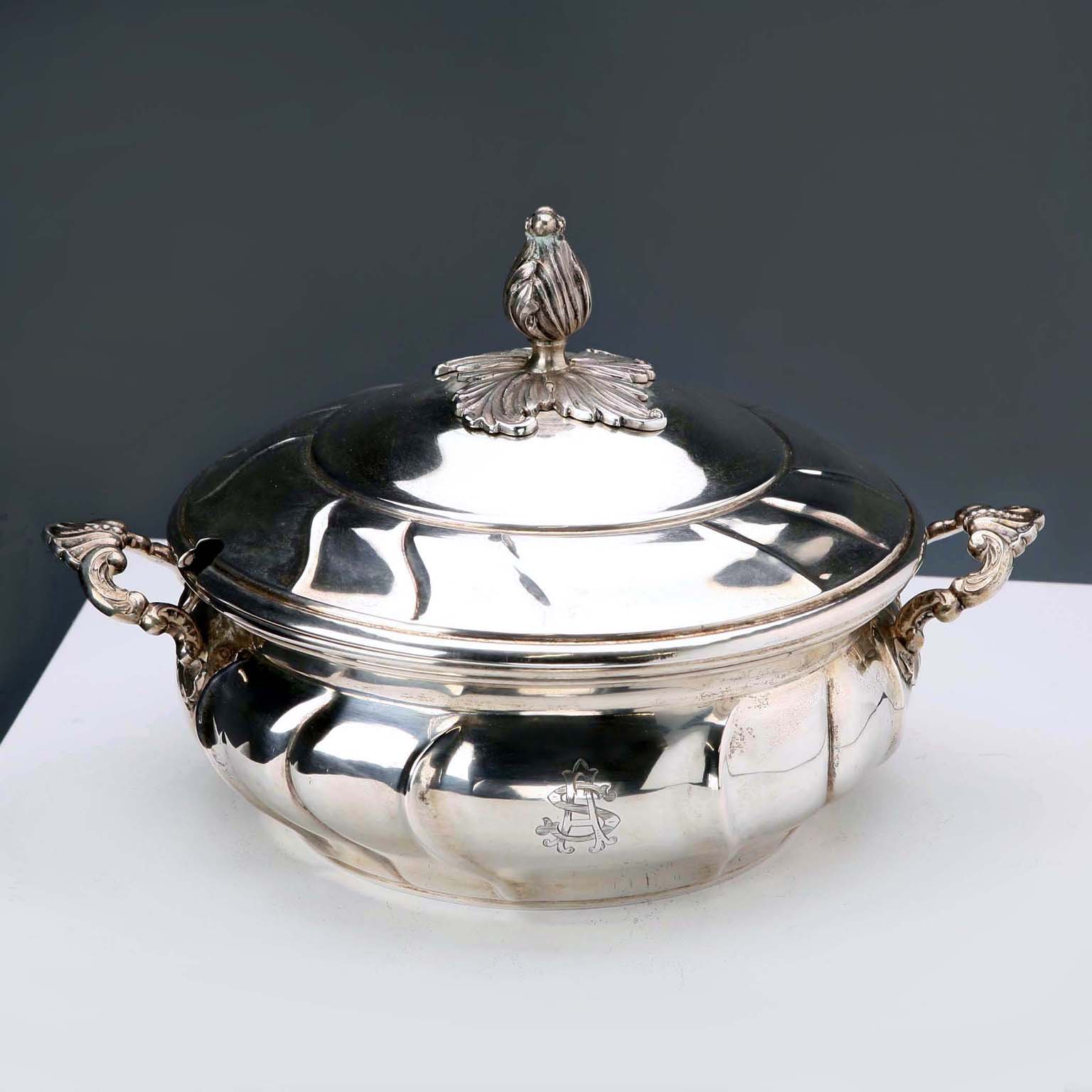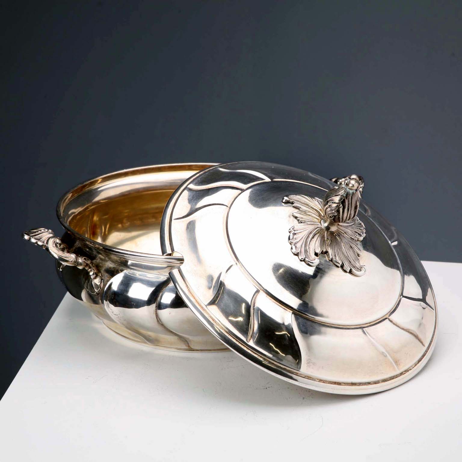 Légumier en argent 830 repoussé, cannelé et ciselé. Anse en bourgeon et anses à rinceaux feuillagés. Poinçons d'argent et d'orfèvre gravés sous la base. Poids : 590 grammes.