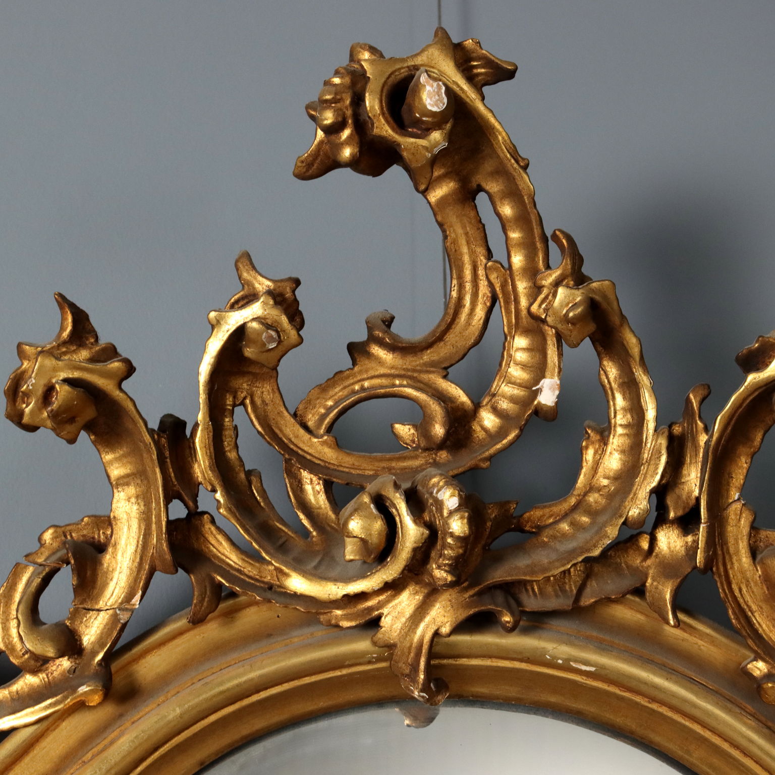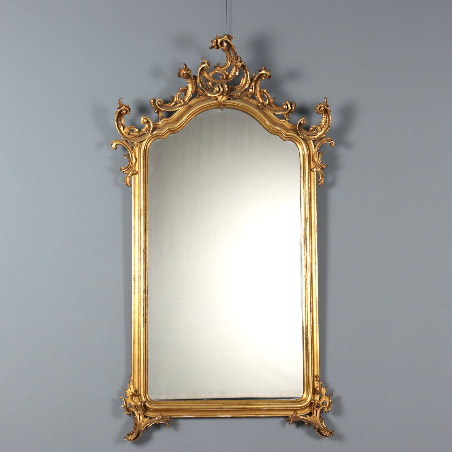 Miroir en bois sculpté et doré. Le cadre moulé est orné de motifs rocaille en volutes et en feuilles, en haut et en bas. Italie, milieu du XXe siècle.