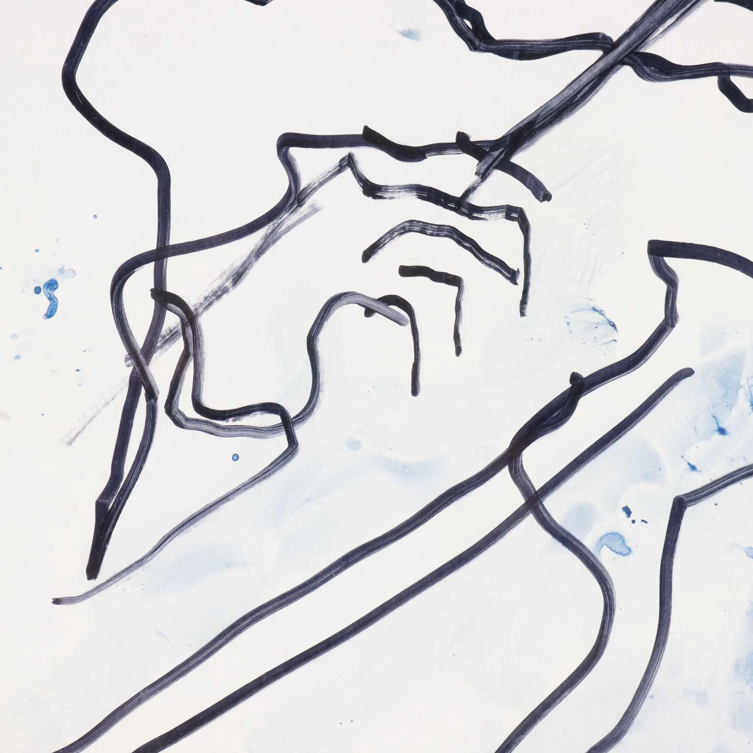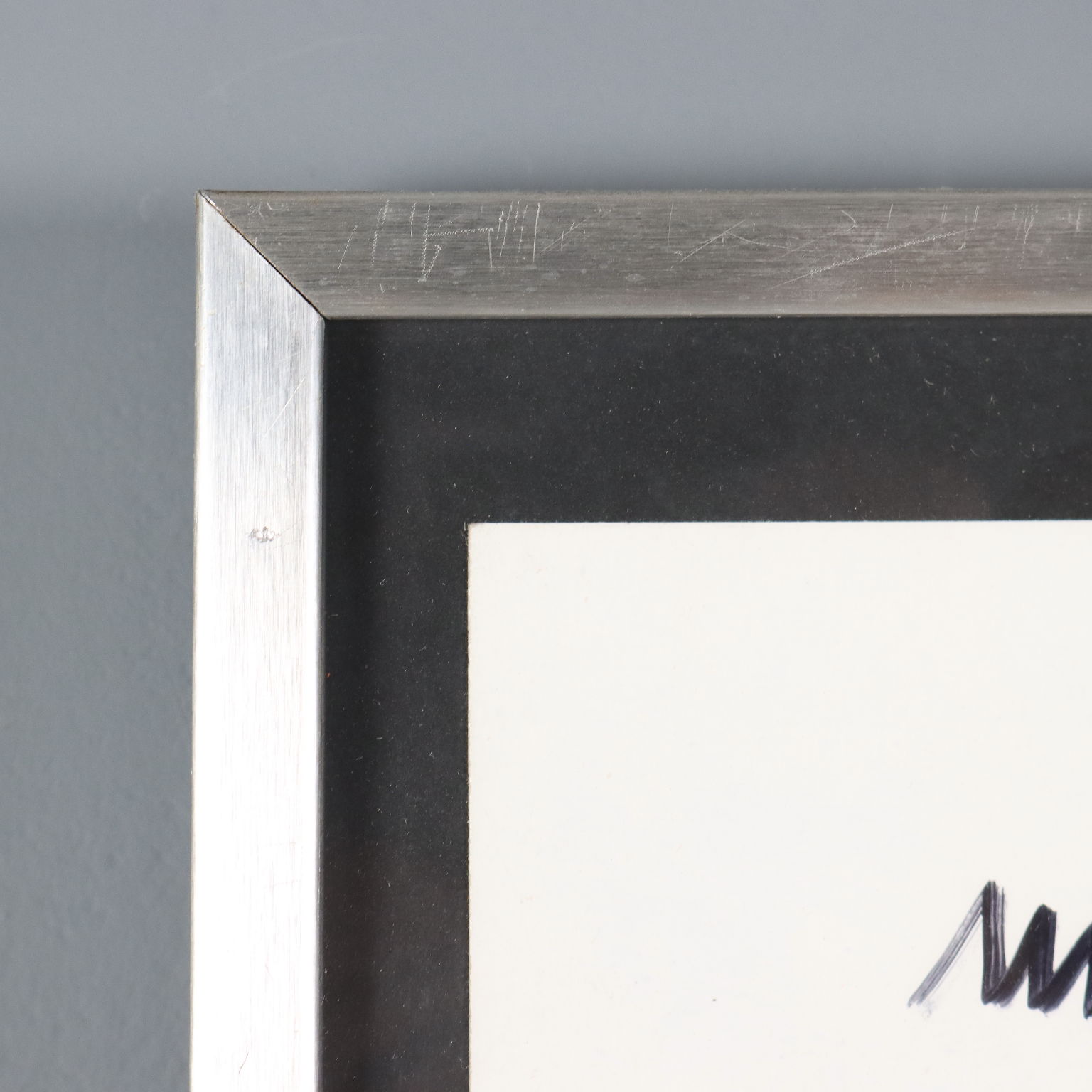 Aquarelle et marqueur sur papier. Signée en bas à droite, avec l'ajout de la description « presque aveugle » ; titre en haut. L'œuvre est accompagnée d'une photo authentifiée par la Fondation du Musée Luciano Minguzzi. Sculpteur, graveur et médailleur, Minguzzi a également réalisé de nombreux dessins, souvent des esquisses pour des sculptures. Ce dessin est présenté dans un cadre.