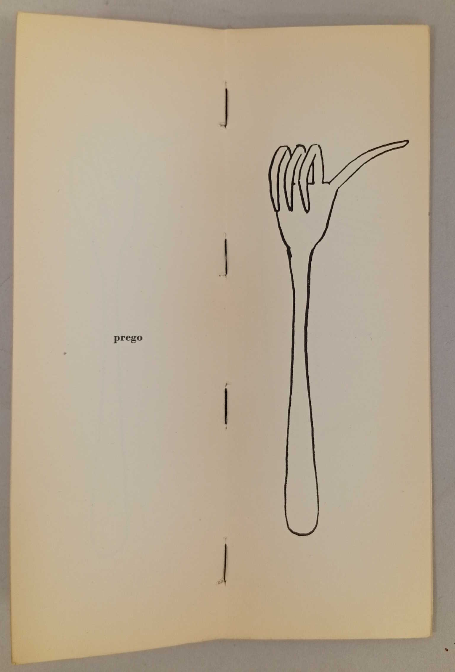 28 dessins en noir et blanc de Bruno Munari : le recto des cartes représente des fourchettes, et le verso présente les légendes de l’auteur en italien, anglais, français et japonais. Le texte japonais de la page 11 (la seule page numérotée) a été écrit par Katzky Iwabuchi et se traduit par « Une chose en entraîne une autre ». Le texte d’introduction se lit comme suit : « Ces variations sur la fourchette, ou plutôt sur la fourchette comme “extension” de la main et, finalement, comme main, ont été dessinées par Bruno Munari sans but pratique, simplement pour laisser libre cours à son imagination sur un thème apparemment aride, mais dans le contexte d’un problème structurel typiquement européen, afin d’établir un langage garant de guérison. »