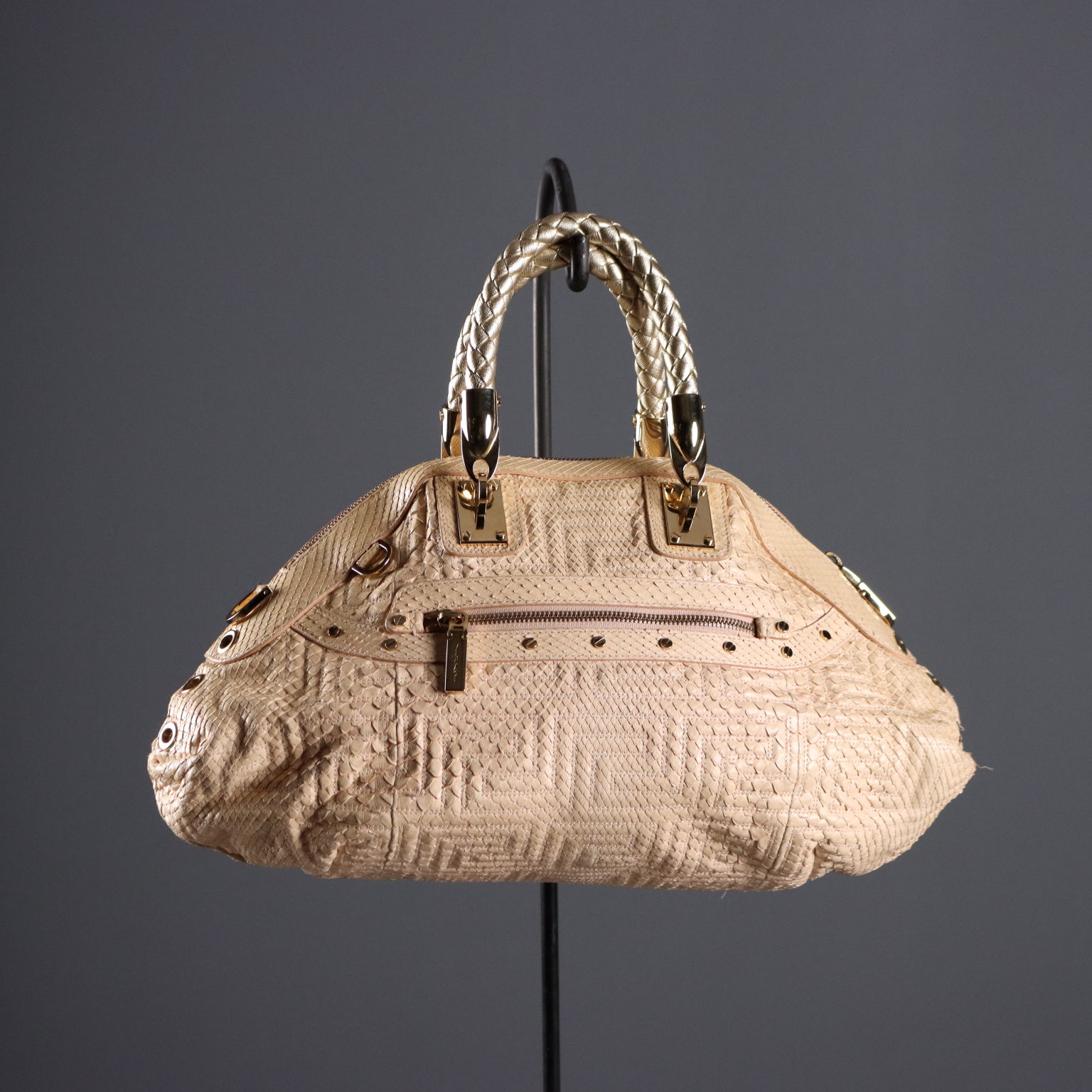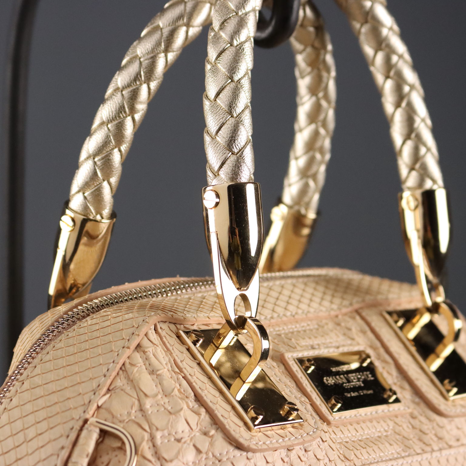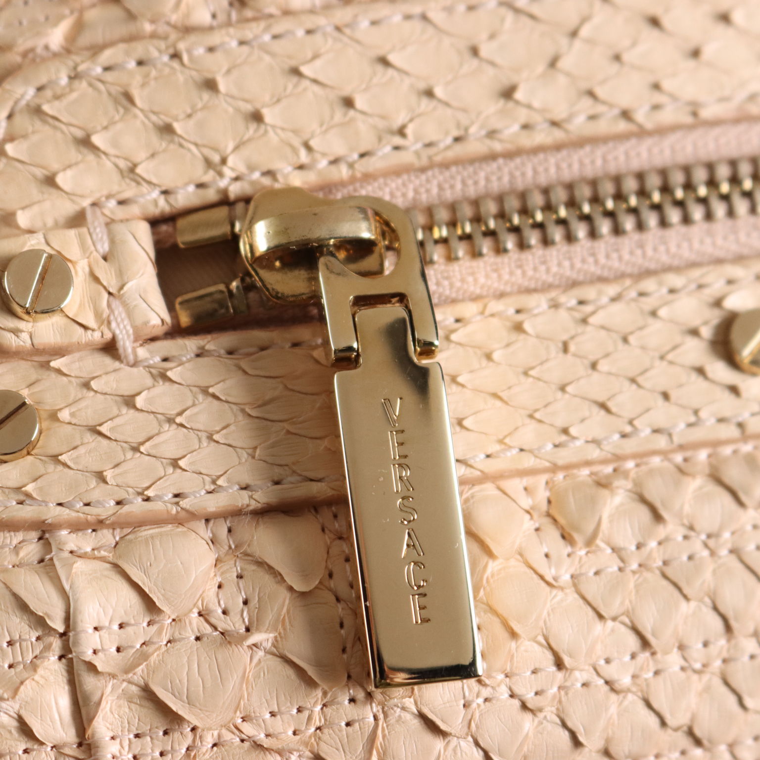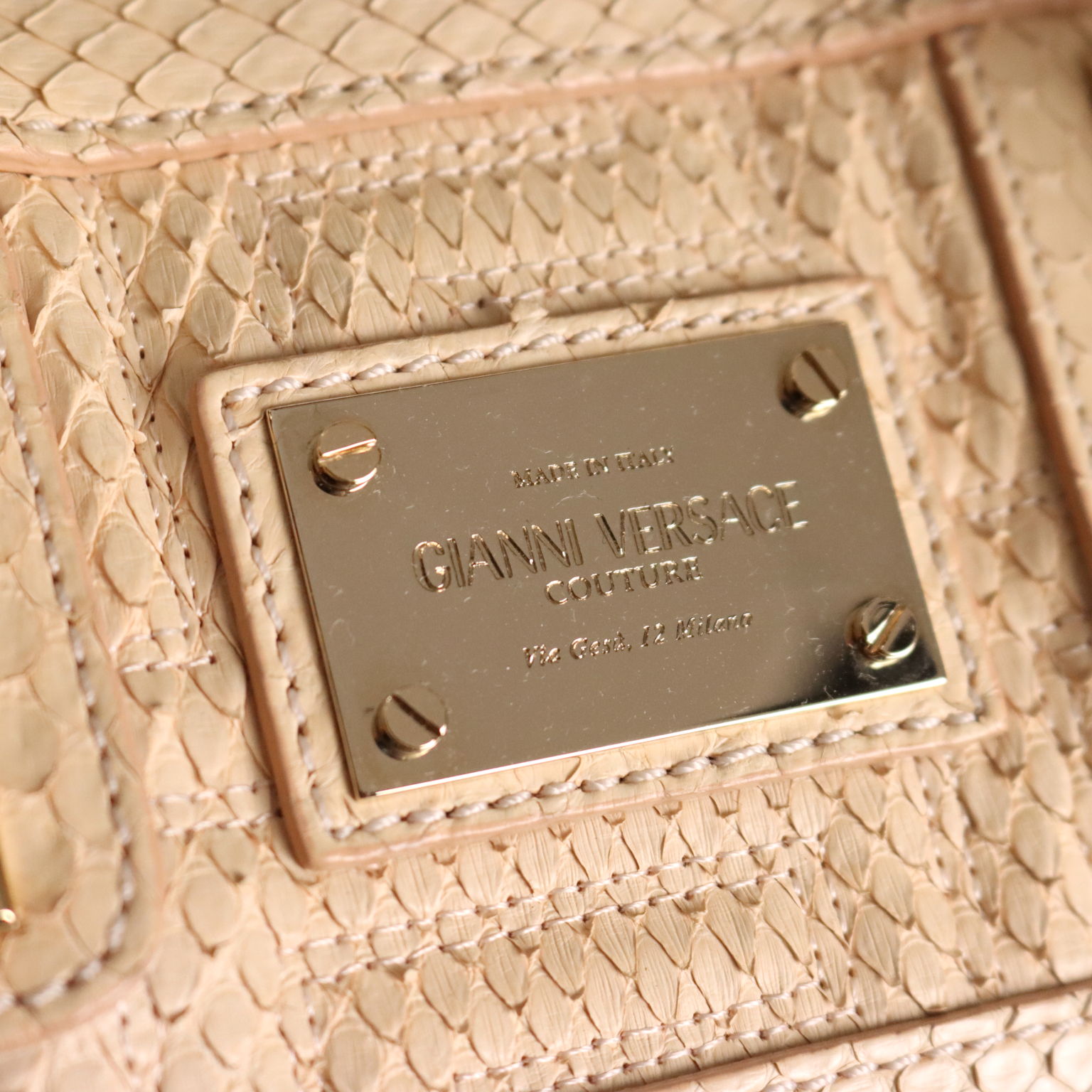 Sac en cuir de python orné d'un motif de clé grecque et de clous métalliques. Les anses sont en cuir tressé. L'extérieur est doté de deux poches zippées, tandis que l'intérieur est doublé et comprend trois petites poches. Des crochets pour attacher une bandoulière (non incluse) sont inclus. Housse de protection incluse.