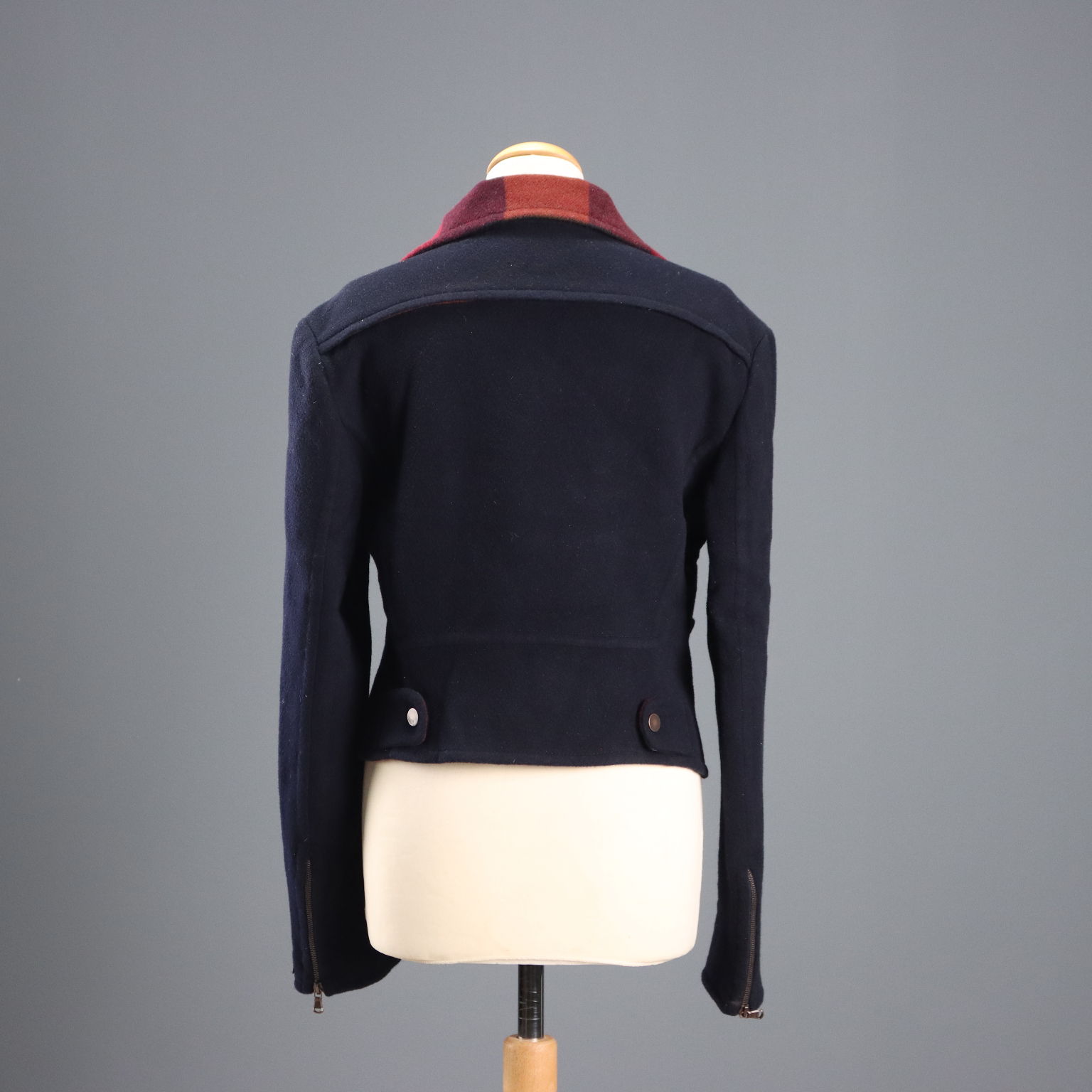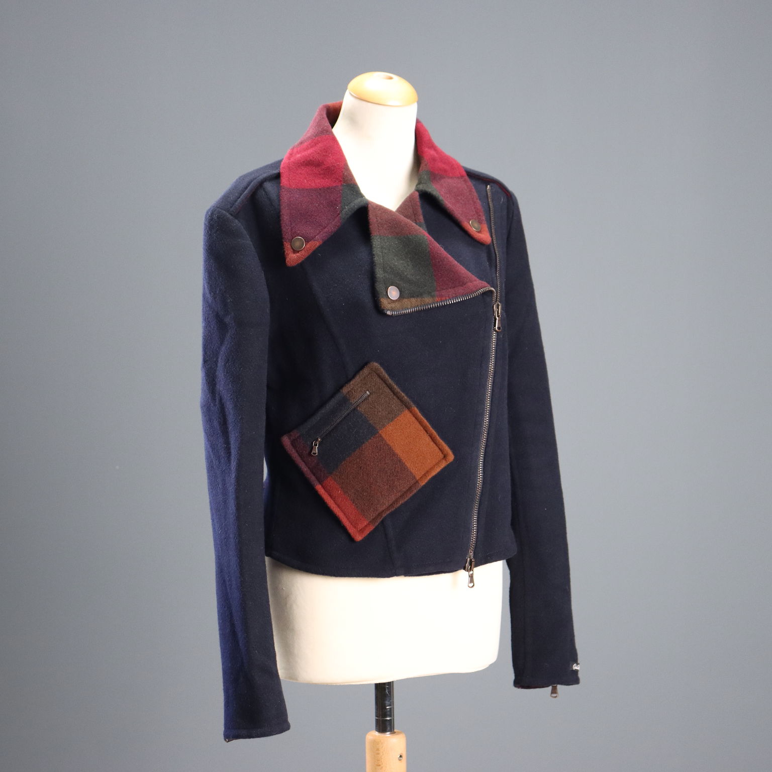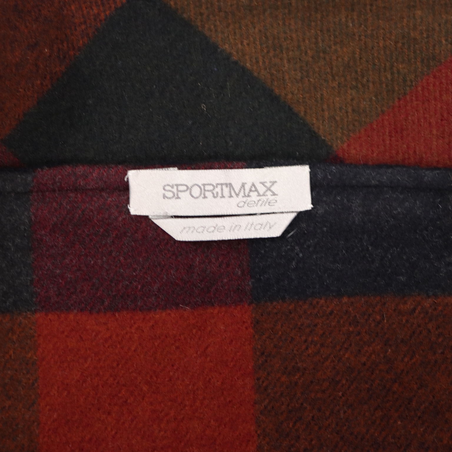 Veste en laine et angora ultra douces de la ligne Sportmax Défilé. Le col et la poche sont distinctifs, tout comme la doublure, ornée d'un imprimé à carreaux dans les tons bordeaux et marron. Les manches sont doublées. Longueur : 53 cm. Longueur des manches : 66 cm. Emmanchure : 47 cm. Largeur des épaules : 43 cm.