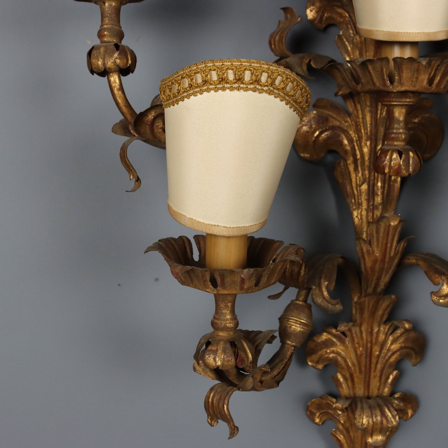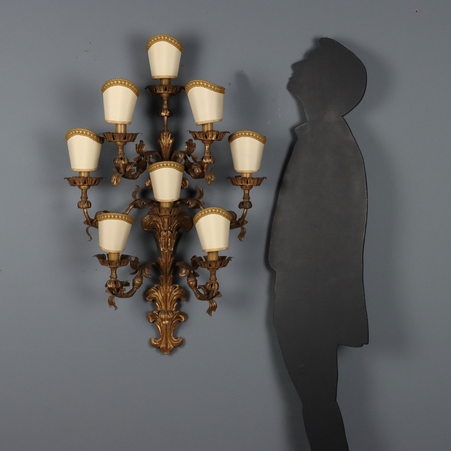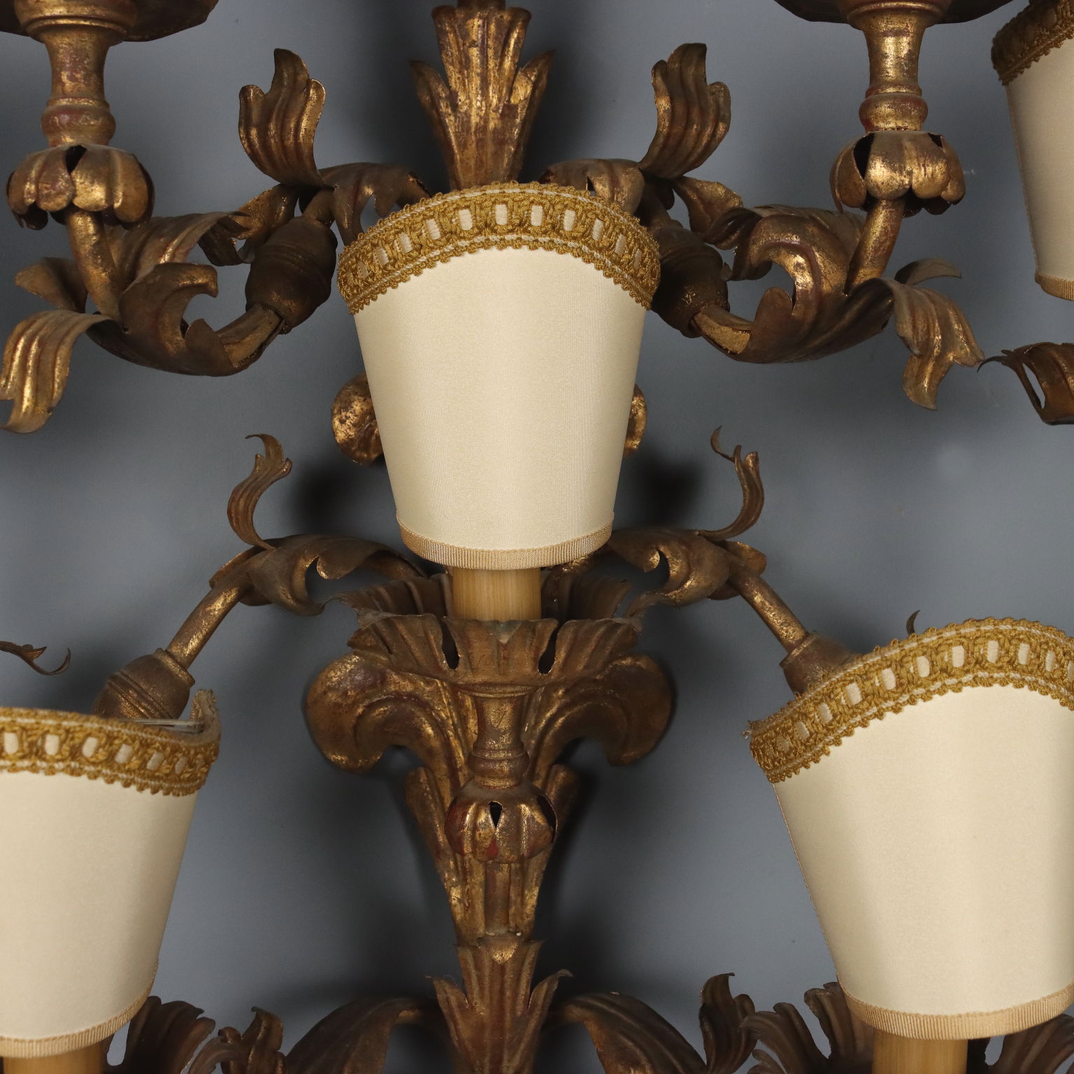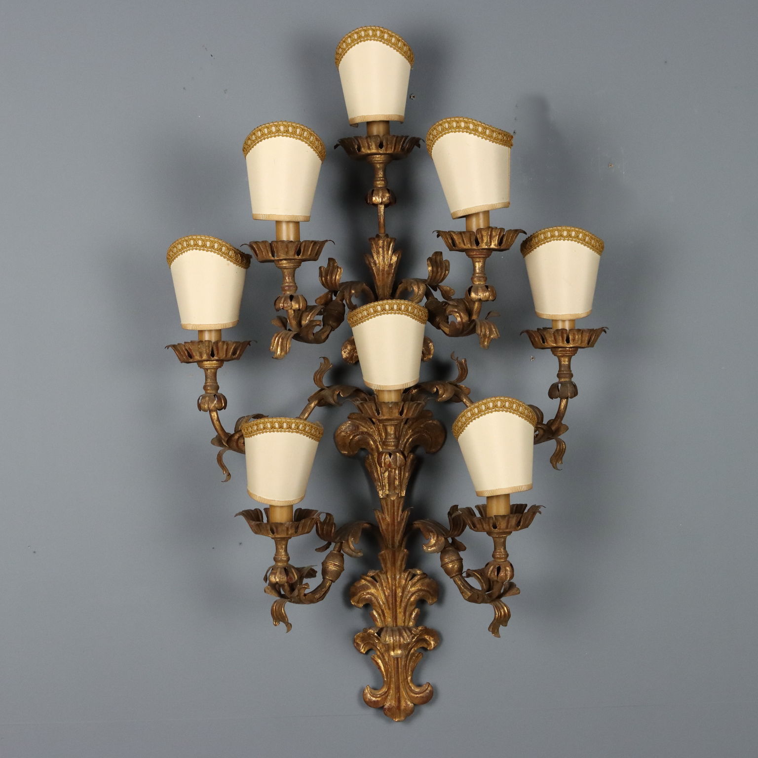 Applique en fer forgé et tôle, ornée de feuilles et de dorures. Huit lumières soutenues par des bras courbes, disposées sur un double support, abat-jour en tissu. Elle fonctionne avec huit ampoules E14. Italie, XIXe siècle.