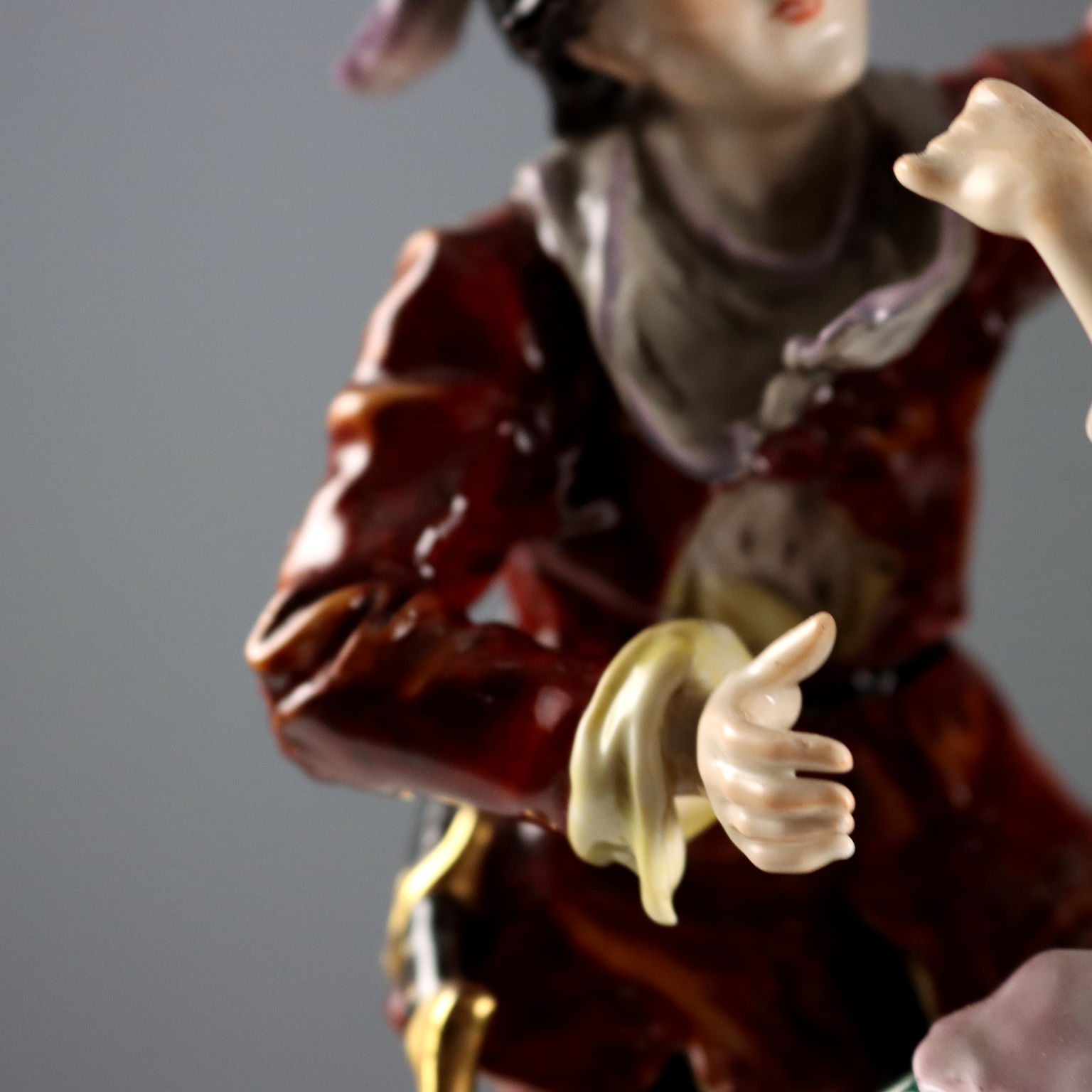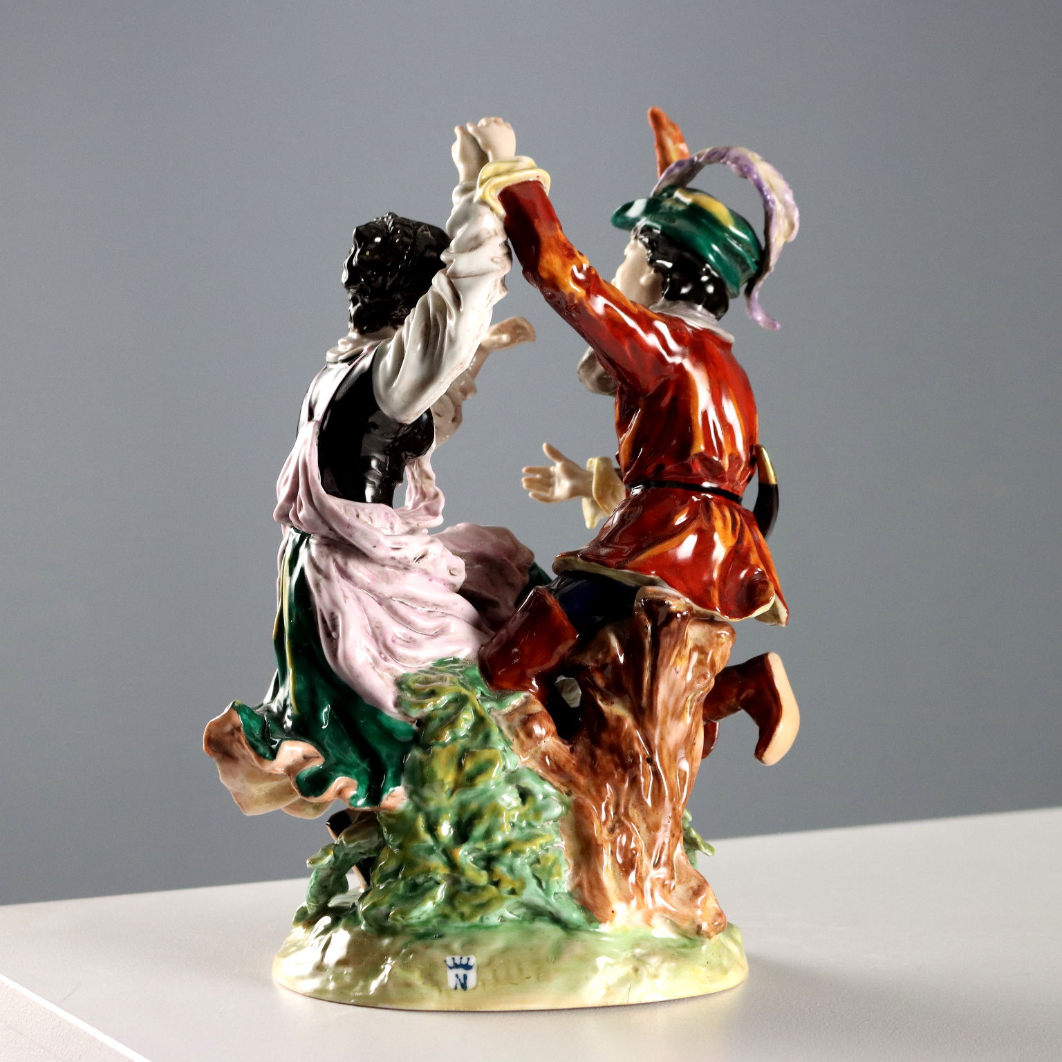 Groupe en porcelaine polychrome représentant un couple de roturiers dansant. Marque du fabricant en bleu sous couverte derrière la base.