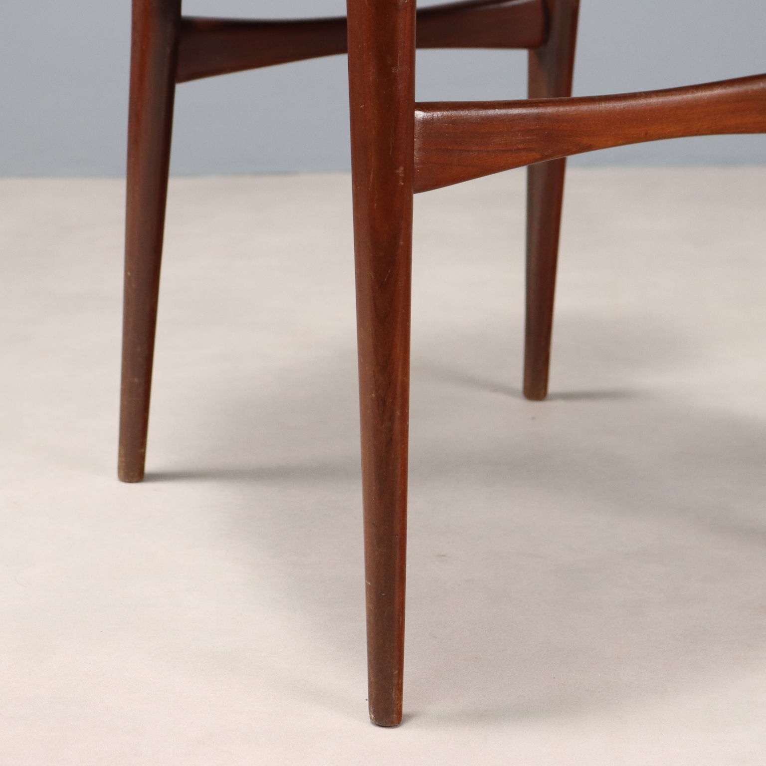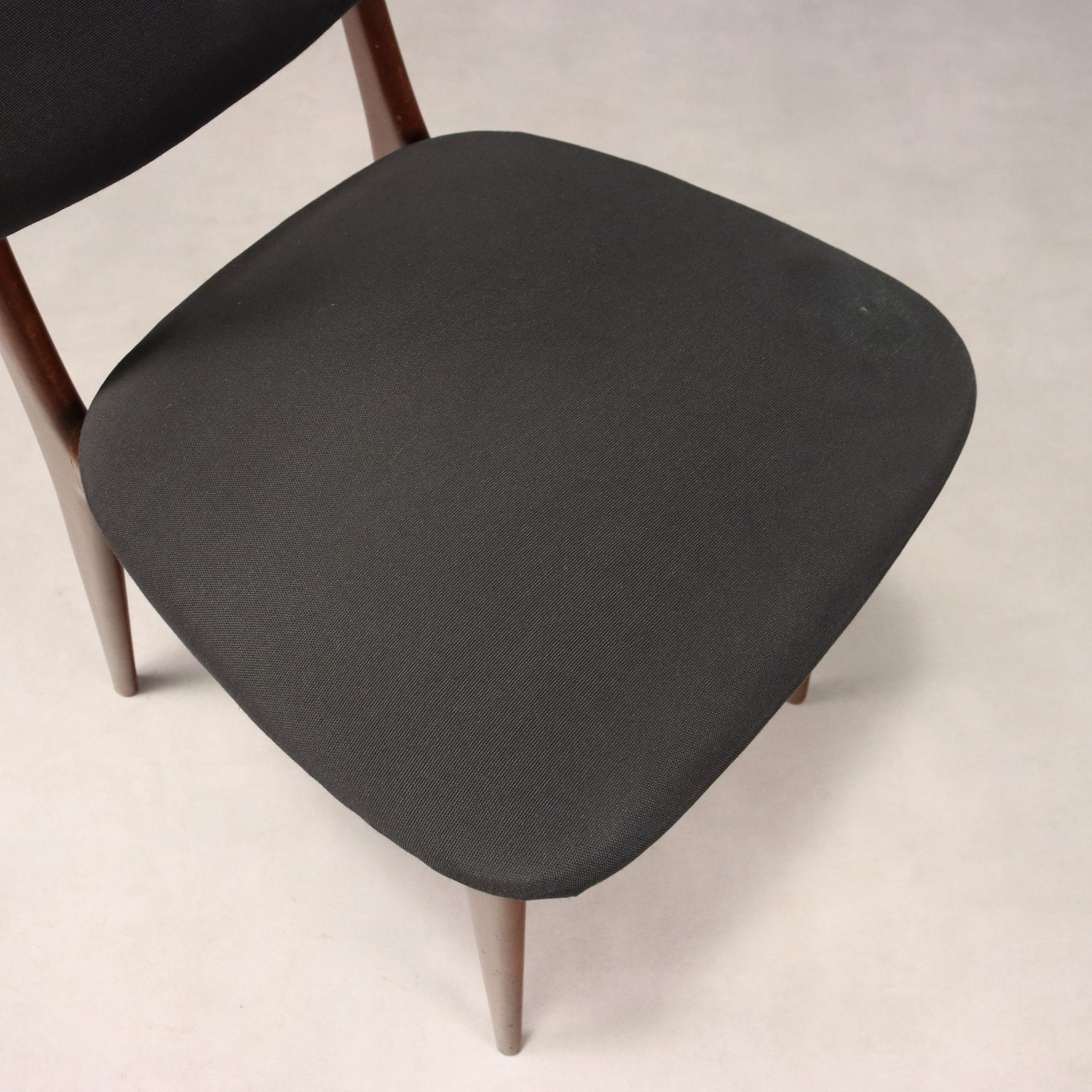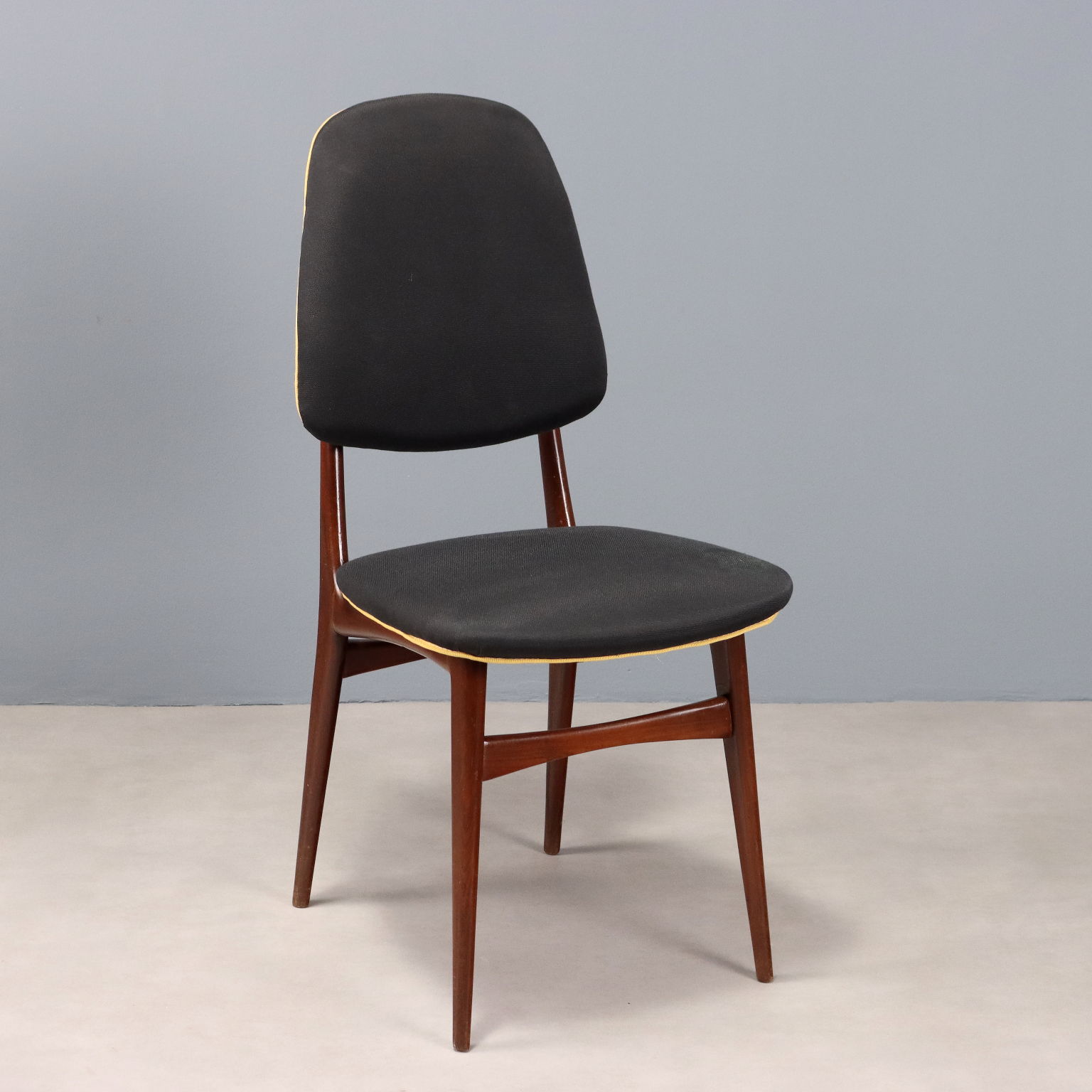 Chaise de salle à manger vintage avec structure en bois, assise et dossier avec rembourrage en mousse et revêtement en tissu gris.