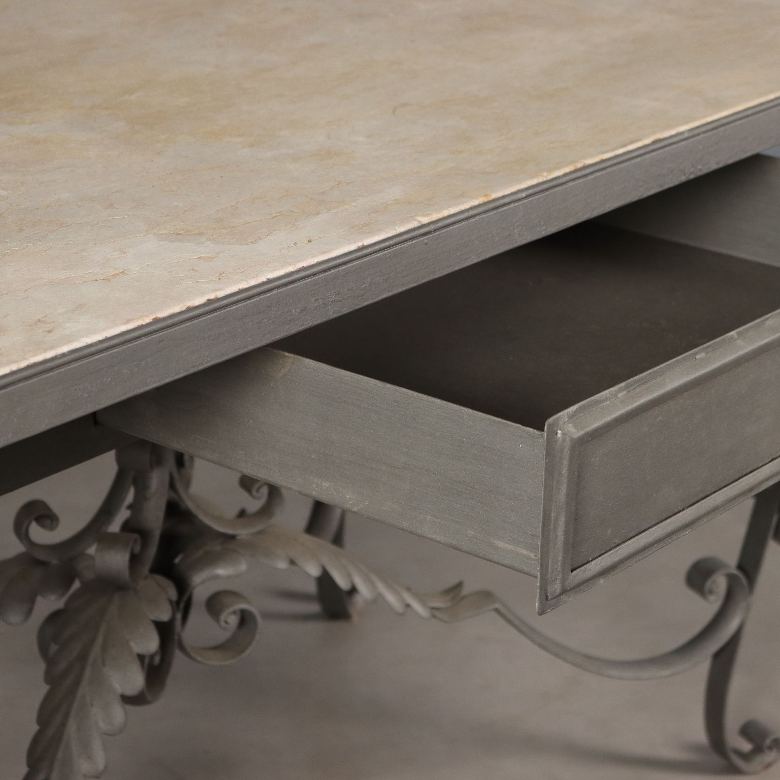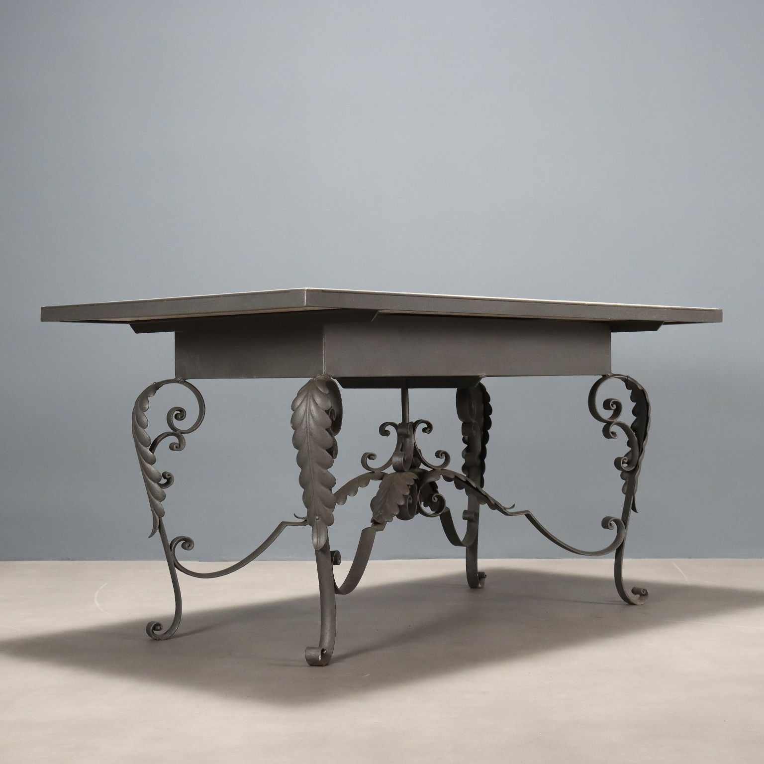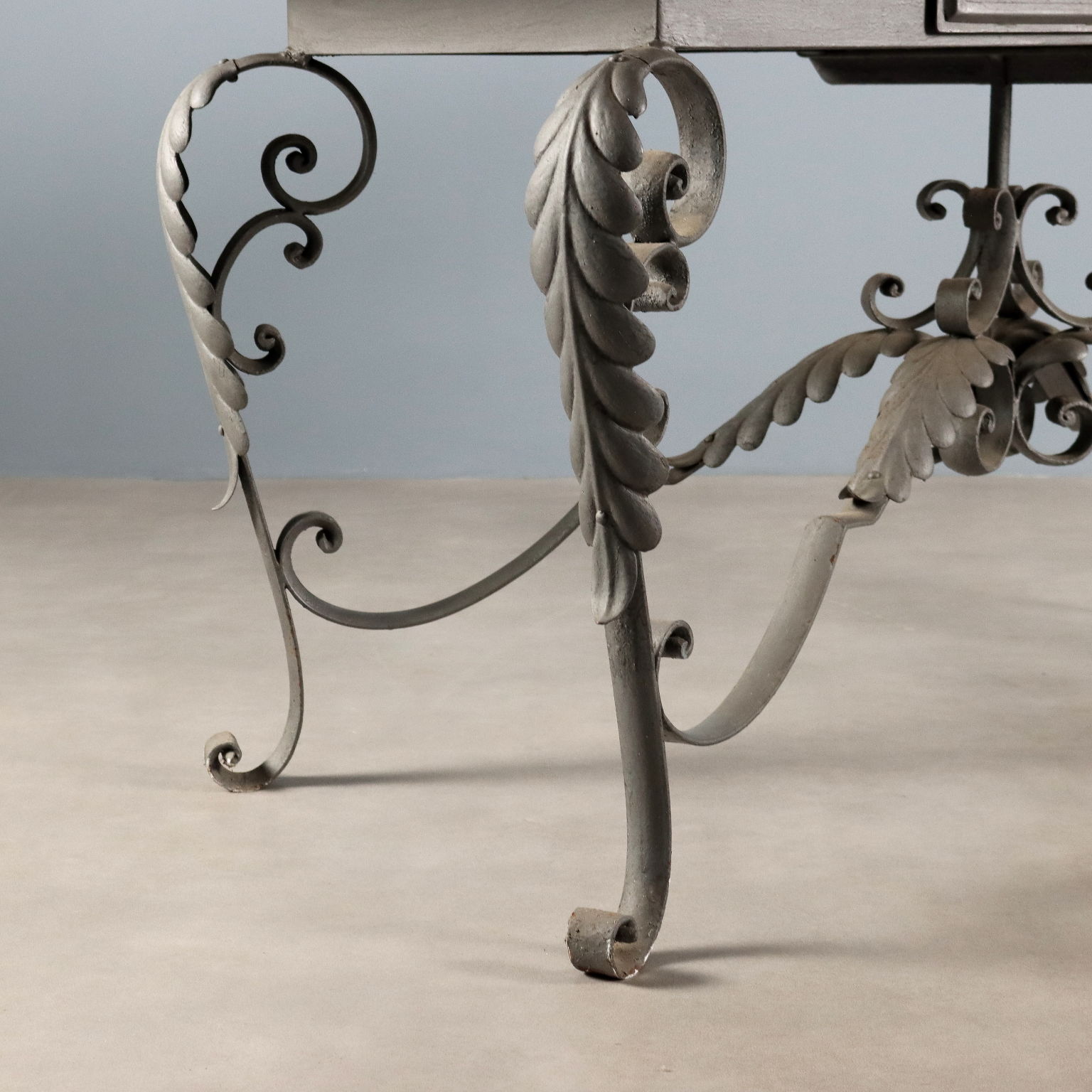 Table en fer avec plateau en marbre, soutenue par quatre pieds courbés fixés à un piètement cruciforme. Structure en fer ornée de volutes, de feuilles et d'un panache central. Italie, XXe siècle.