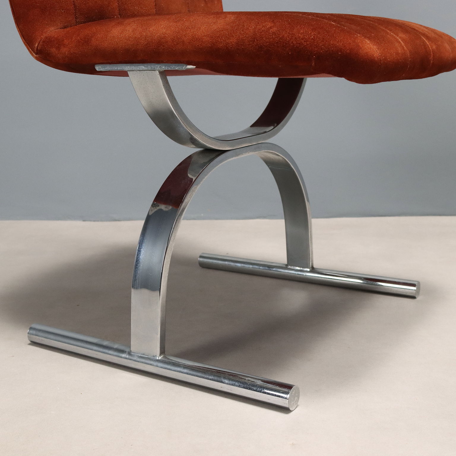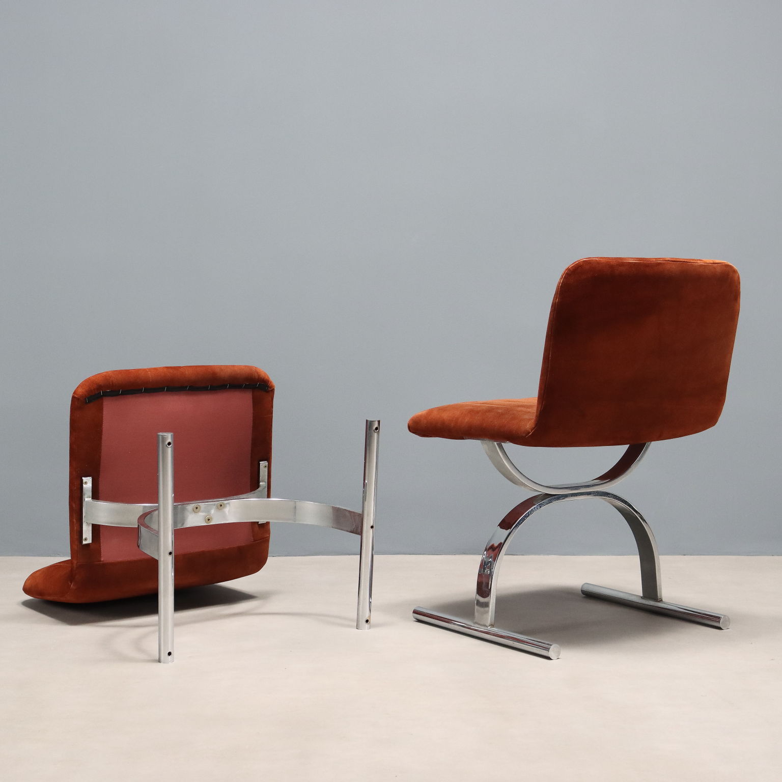 Ensemble de fauteuils vintage avec base en métal chromé arqué, assise et dossier avec rembourrage en mousse et revêtement en tissu d'époque d'origine dans les tons brique.