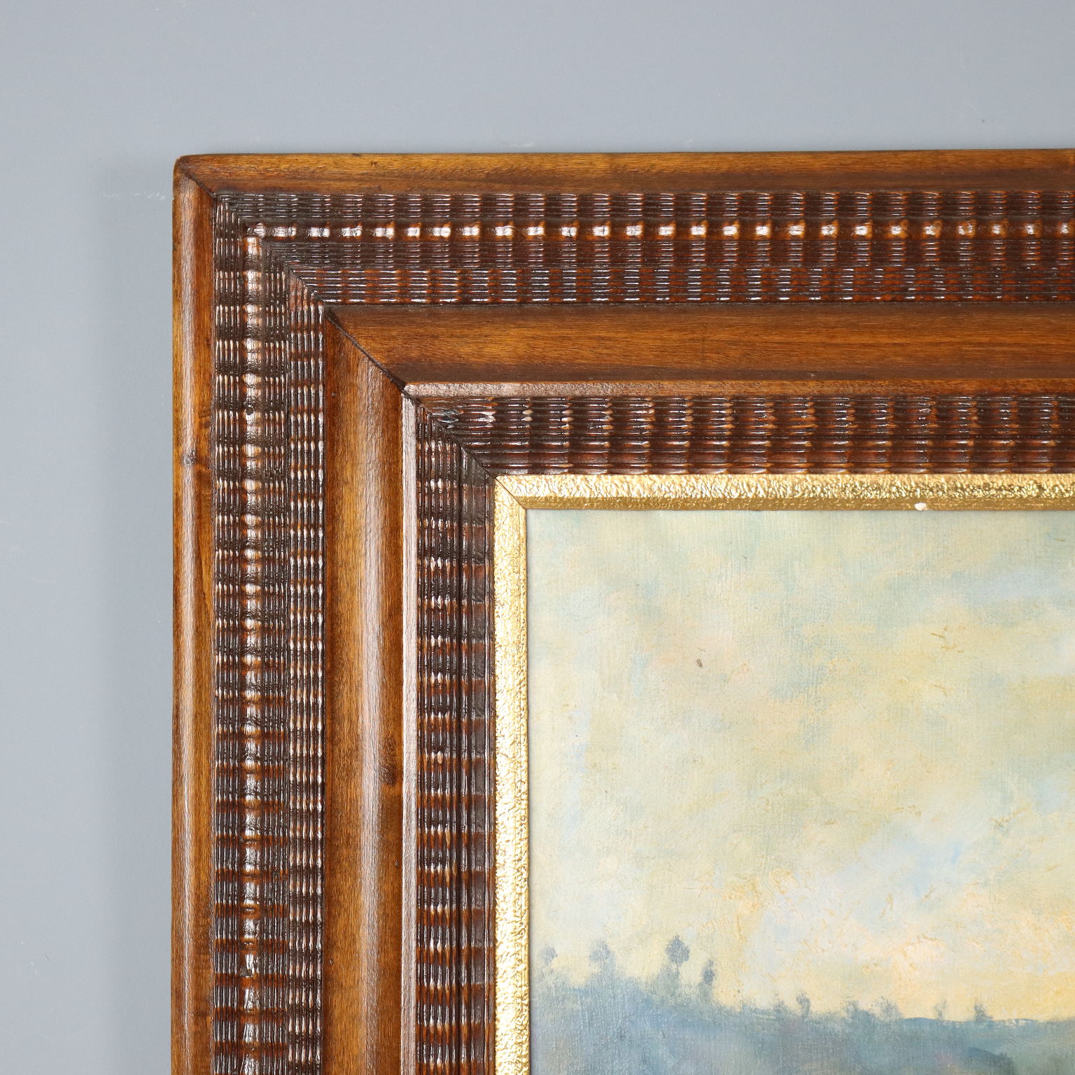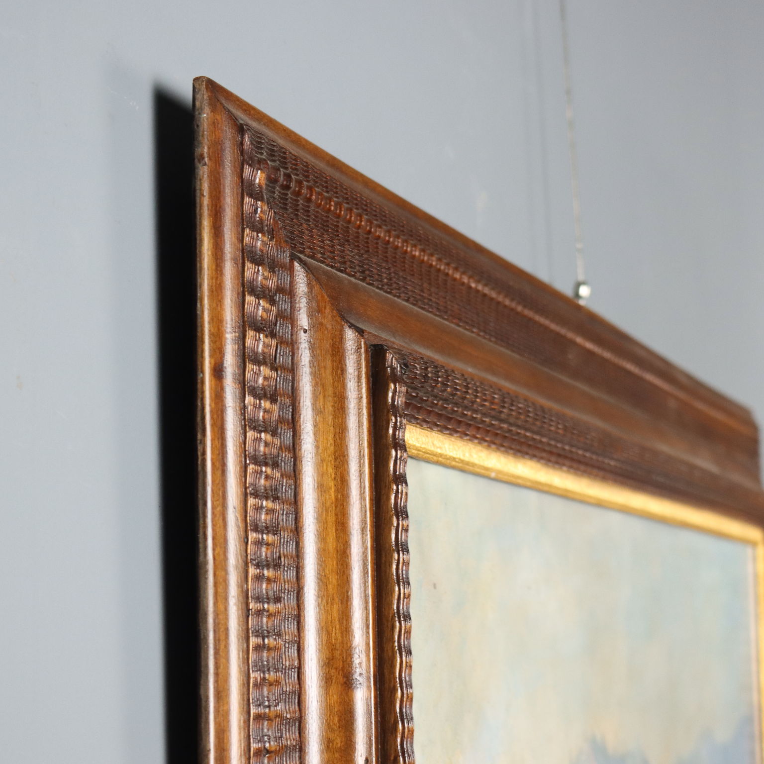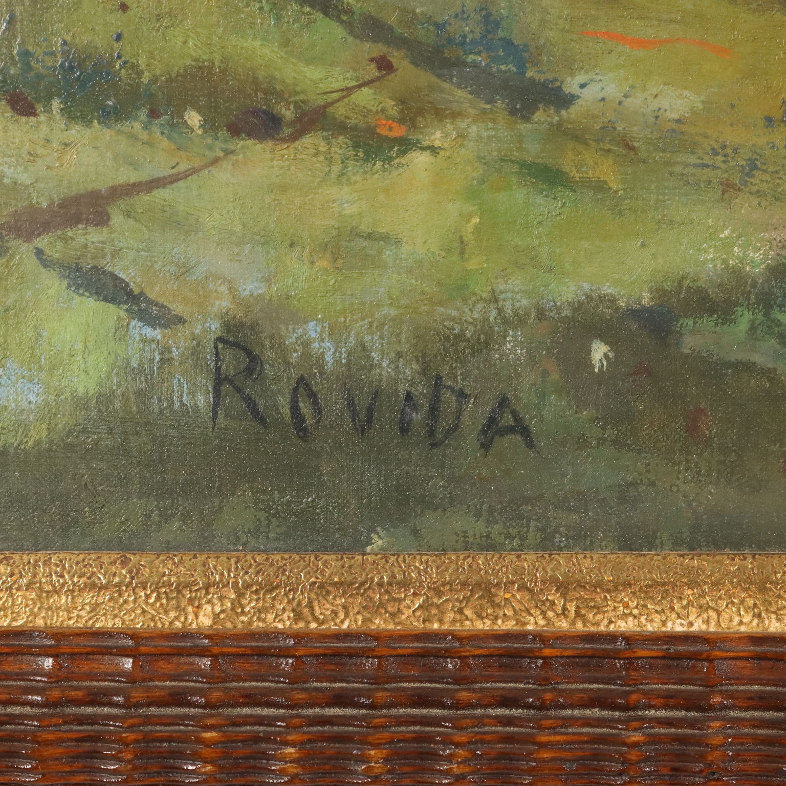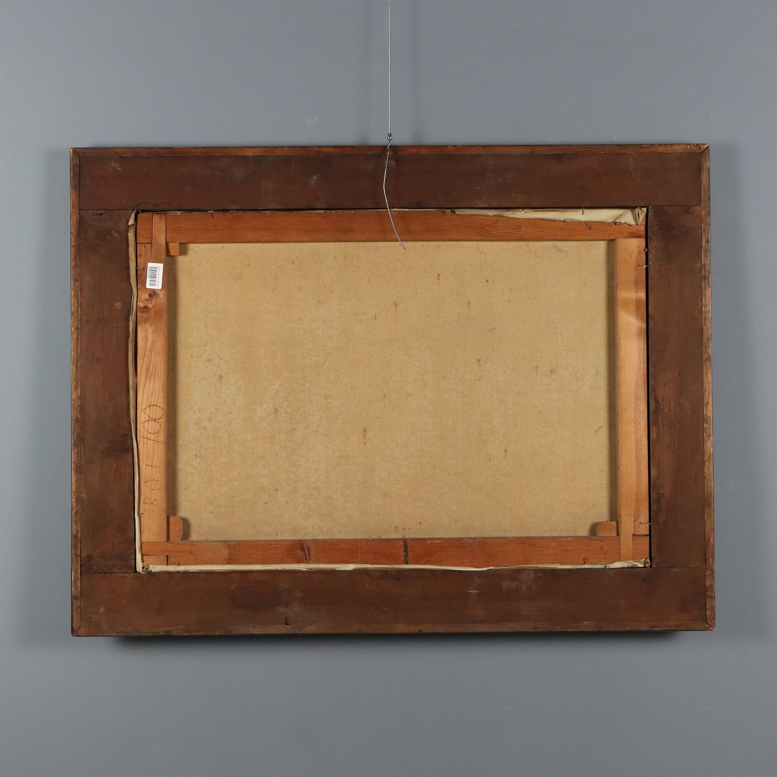 Huile sur toile. Signée en bas à gauche. On dispose de peu d'informations biographiques sur Angelo Rovida, peintre paysagiste originaire de Lodi, qui a peint des paysages et des vues urbaines, principalement dans le nord de l'Italie. Le tableau est présenté dans un cadre guilloché contemporain.
