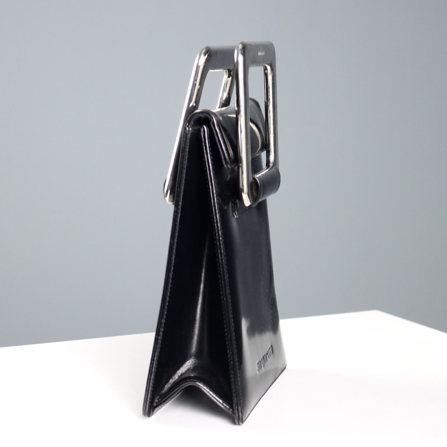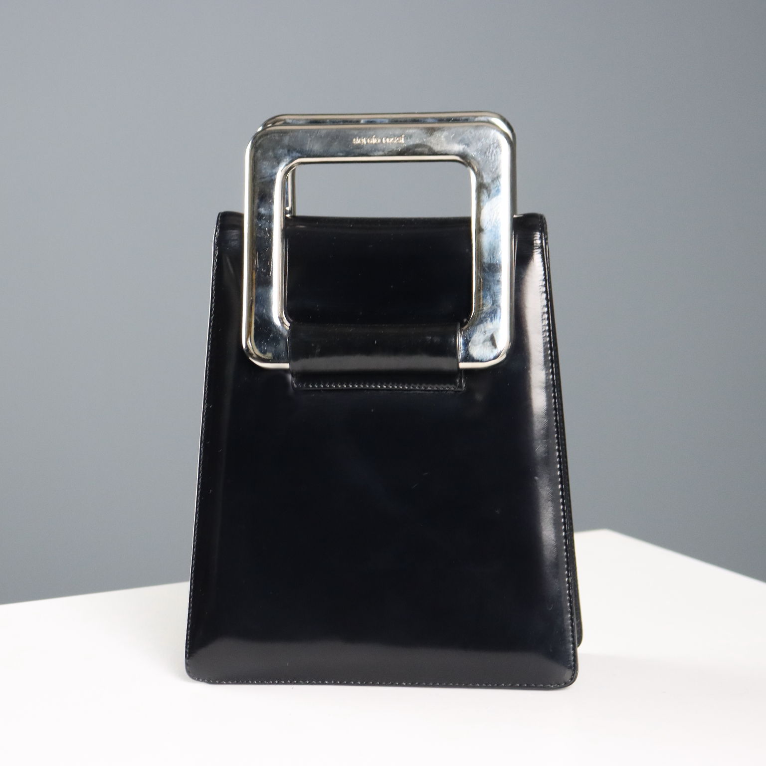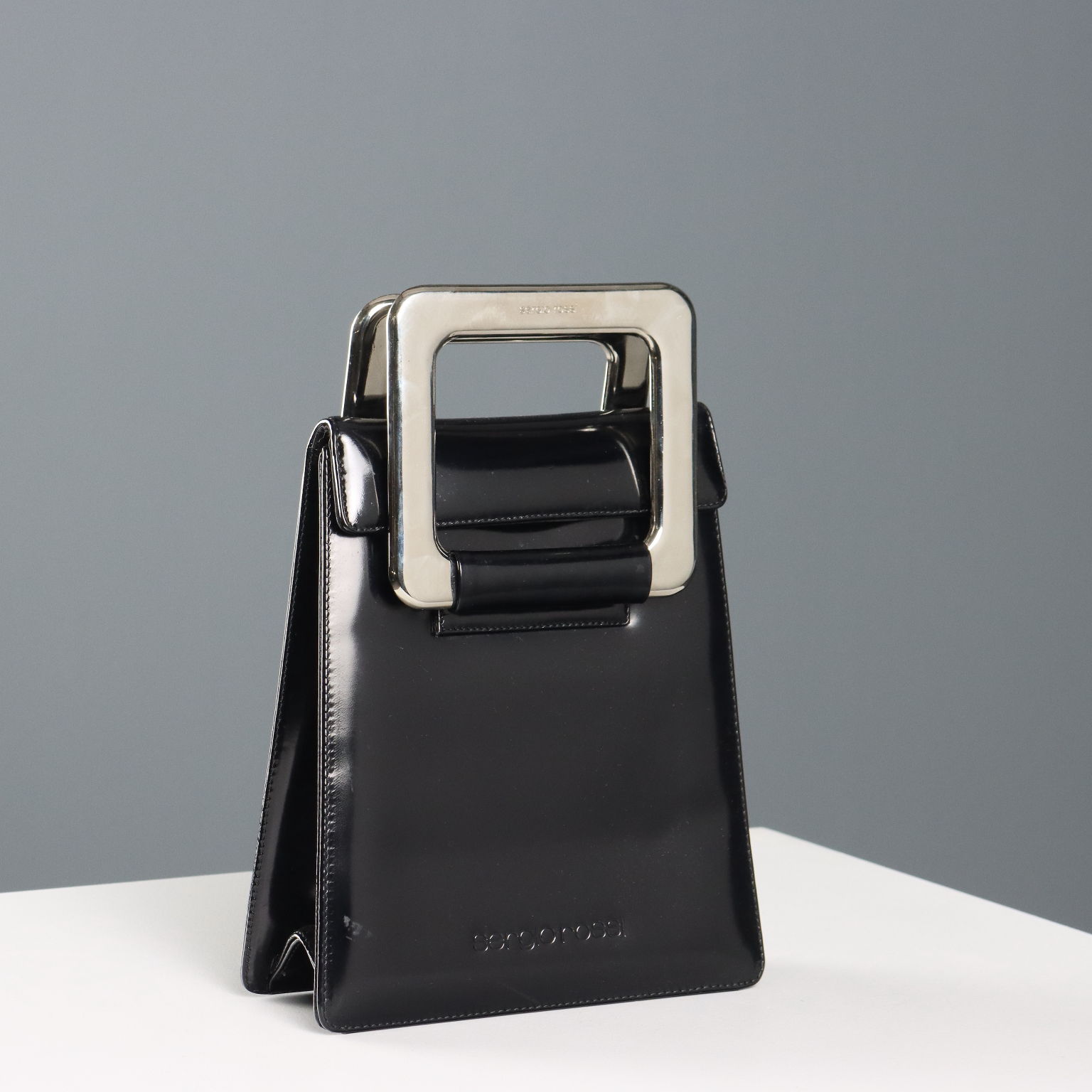 Sac original en cuir verni noir, de forme trapézoïdale, avec de belles poignées carrées en métal et un logo. Fermeture à pression, intérieur doublé avec poche. Article en très bon état, avec quelques légères imperfections sur le cuir.
