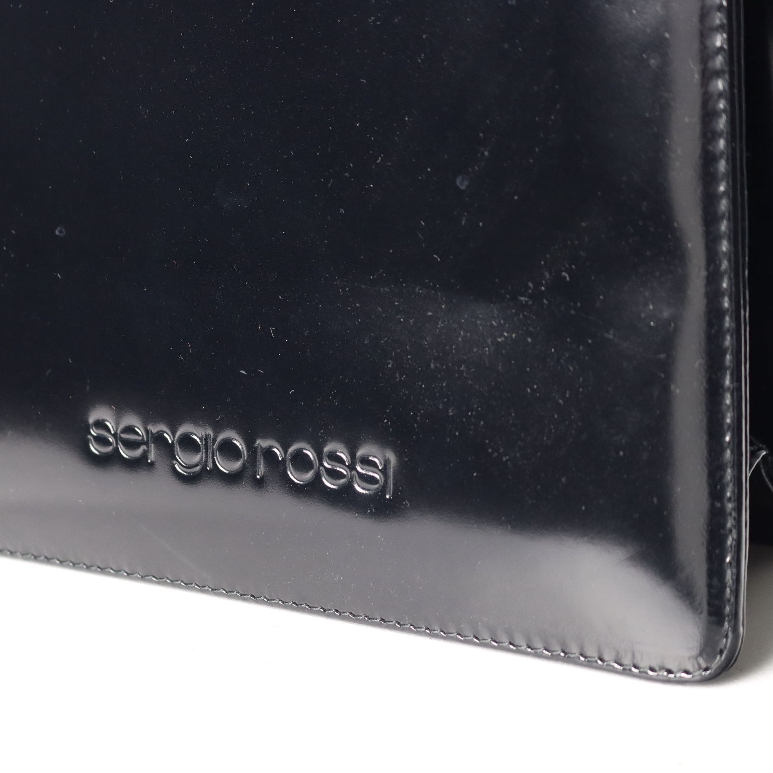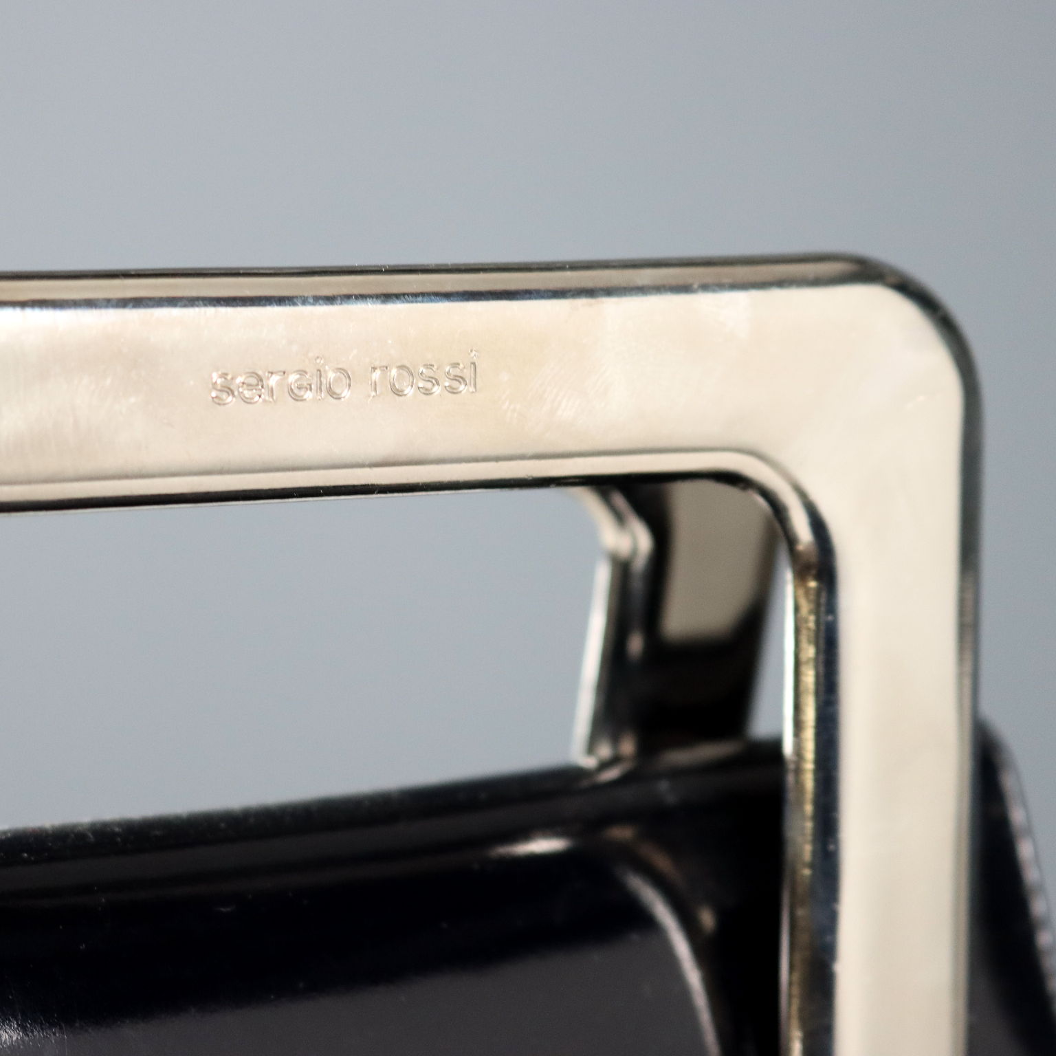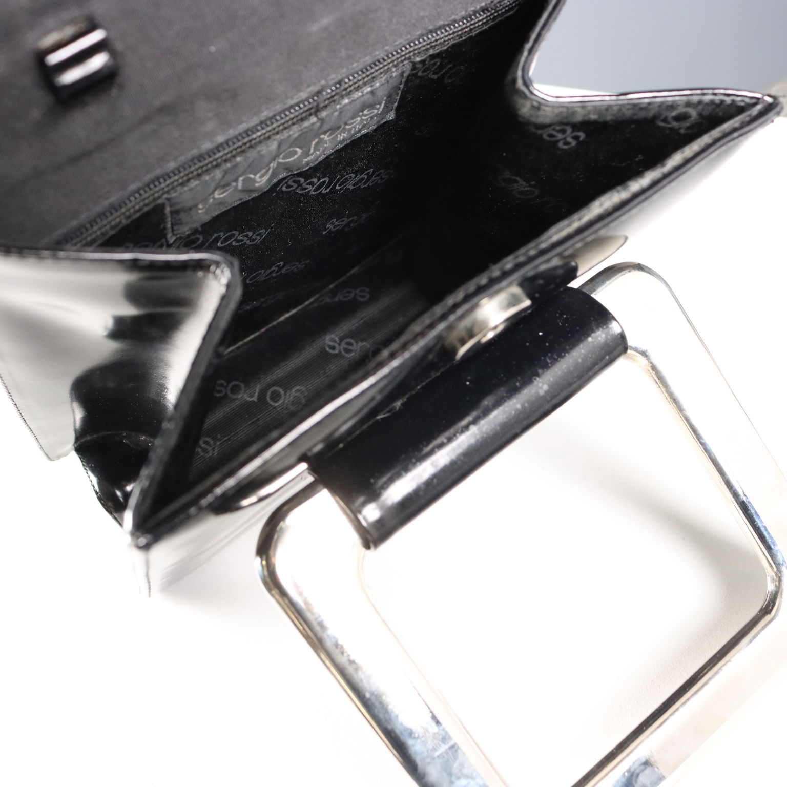 Sac original en cuir verni noir, de forme trapézoïdale, avec de belles poignées carrées en métal et un logo. Fermeture à pression, intérieur doublé avec poche. Article en très bon état, avec quelques légères imperfections sur le cuir.