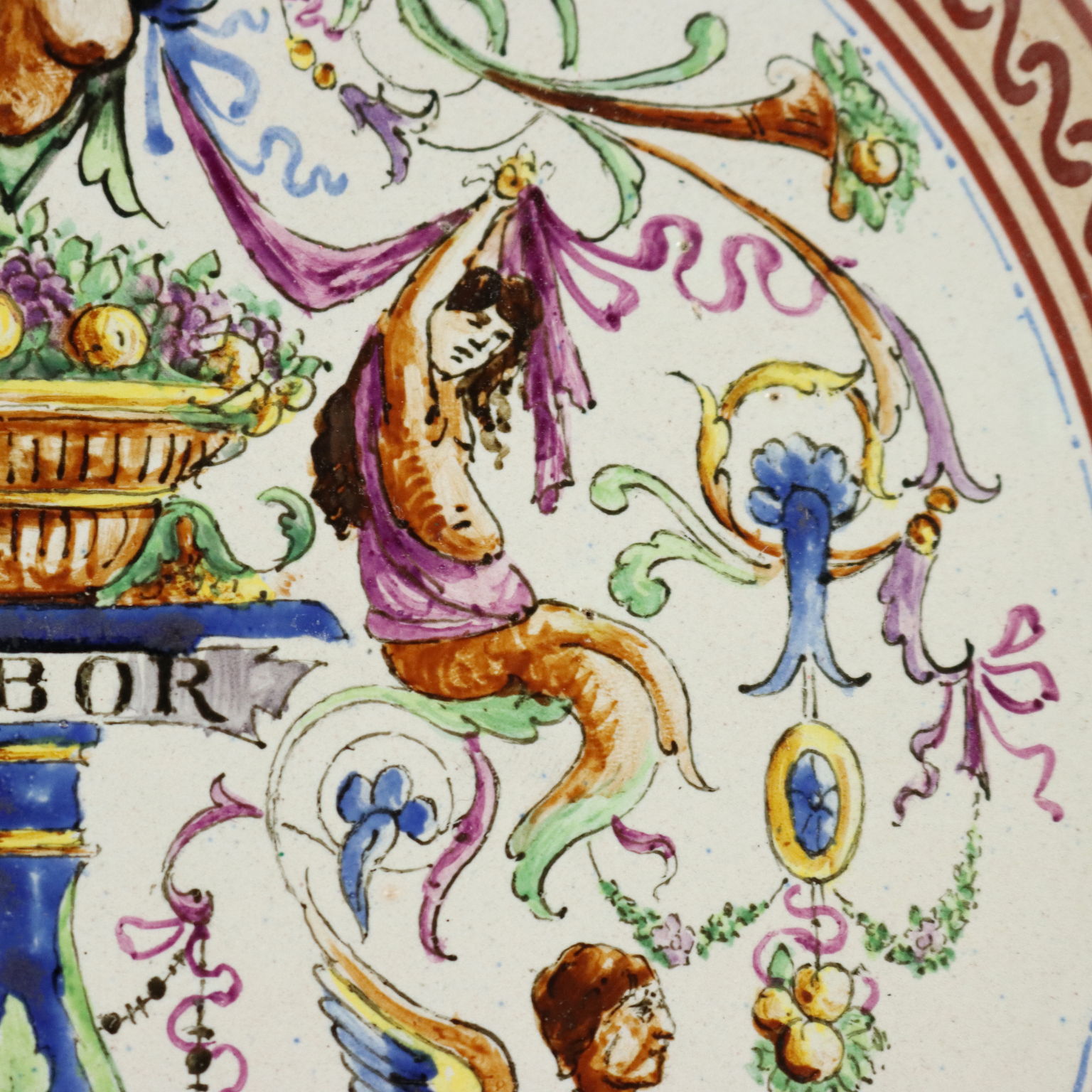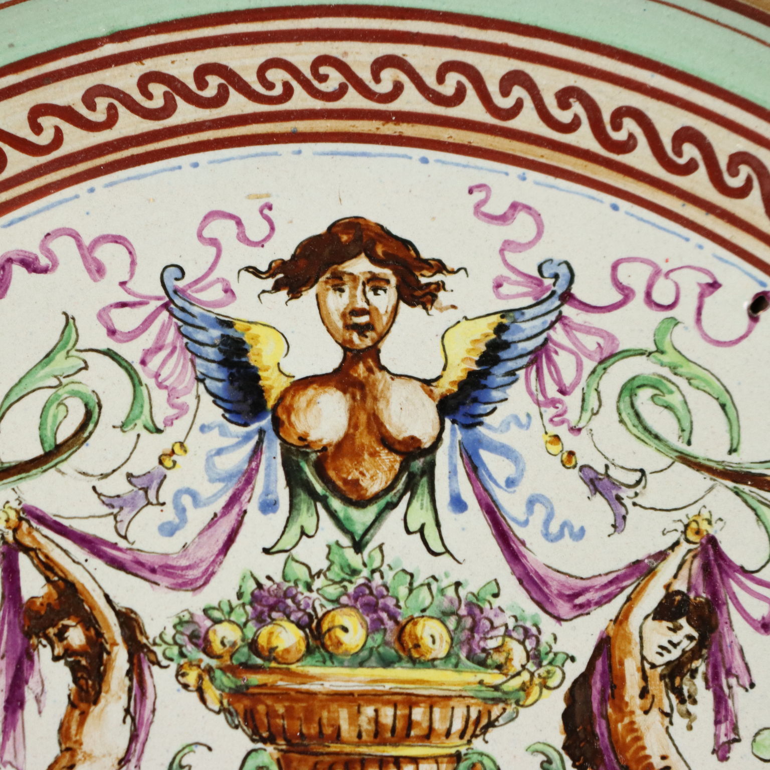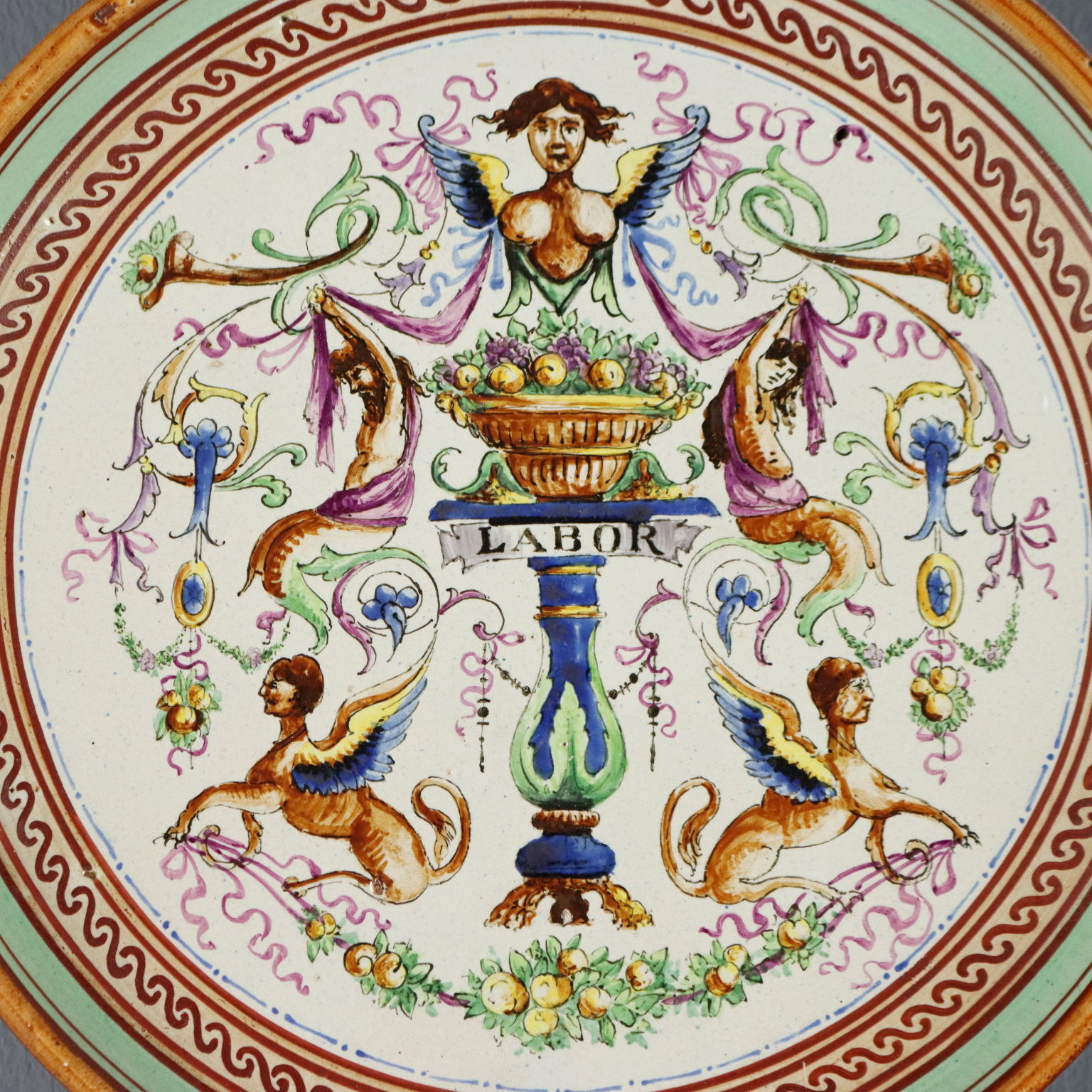 Assiette en majolique à décor raphaélien polychrome, ornée d'un grand vase à fruits au centre, soutenu par une colonne à cartouche et entouré de figures mythologiques. L'assiette porte une date manuscrite au dos, indiquant 1920, ainsi que deux lettres manuscrites « G » et « P », probablement les initiales du céramiste non identifié. Italie centrale, région Toscane-Marches.