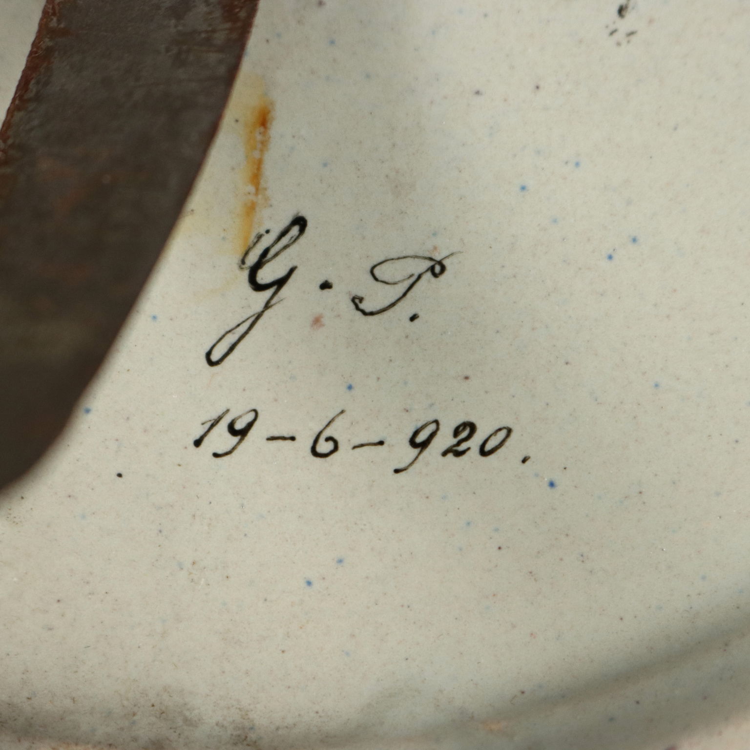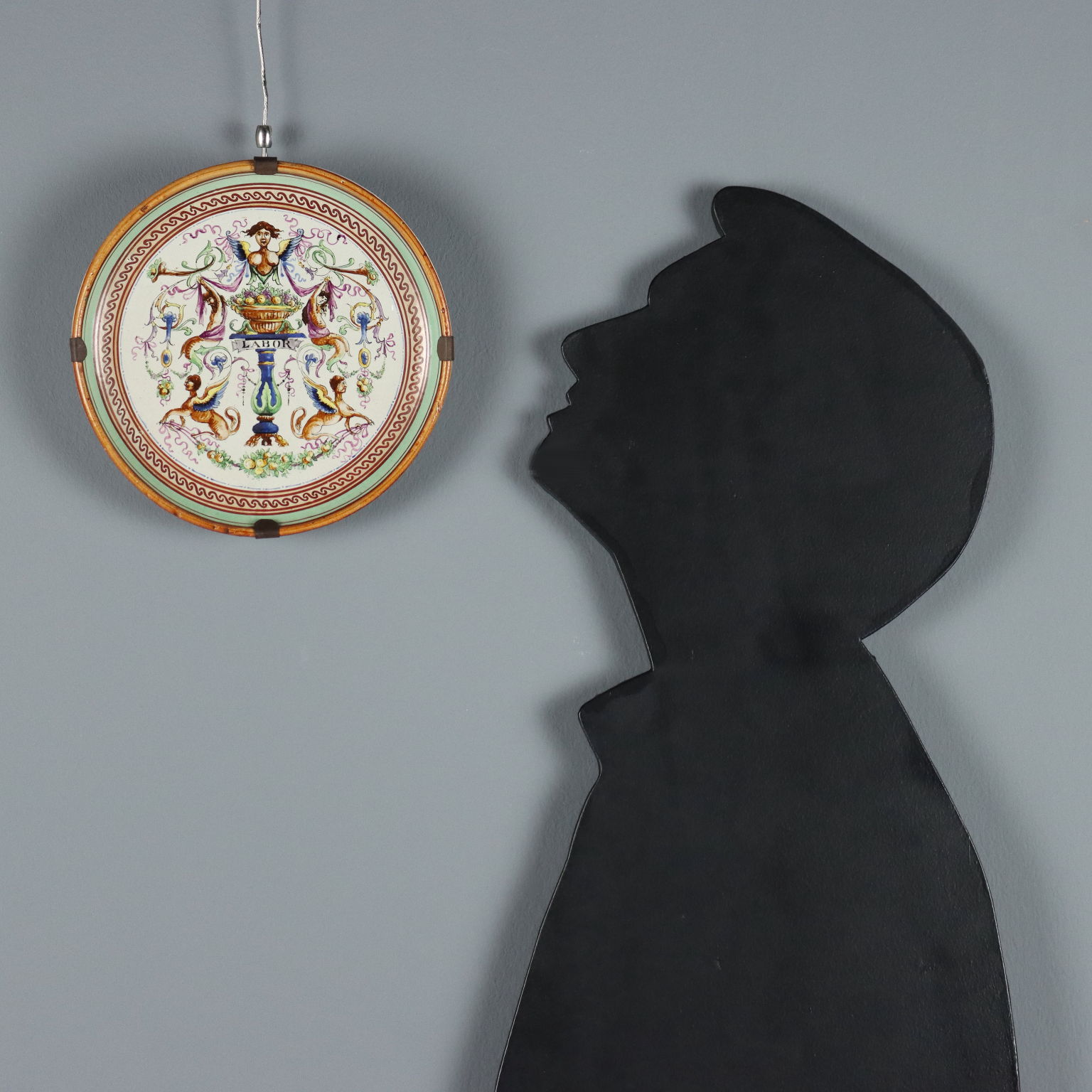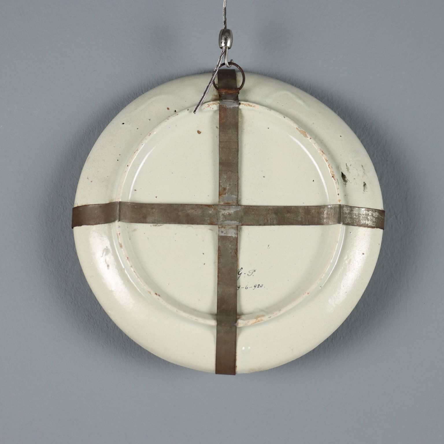 Assiette en majolique à décor raphaélien polychrome, ornée d'un grand vase à fruits au centre, soutenu par une colonne à cartouche et entouré de figures mythologiques. L'assiette porte une date manuscrite au dos, indiquant 1920, ainsi que deux lettres manuscrites « G » et « P », probablement les initiales du céramiste non identifié. Italie centrale, région Toscane-Marches.