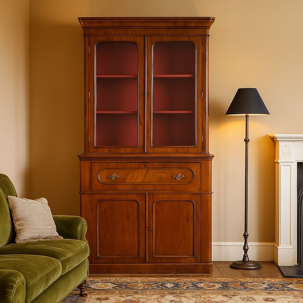 Bibliothèque victorienne en acajou. Dessus vitré avec deux étagères intérieures, un tiroir central rabattable dissimulant un secrétaire avec empiècement en cuir, sept tiroirs et compartiments ouverts. Deux portes à panneaux à la base, fond en sapin. Angleterre, deuxième quart du XIXe siècle.
