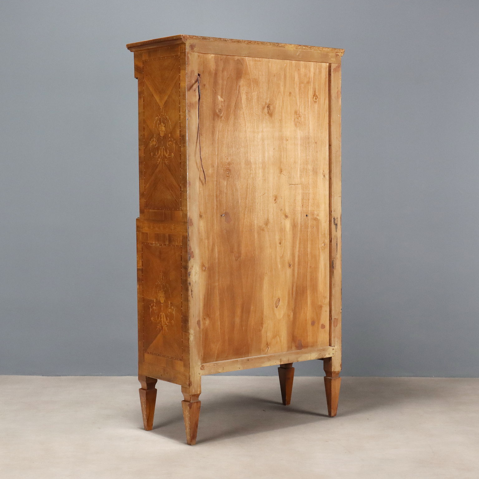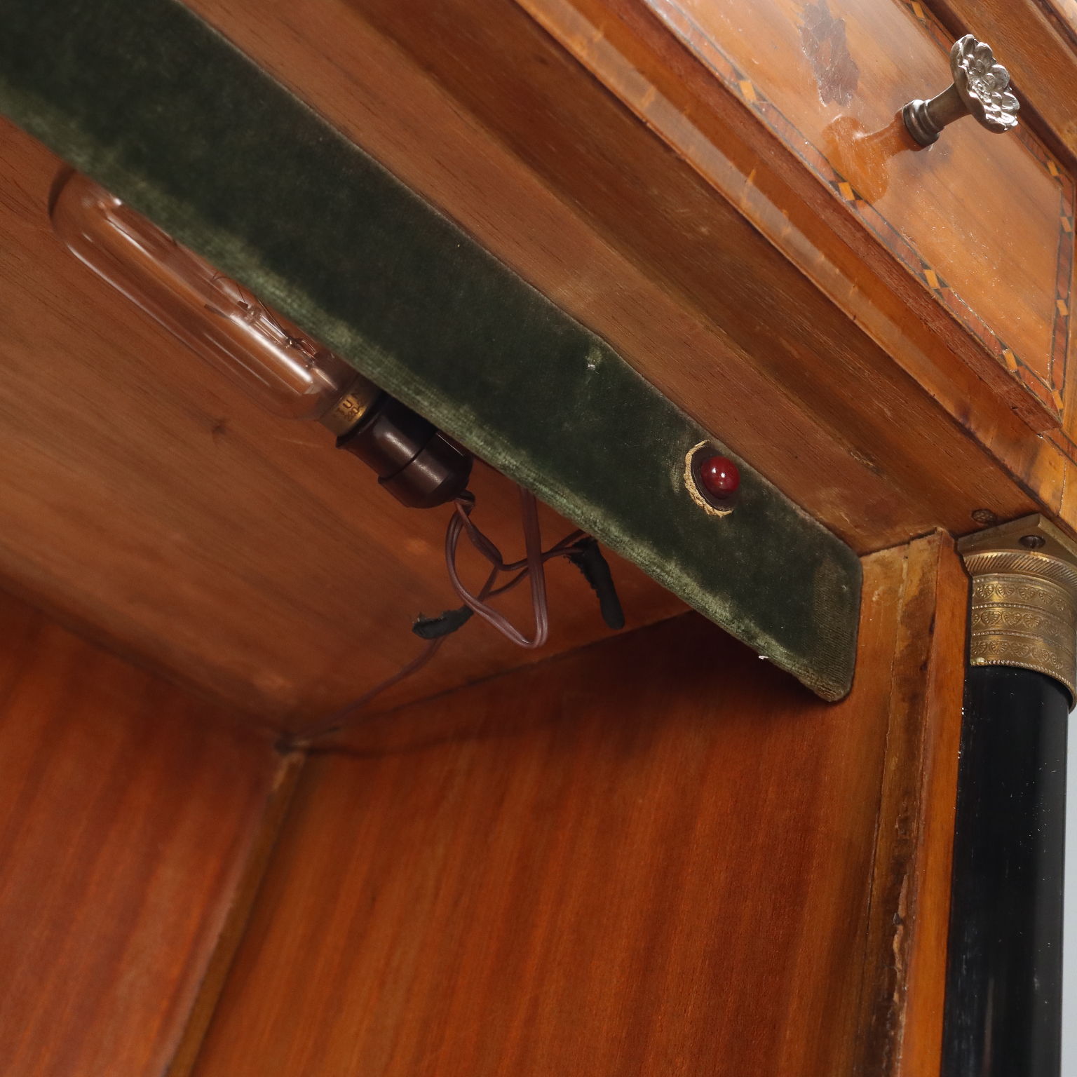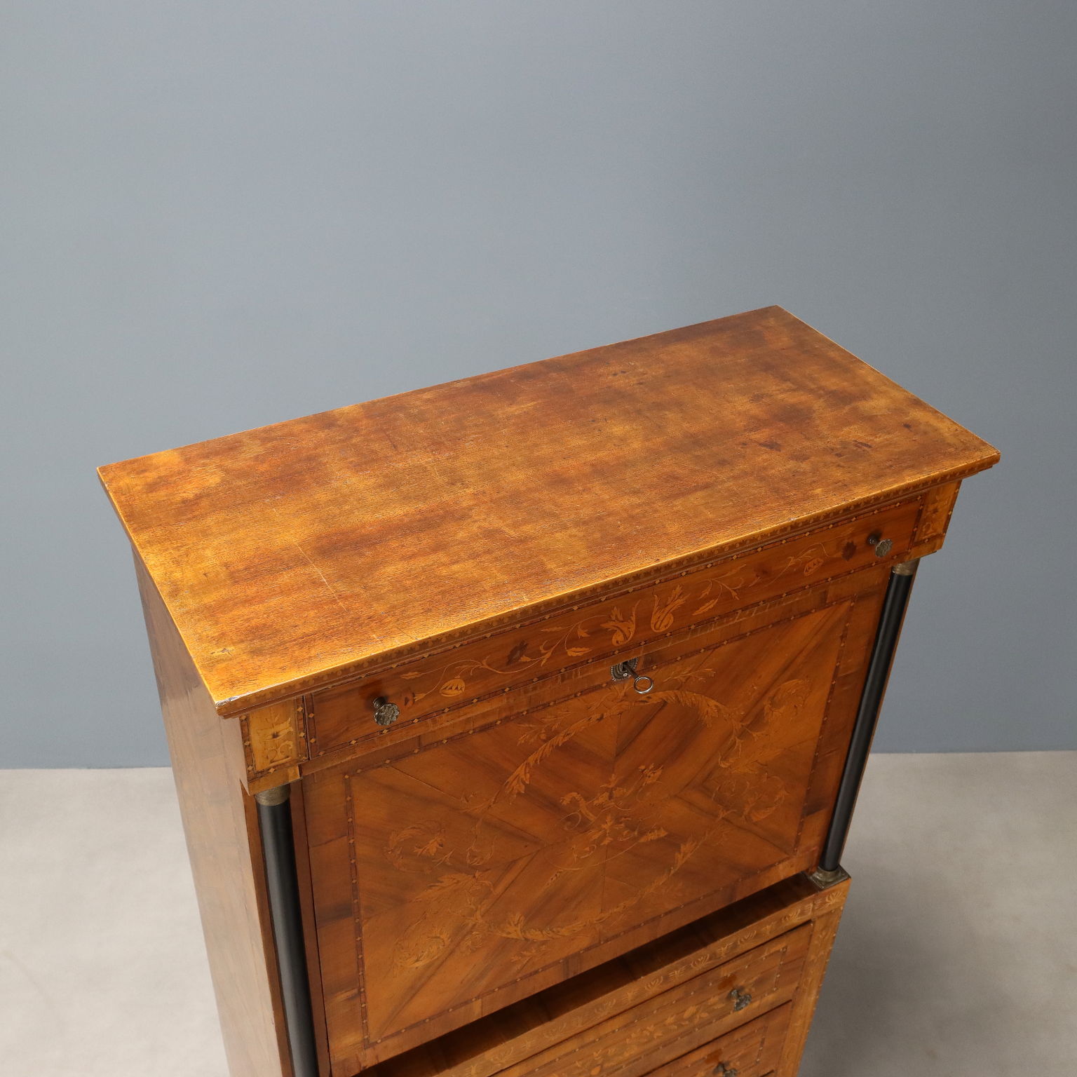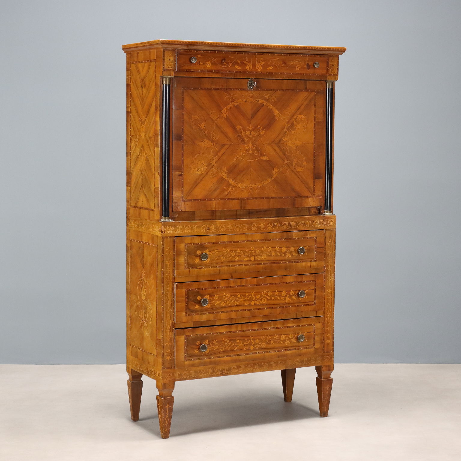 Secrétaire en style Empire, placage de noyer. Marqueterie florale et feuillagée en érable, façade à trois tiroirs surmontée d'une porte abattante dissimulant un compartiment ouvert. Demi-colonnes tournées et noircies, tiroir en saillie dans la bande sous le comptoir et pieds pyramidaux tronqués. Italie, XXe siècle.