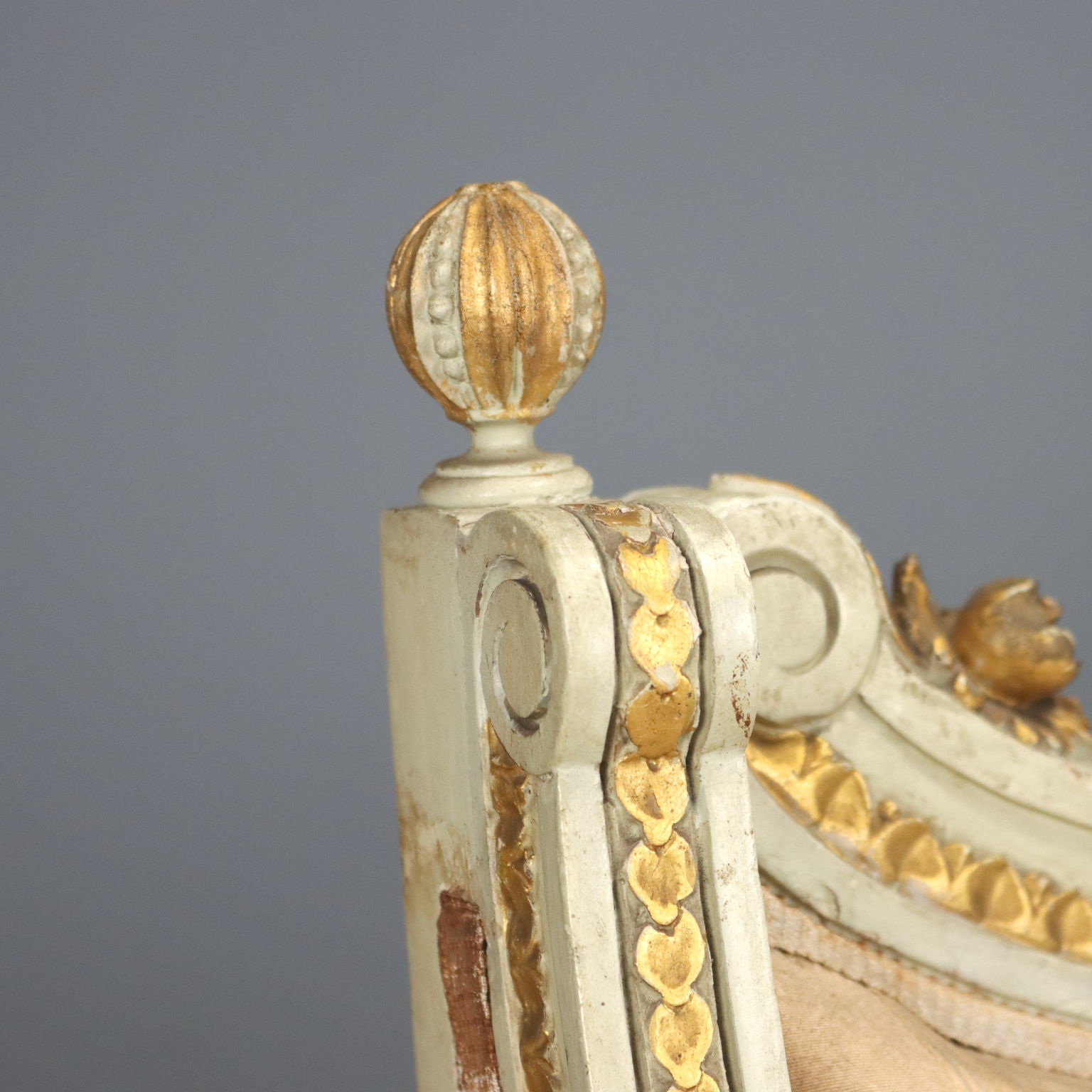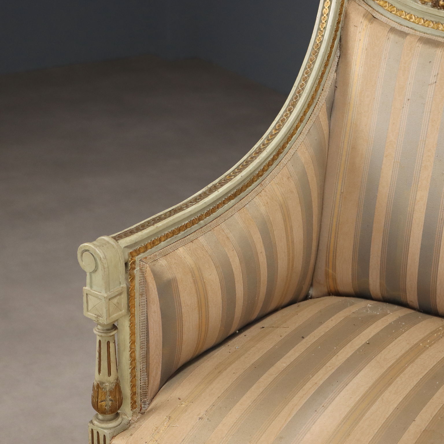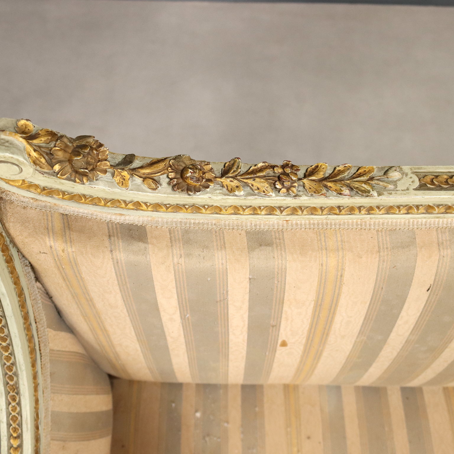 Canapé en bois laqué de style néoclassique. Sculptures florales et moulures dorées, pieds tournés et sculptés, dossier, accoudoirs et assise rembourrés. Italie, fin du XIXe siècle.