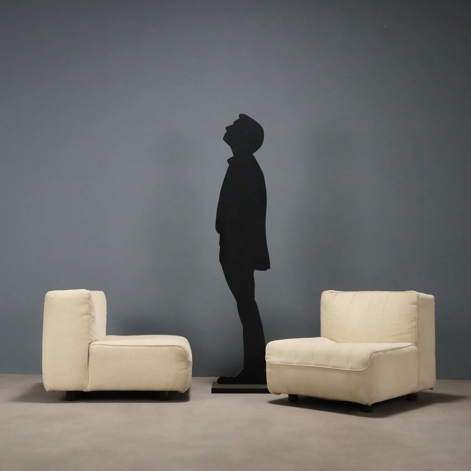 Ensemble de quatre chaises compactes permettant différentes configurations. Conçues par Tito Agnoli en 1969, elles sont dotées d'un rembourrage en mousse et d'un revêtement en tissu d'époque d'origine dans les tons crème. Elles présentent des signes d'usure, comme le montre la photo.