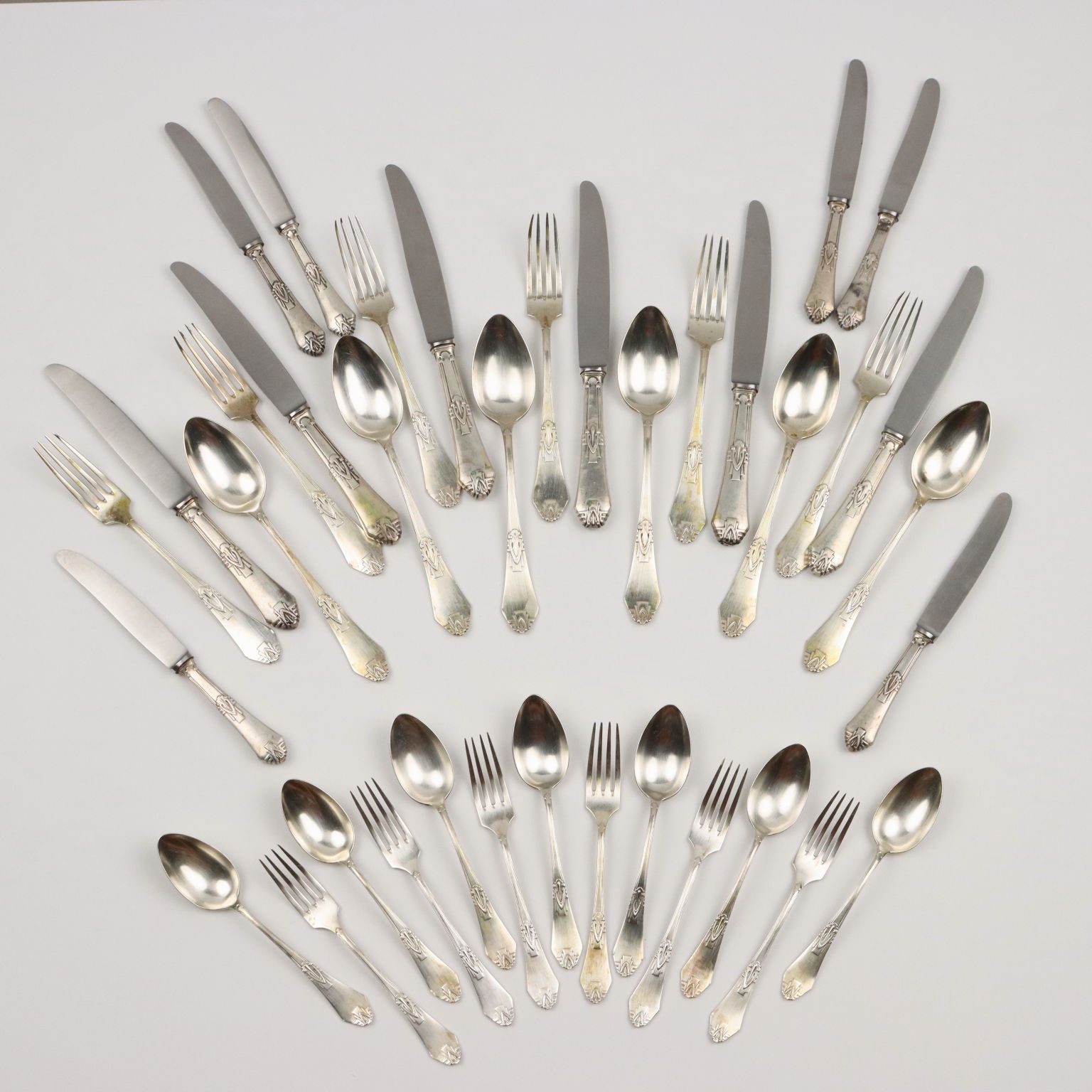 Ménagère en argent pour six personnes, ornée d'un motif Art Nouveau en relief. L'ensemble comprend 36 pièces. Les poinçons d'argent sont gravés. Poids : 1 230 grammes, hors couteaux.