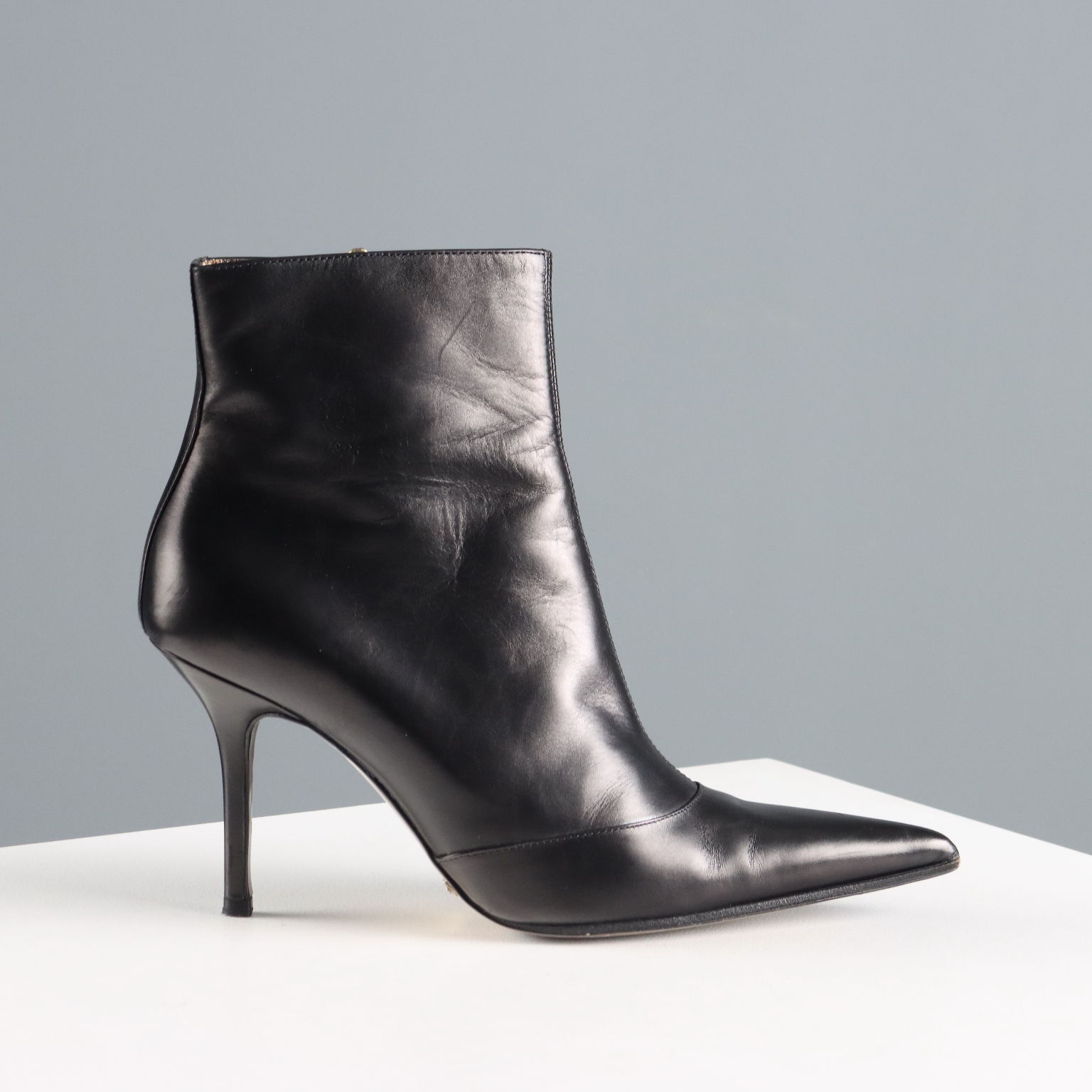 Bottines à bout pointu en cuir de veau noir souple, ornées de surpiqûres élégantes. Zip latéral avec tirette logo en métal doré. Doublure en cuir doré. Talon : 9 cm.